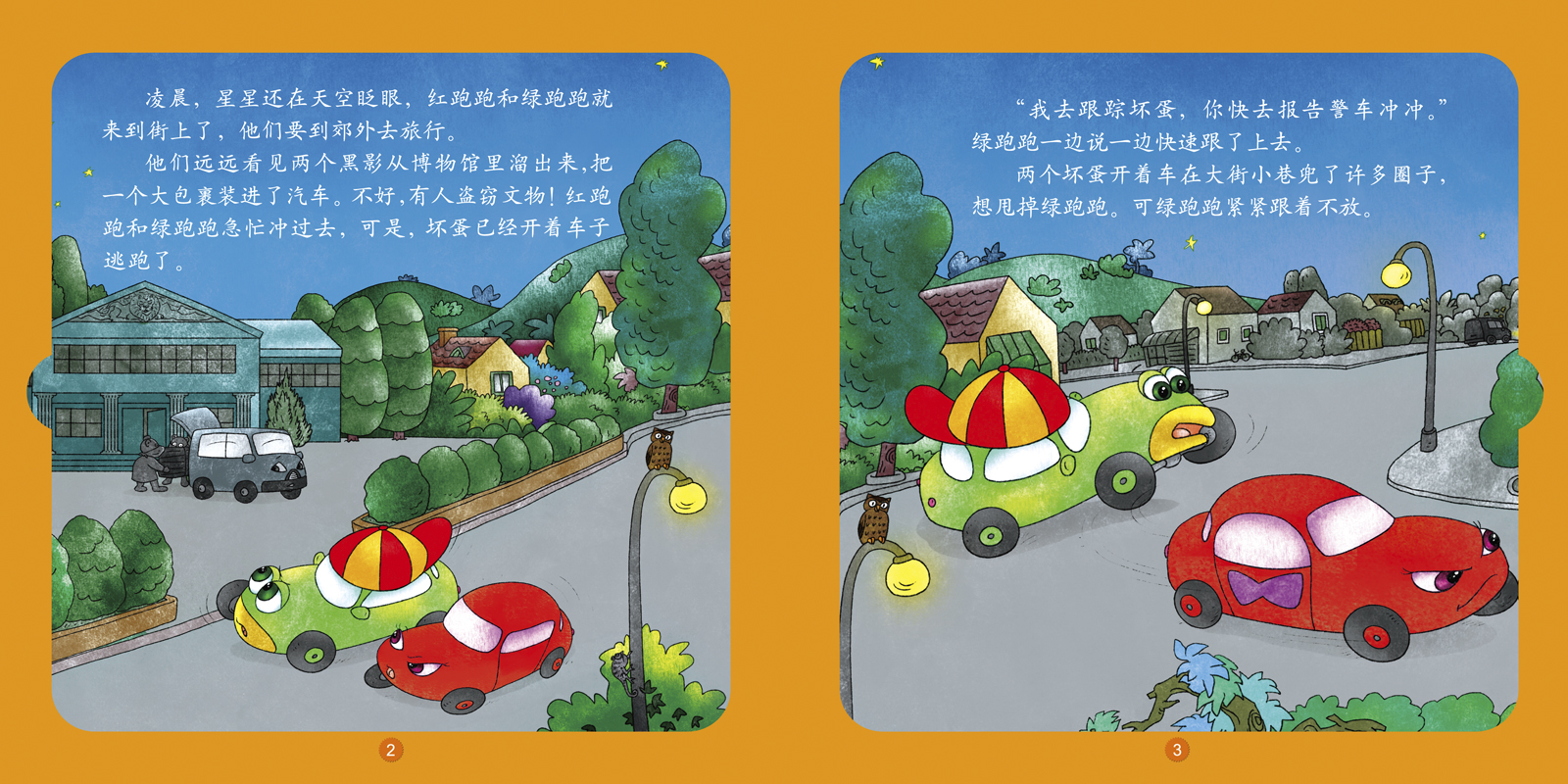 一天凌晨,红跑跑和绿跑跑看到有坏人在盗窃文物。他们赶过去时,坏人开车逃跑了。他们一个跟踪坏人,一个去报告警车冲冲。坏人开车逃入了森林。最终,红跑跑和绿跑跑能在警车冲冲的帮助下成功抓到坏人吗?