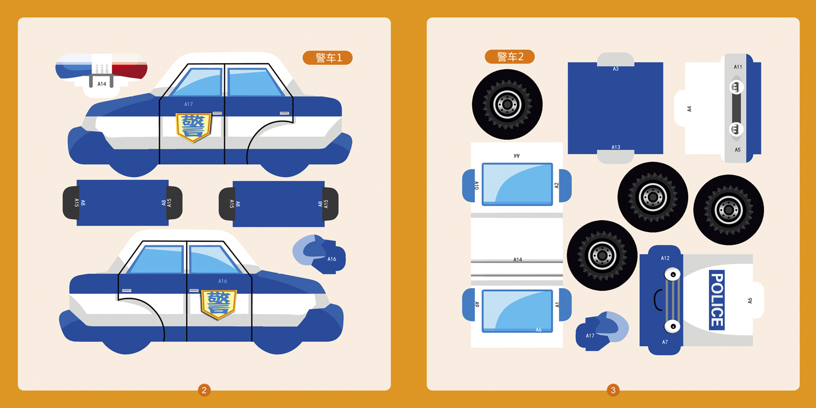 新颖性:采用白卡纸多层对裱设计,抠下手工部分,可以制作成独立的立体汽车,车型多样、消防车、救护车、跑车、吊车……夹层部分是完整的汽车救援故事。