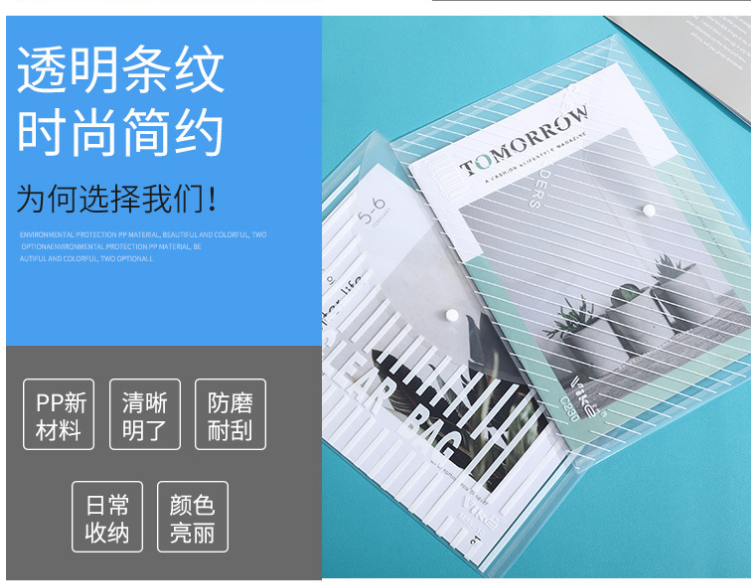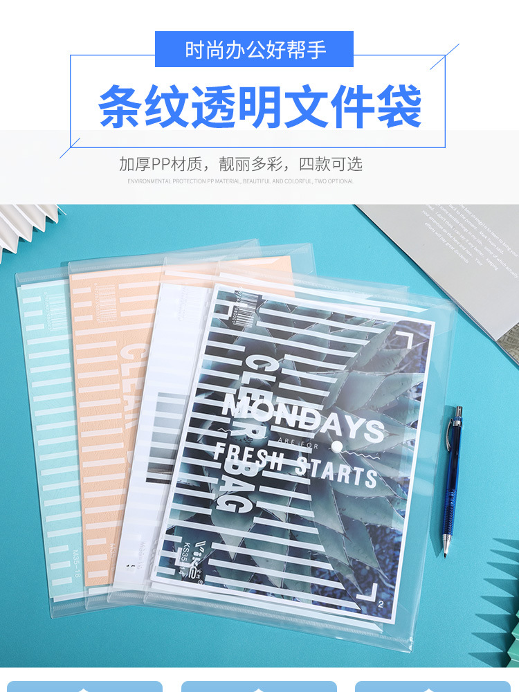 严选 加厚A4按扣文件袋 塑料PP学生透明文件袋办公资料袋14C竖纹白色/个