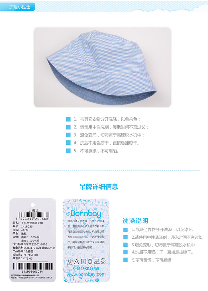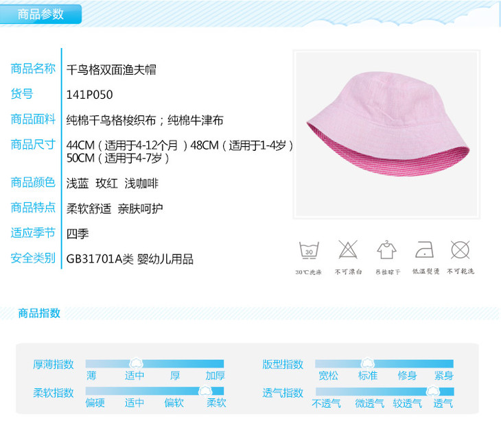 贝贝怡 婴儿帽子 双面可戴宝宝渔夫帽 春夏季透气遮阳帽141P050