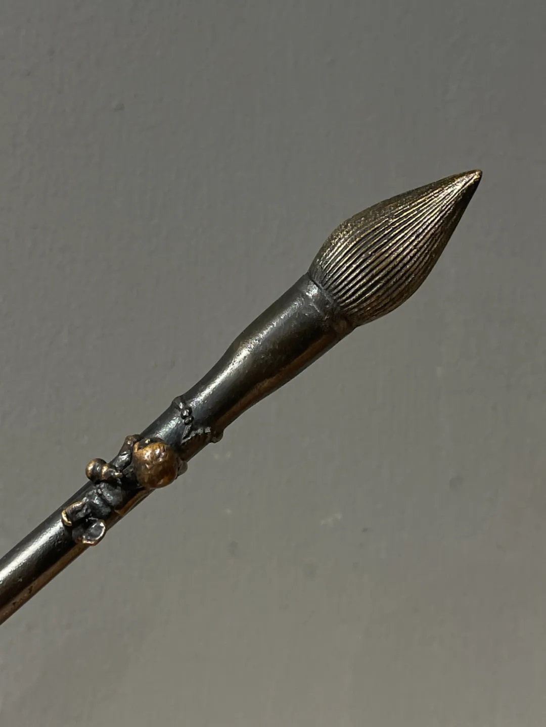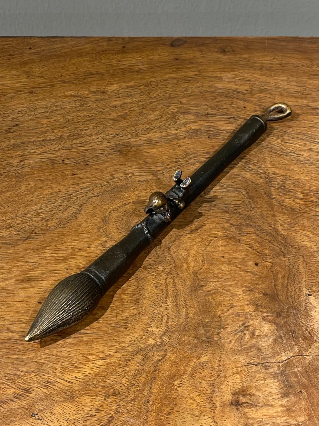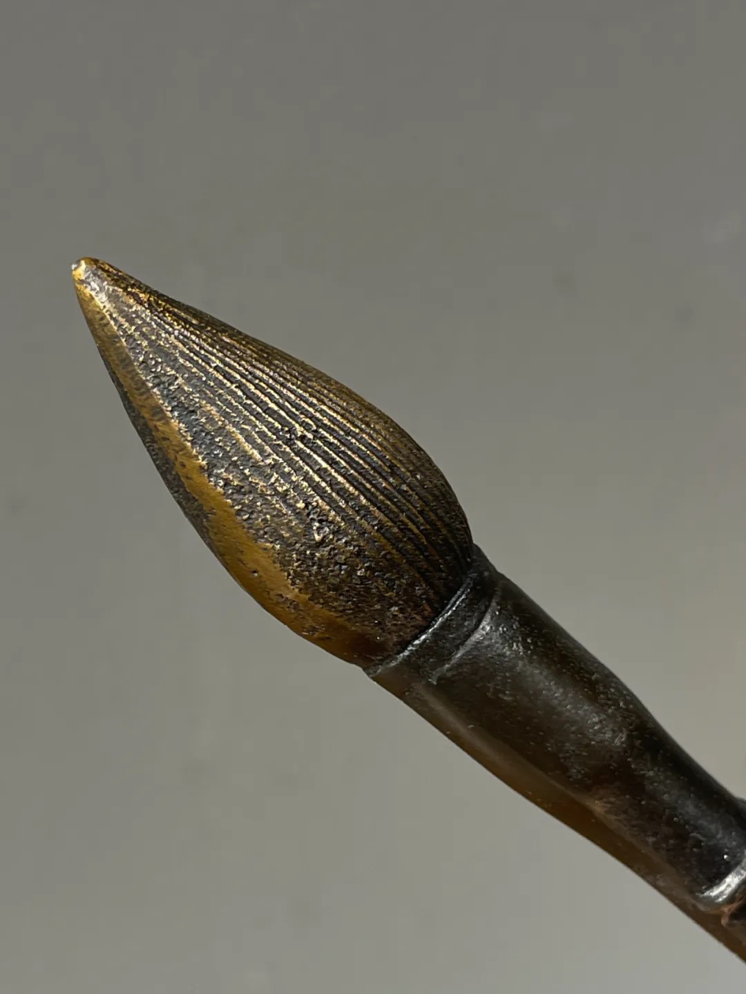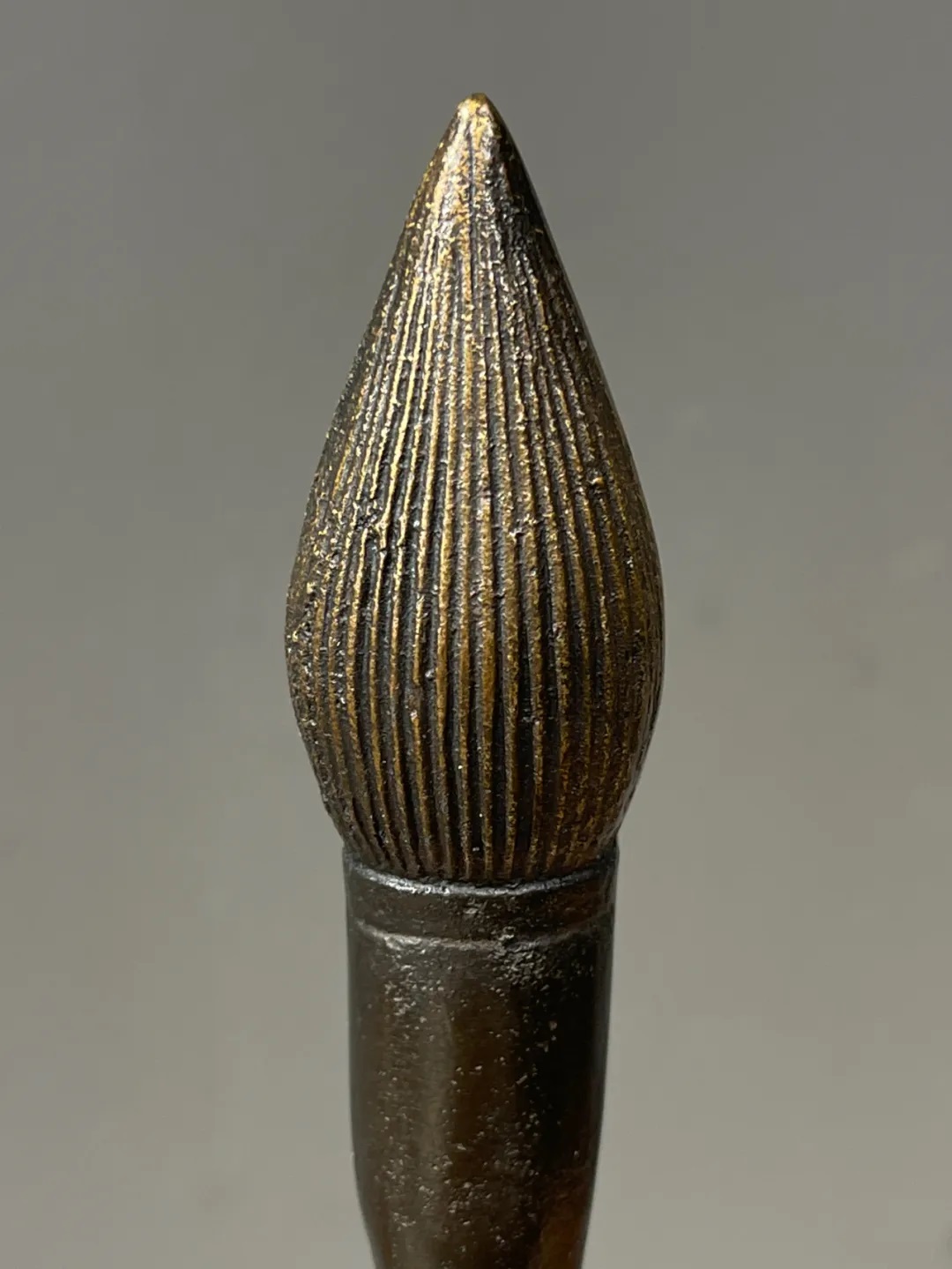 此一毛笔形青铜文房镇纸,造形独特、制作精美、气质高雅、握在手中触感细腻且沉甸压手,老包浆皮壳温润细腻,置于案上当镇纸,文雅贵气。