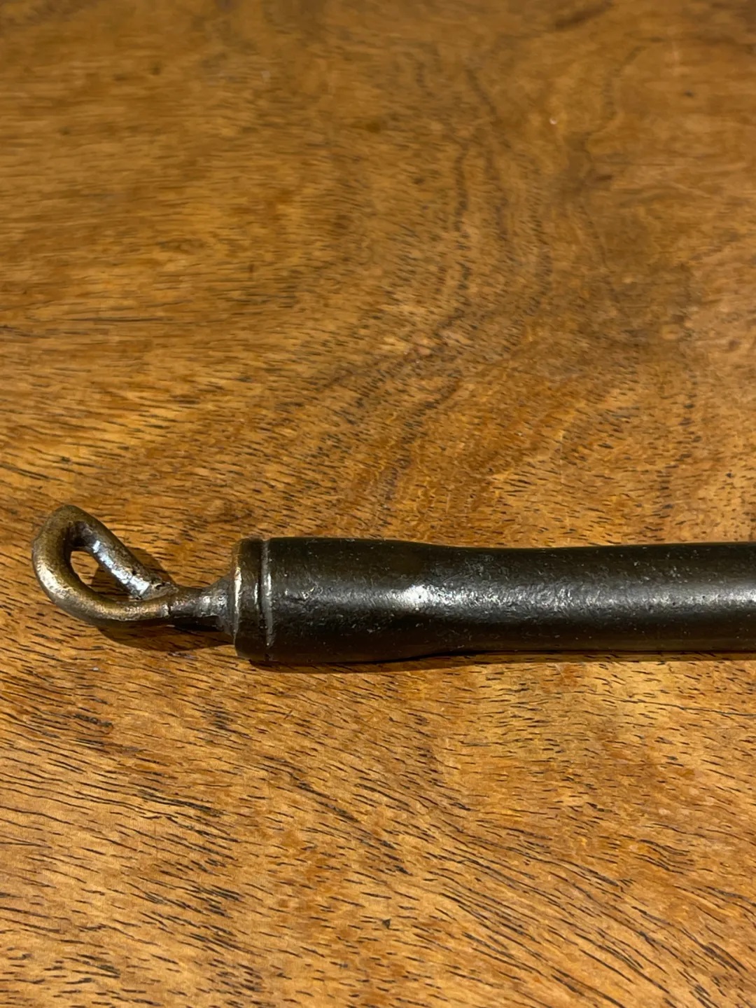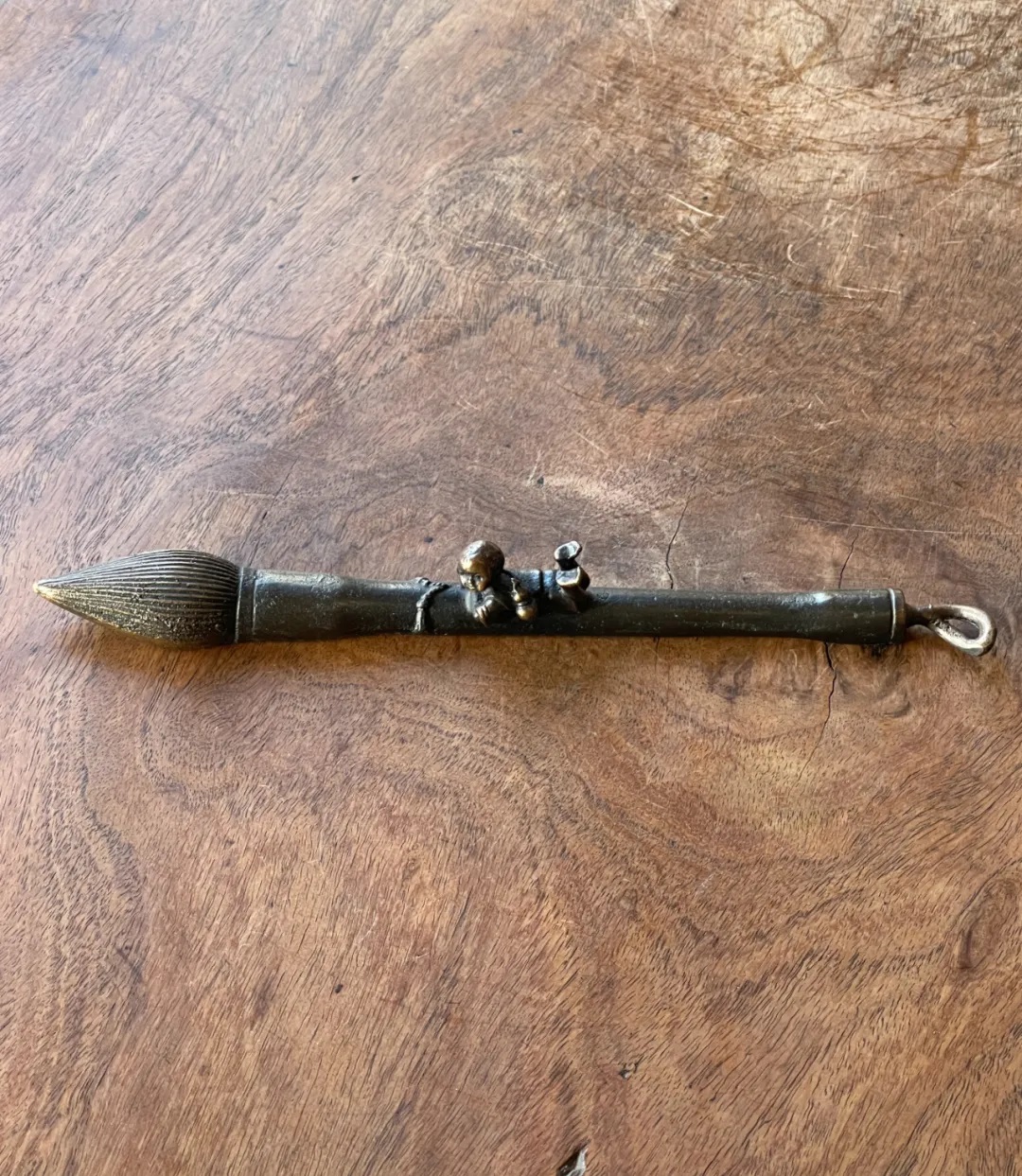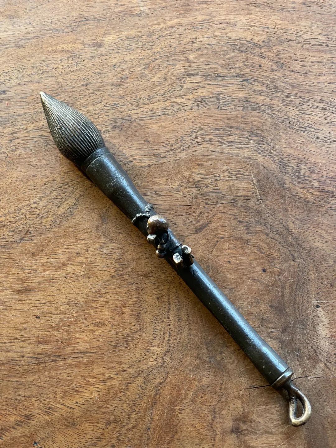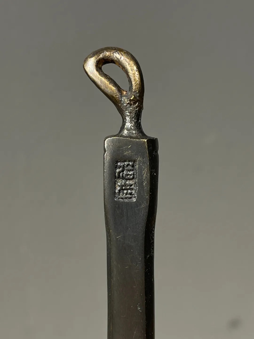 此一毛笔形青铜文房镇纸,造形独特、制作精美、气质高雅、握在手中触感细腻且沉甸压手,老包浆皮壳温润细腻,置于案上当镇纸,文雅贵气。
