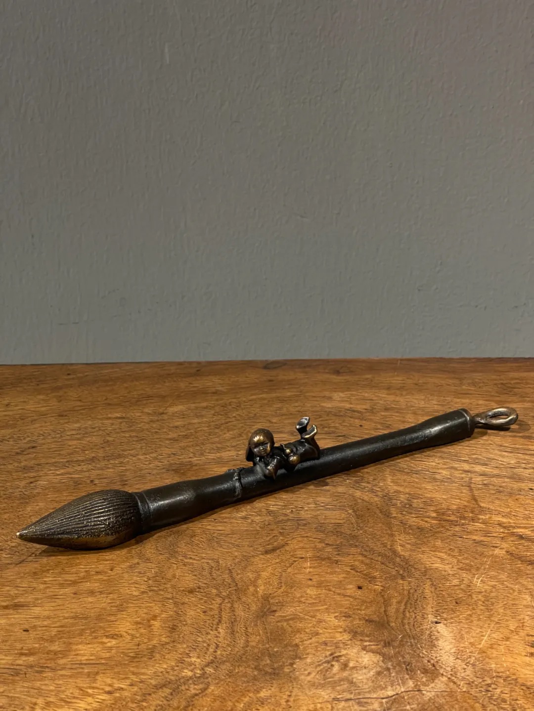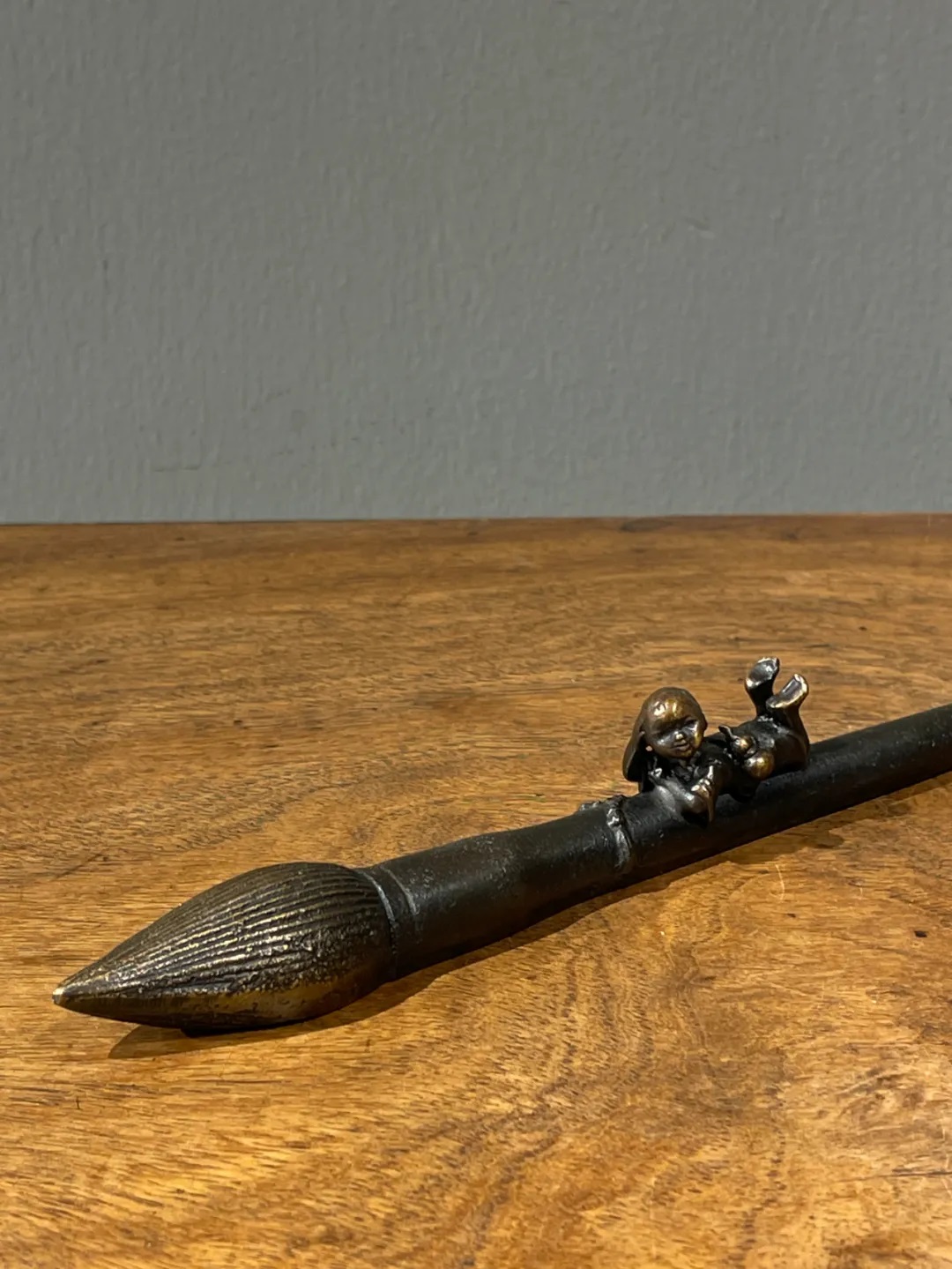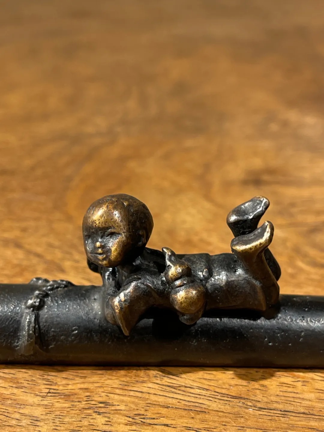 这是一件以青铜铸造琢磨而成的毛笔形文房镇纸,毛笔造型一侧平切可以平放,上方婴孩型钮,表面褐黑色皮,底部錾长方形製作工坊章款,仍然保留原桐木箱。是一件日本二十世纪初期的高端文房用具。