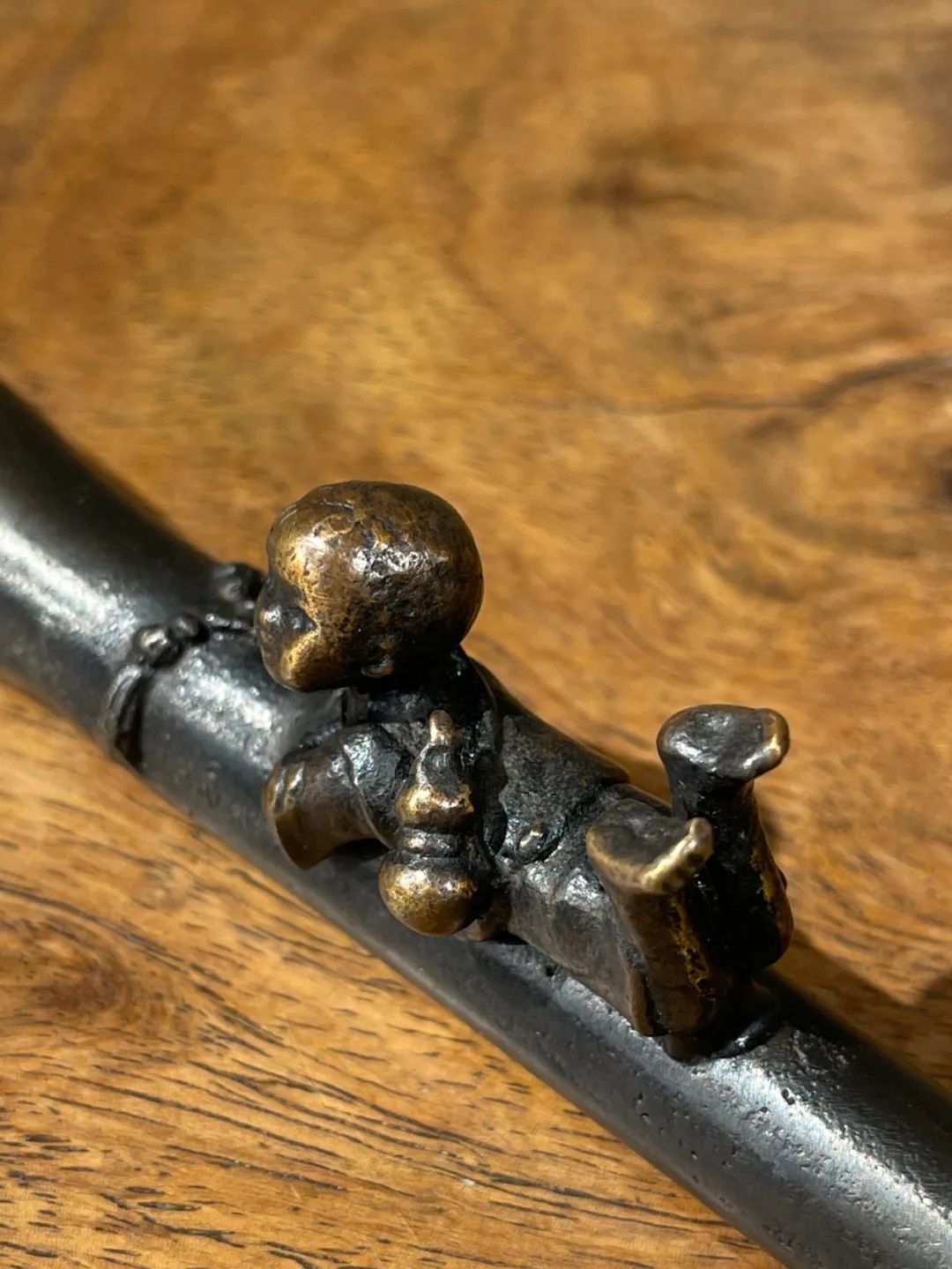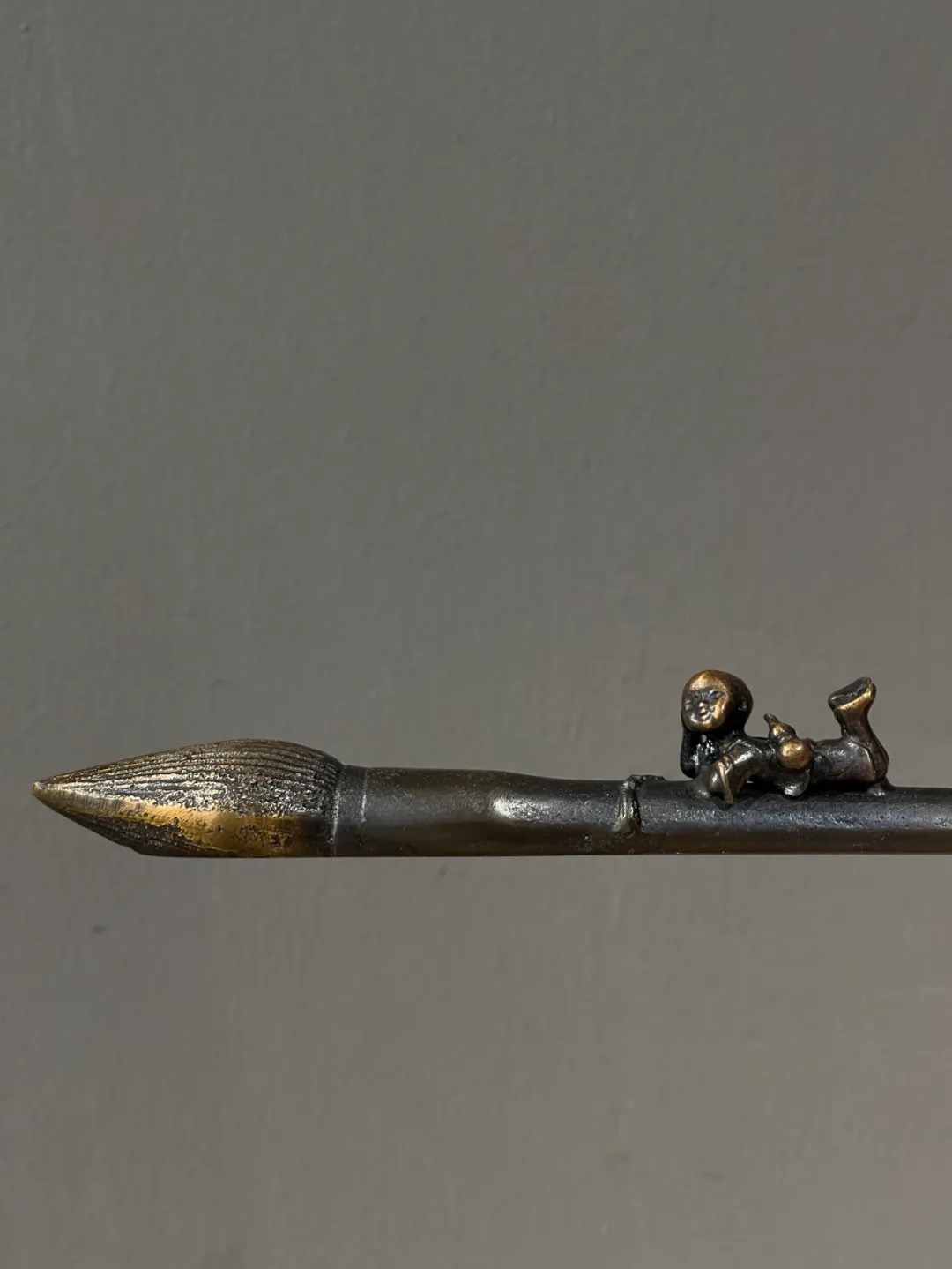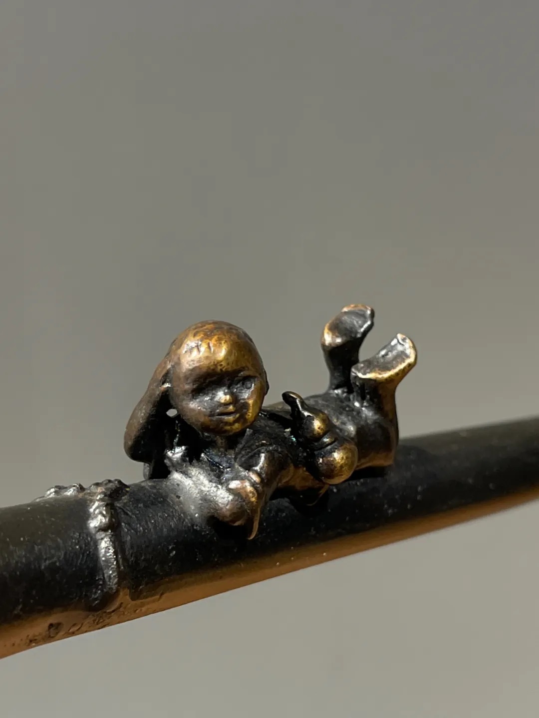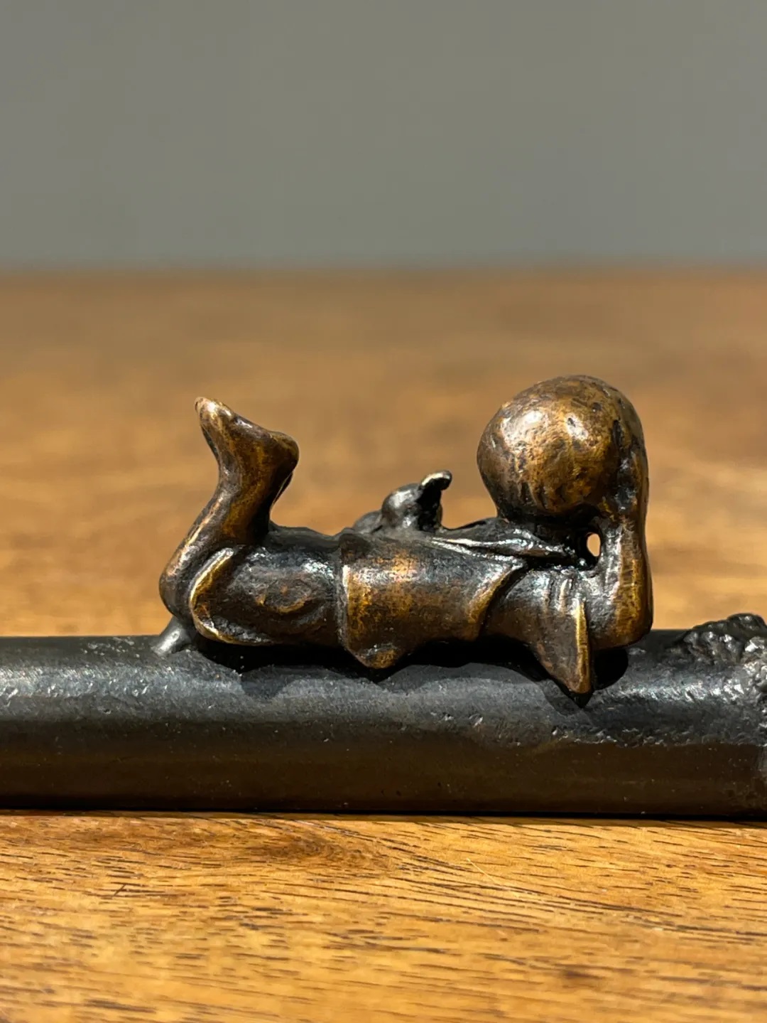 这是一件以青铜铸造琢磨而成的毛笔形文房镇纸,毛笔造型一侧平切可以平放,上方婴孩型钮,表面褐黑色皮,底部錾长方形製作工坊章款,仍然保留原桐木箱。是一件日本二十世纪初期的高端文房用具。