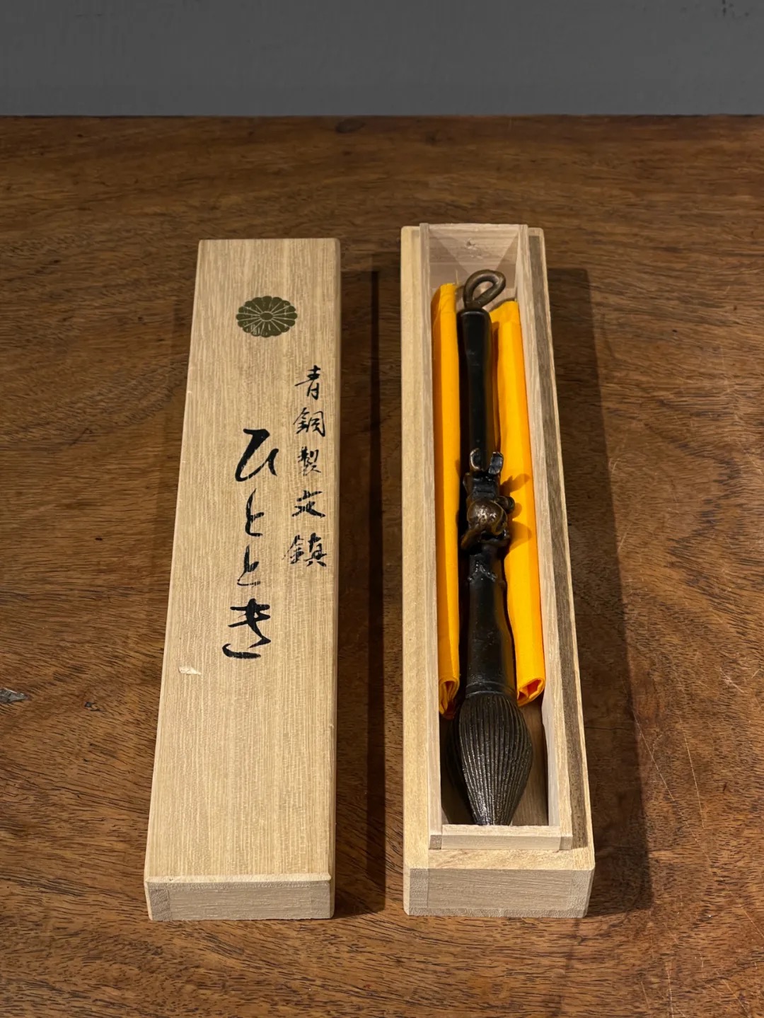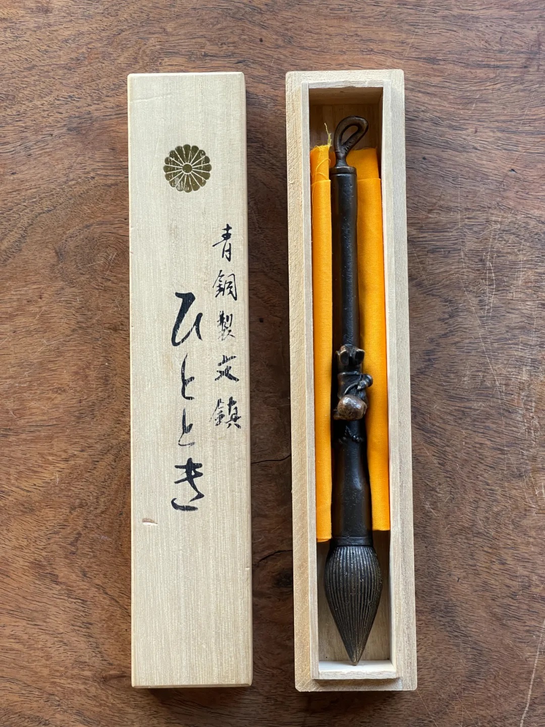 此毛笔形青铜文房镇纸保存完好,除尖端色皮磨损与小磕碰外,保存完好,包浆皮壳温润细腻,古韵盎然,收藏于量身订制的桐木箱中,箱上墨书与皇家徽章。应是日本皇室馈赠的纪念品。