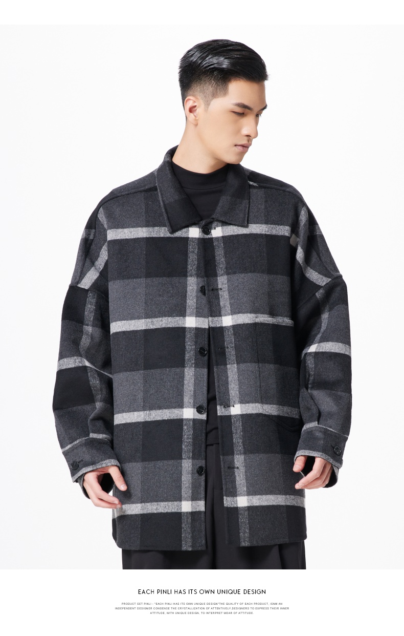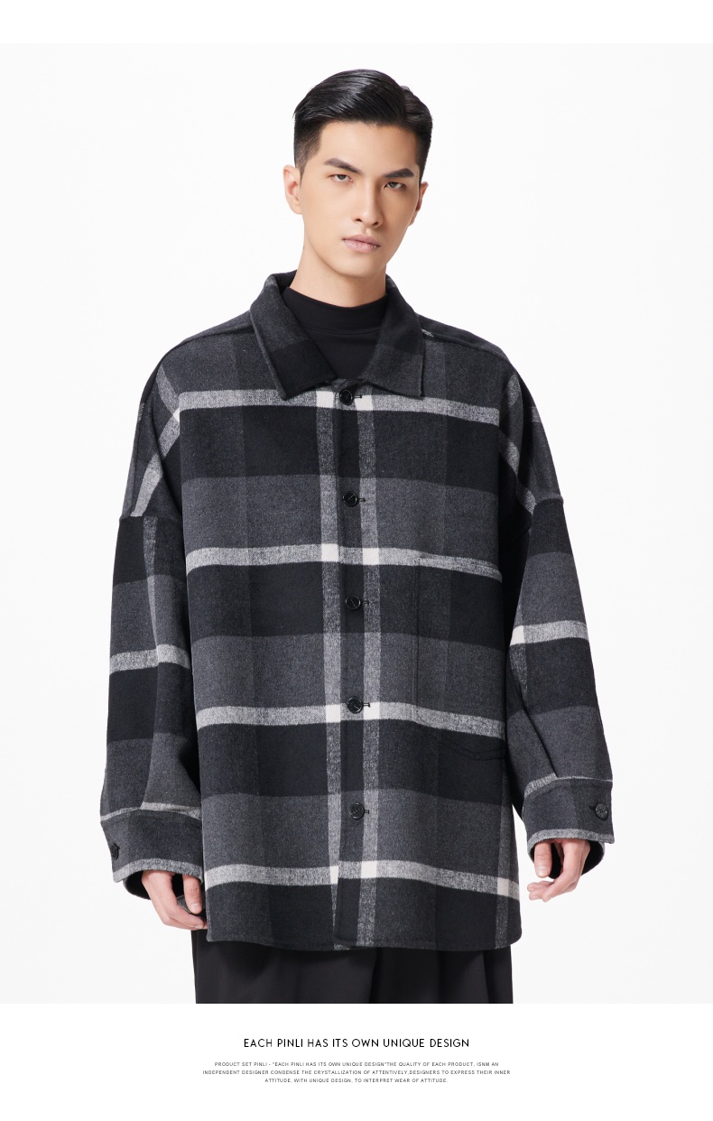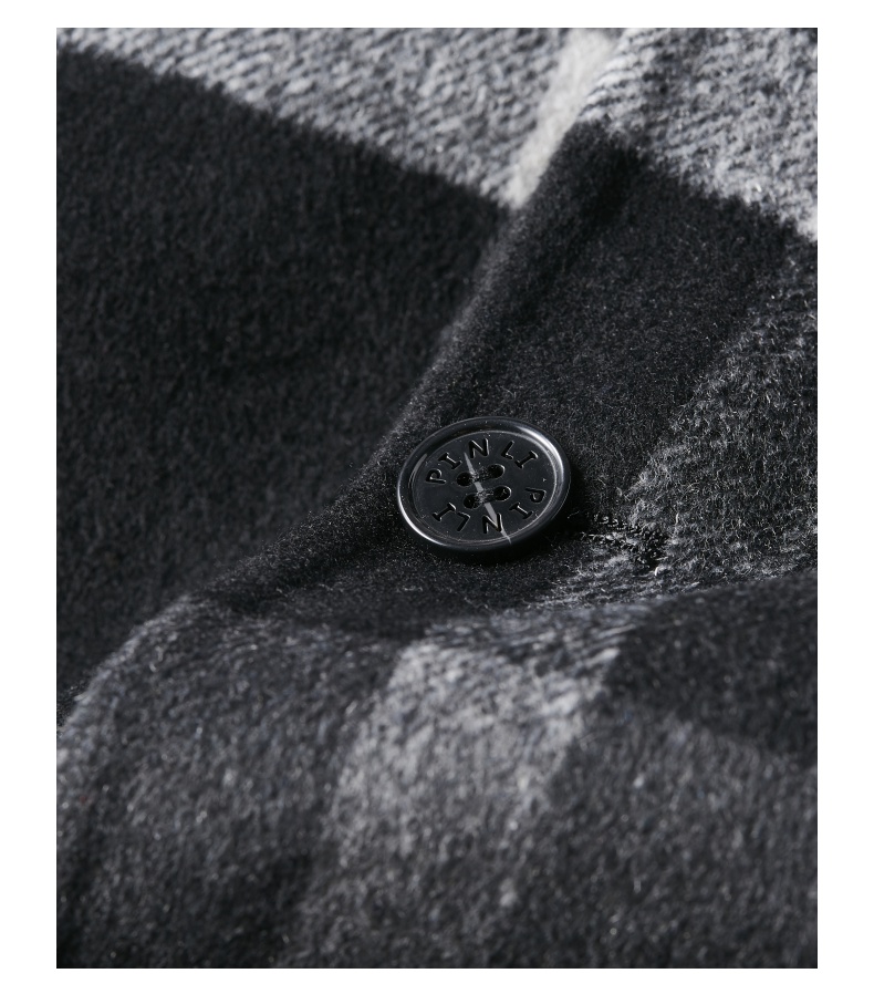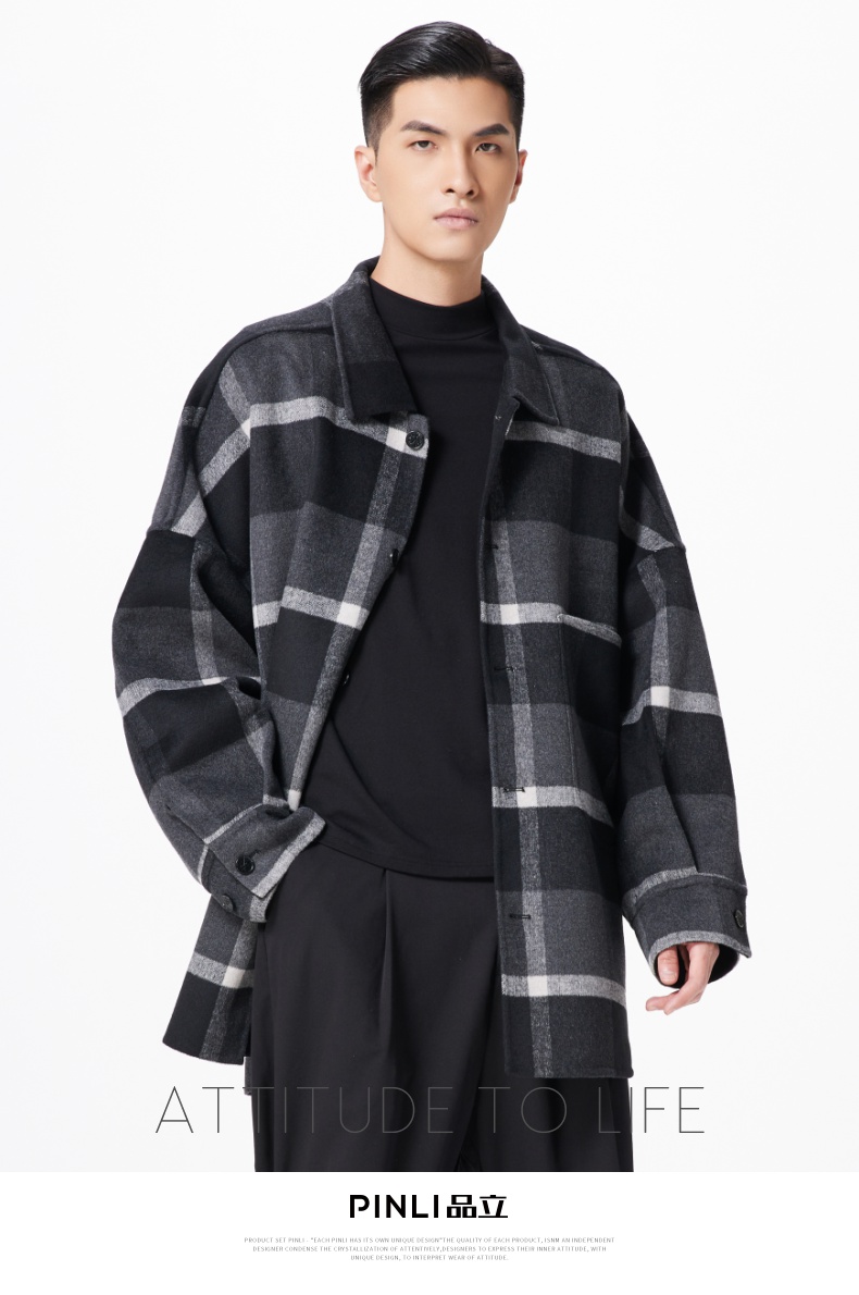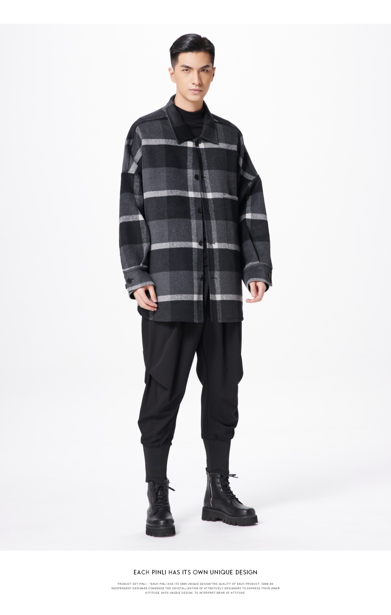 PINLI品立冬季新款宽松男装格子翻领绵羊毛双面呢大衣外套潮