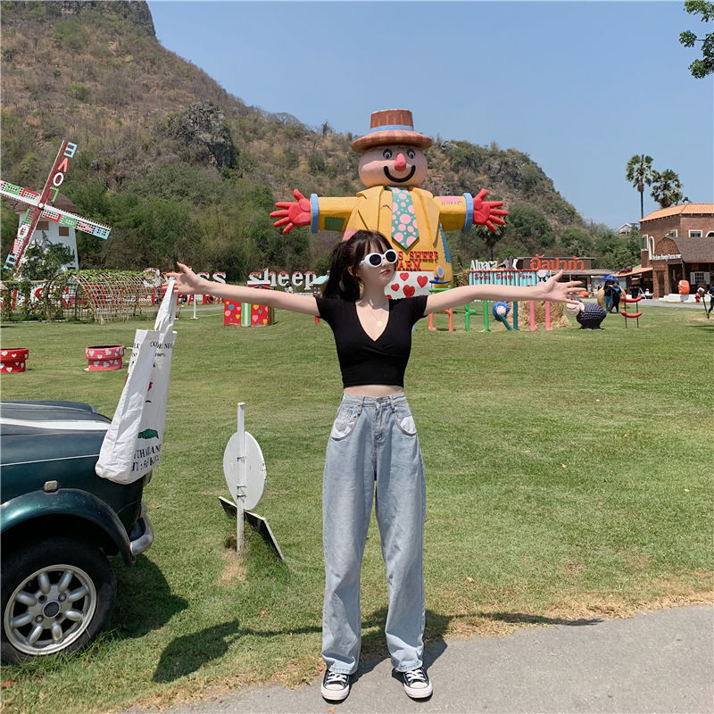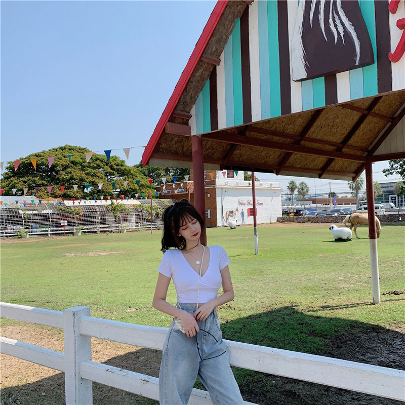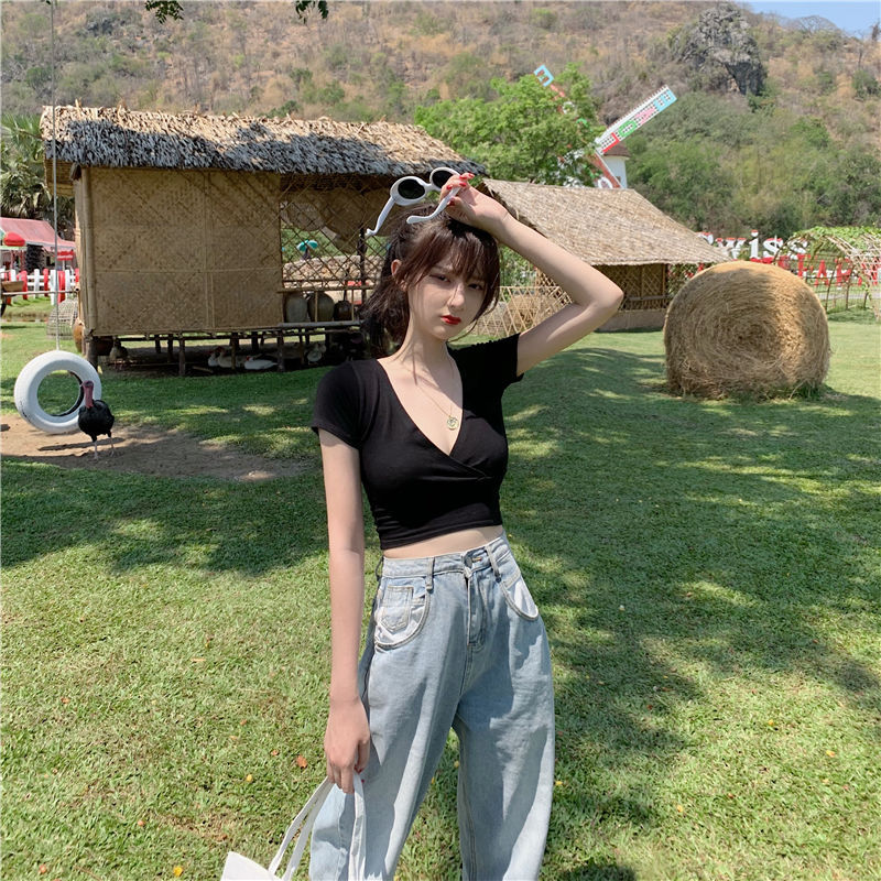 【性感深v❗️新款夏季T恤】修身版型,露脐短款,舒适透气,夏季常备单品,时尚休闲,女夏季新款深V领,外穿低胸韩版修身露脐短款学生上衣潮