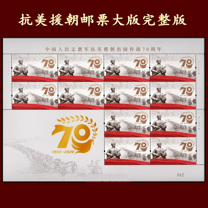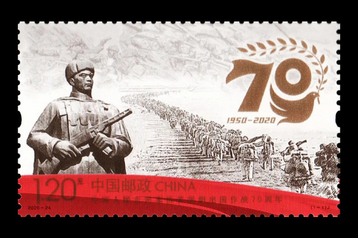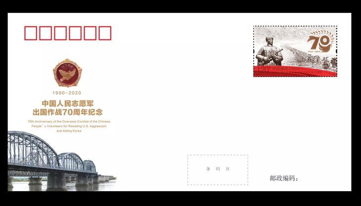 邮票图案以保家卫国的志愿军战士形象为主体,结合70、和平鸽和橄榄枝的组合设计,寓意铭记历史、保家卫国、维护和平;