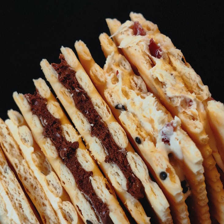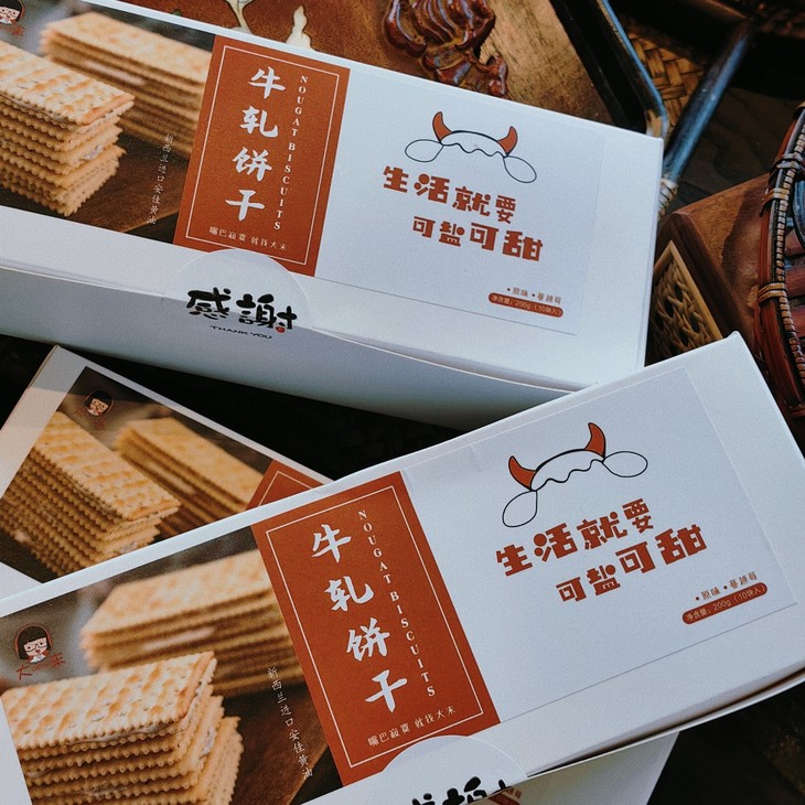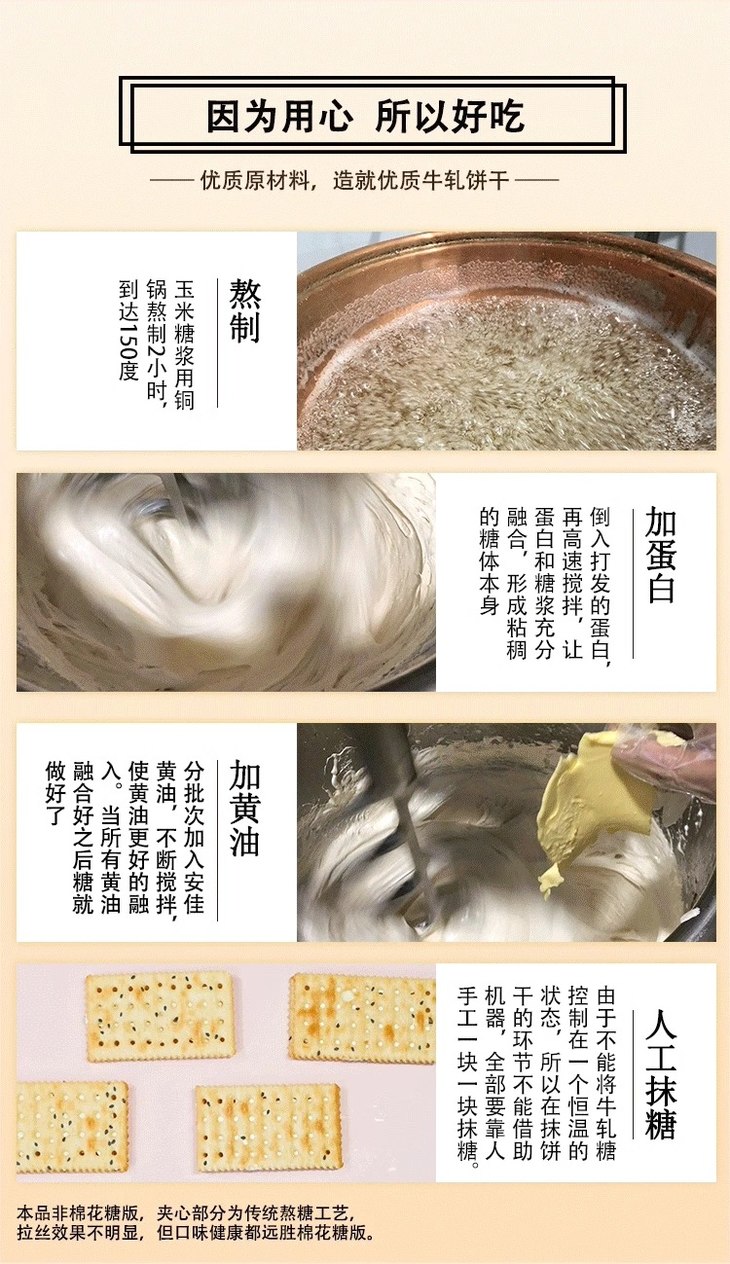 大末的牛轧糖夹心饼干,坚持传统古法熬糖,使用铜锅将玉米糖浆熬制2小时,再加入打发的蛋白,经高速搅拌后融合,形成粘稠的糖体后,分批次加入新西兰安佳黄油搅拌。由于糖的特性,遇热变软流动,遇冷变硬凝固,如果放冰箱,就不容易拉丝,但入嘴咬起来反而会更有口感!