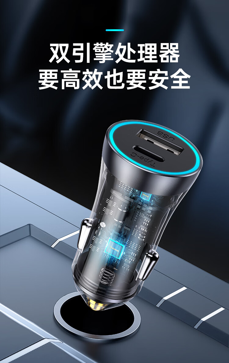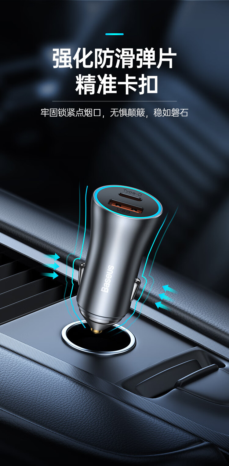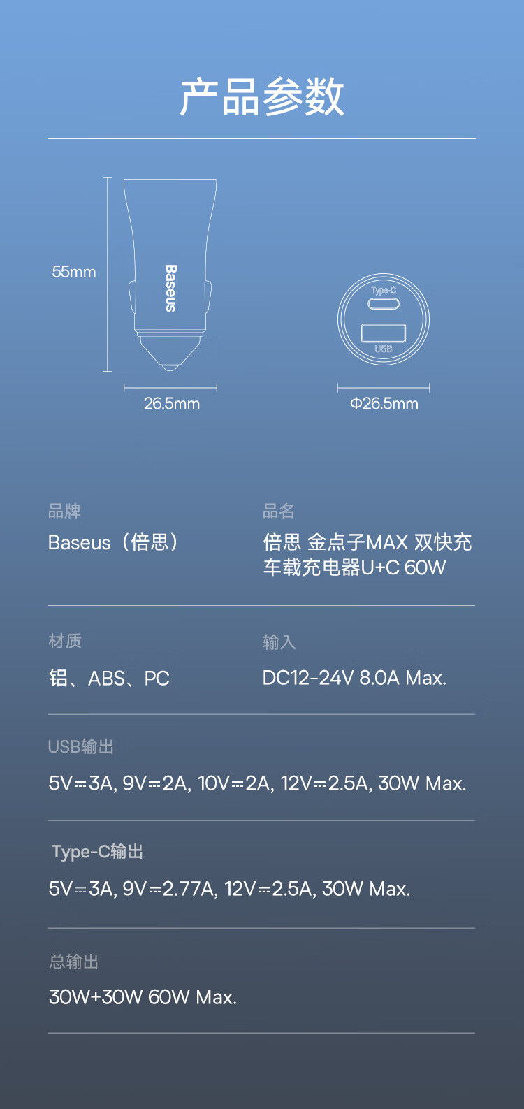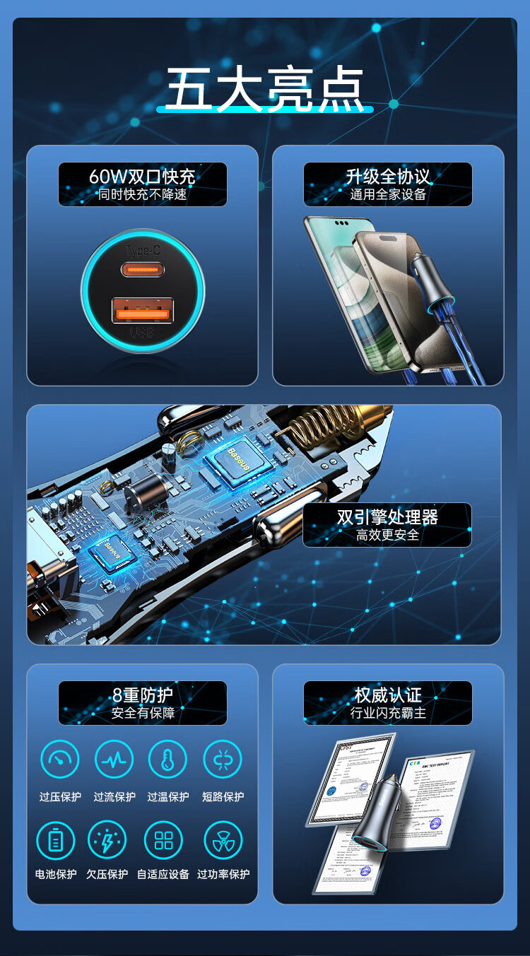 倍思 车载充电器60W点烟器一拖二车充超级快充