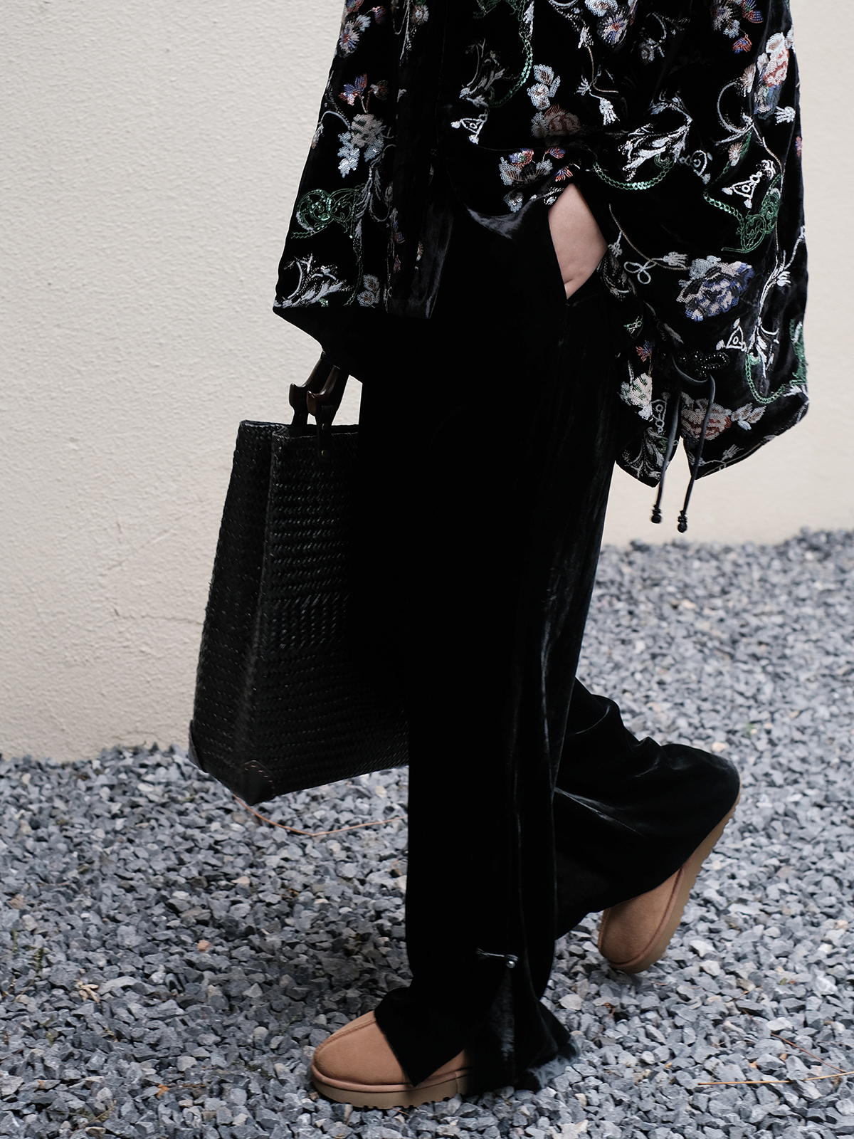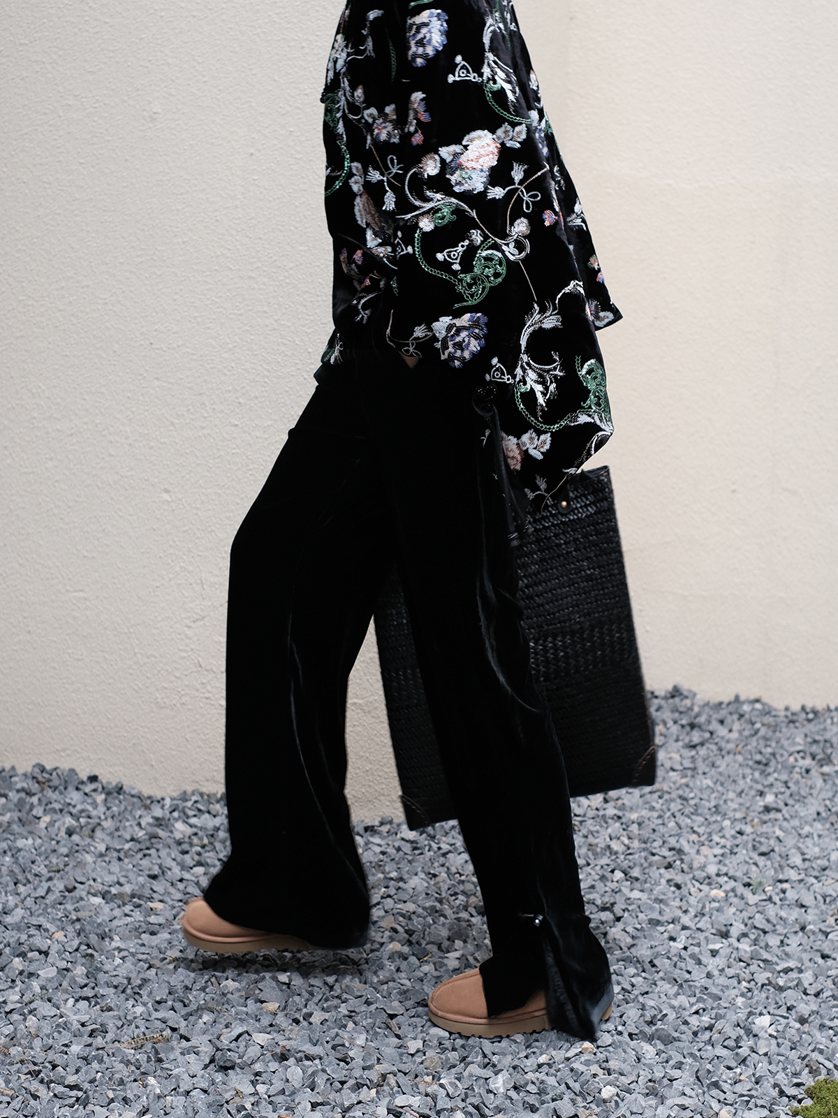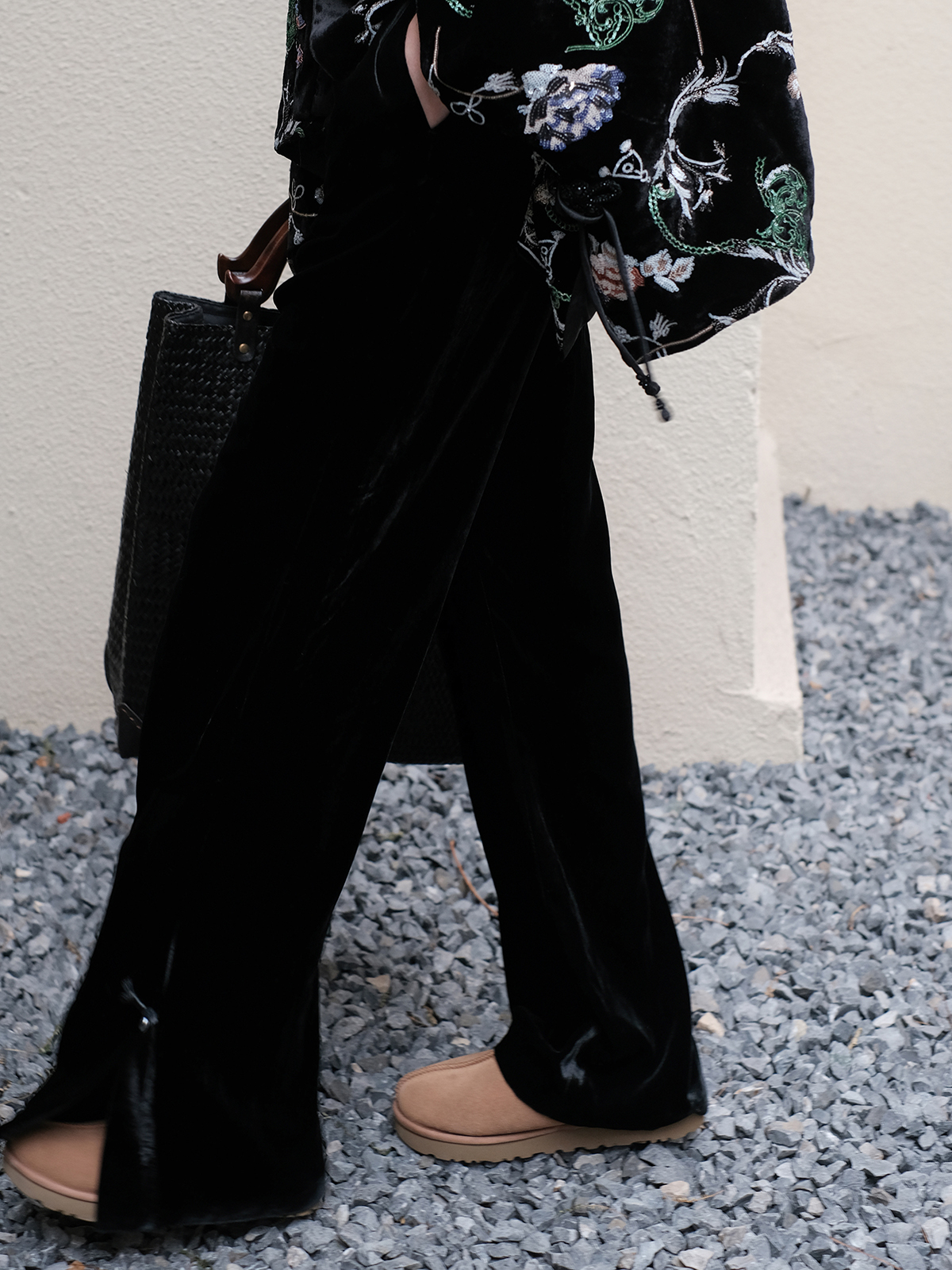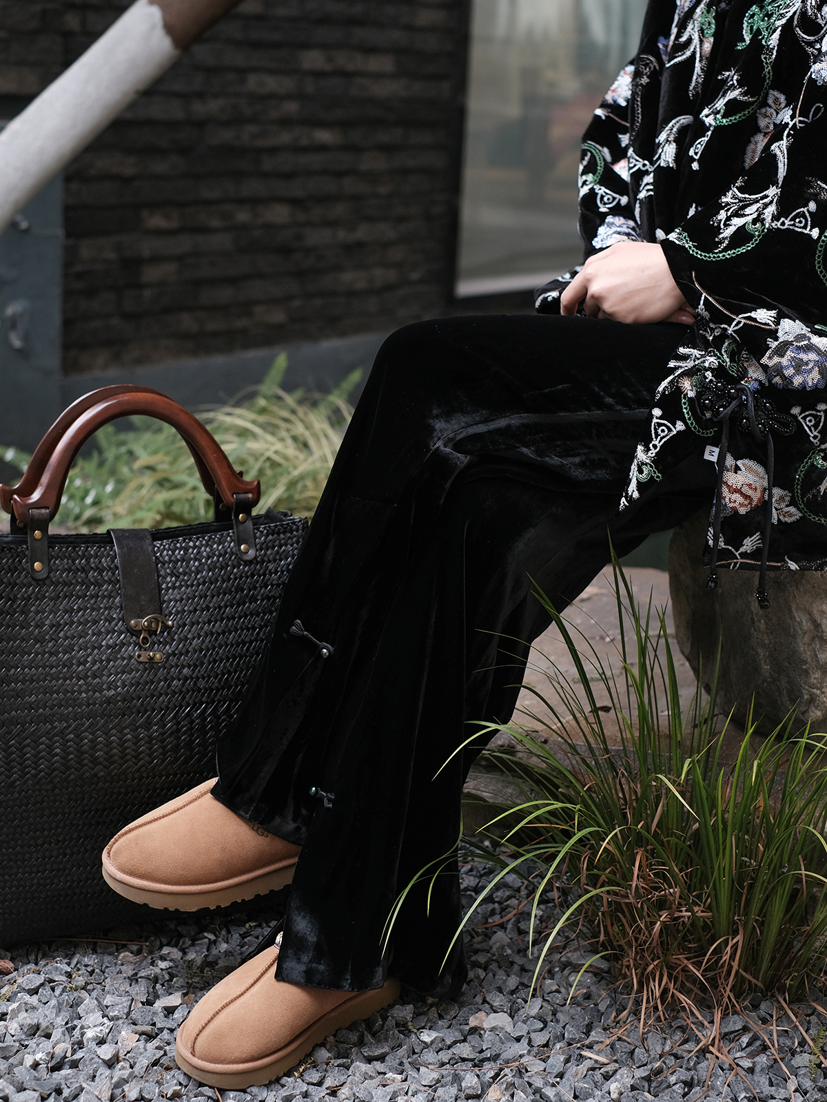 微瑕秒杀| 盛唐牡丹 |黑色丝绒松紧腰女裤[特价品]](特殊商品不退不换)
