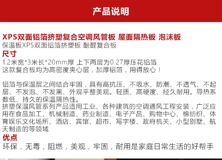 商品描述:20MM×3M×1.2M(红色) 双面铝箔挤塑风板 10张/件 商品代码19101