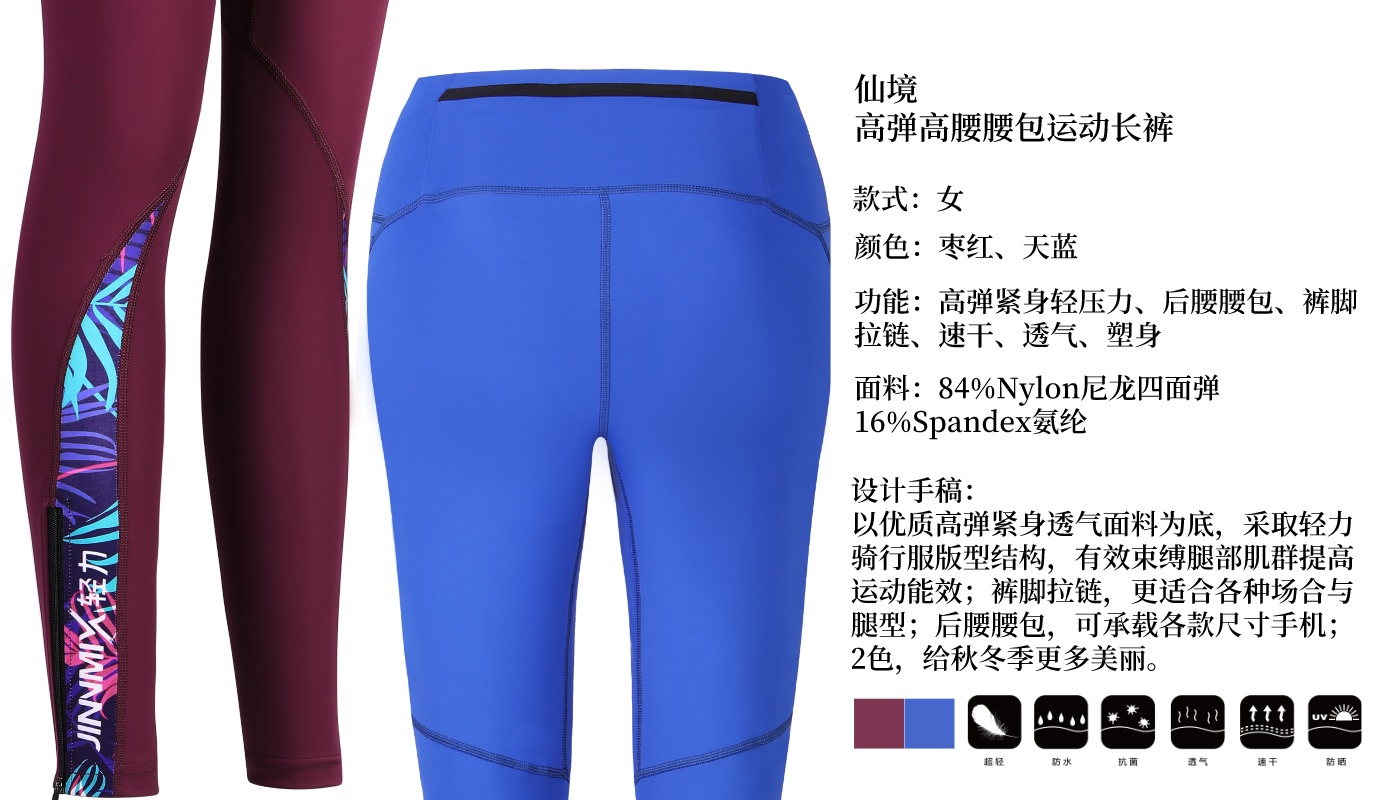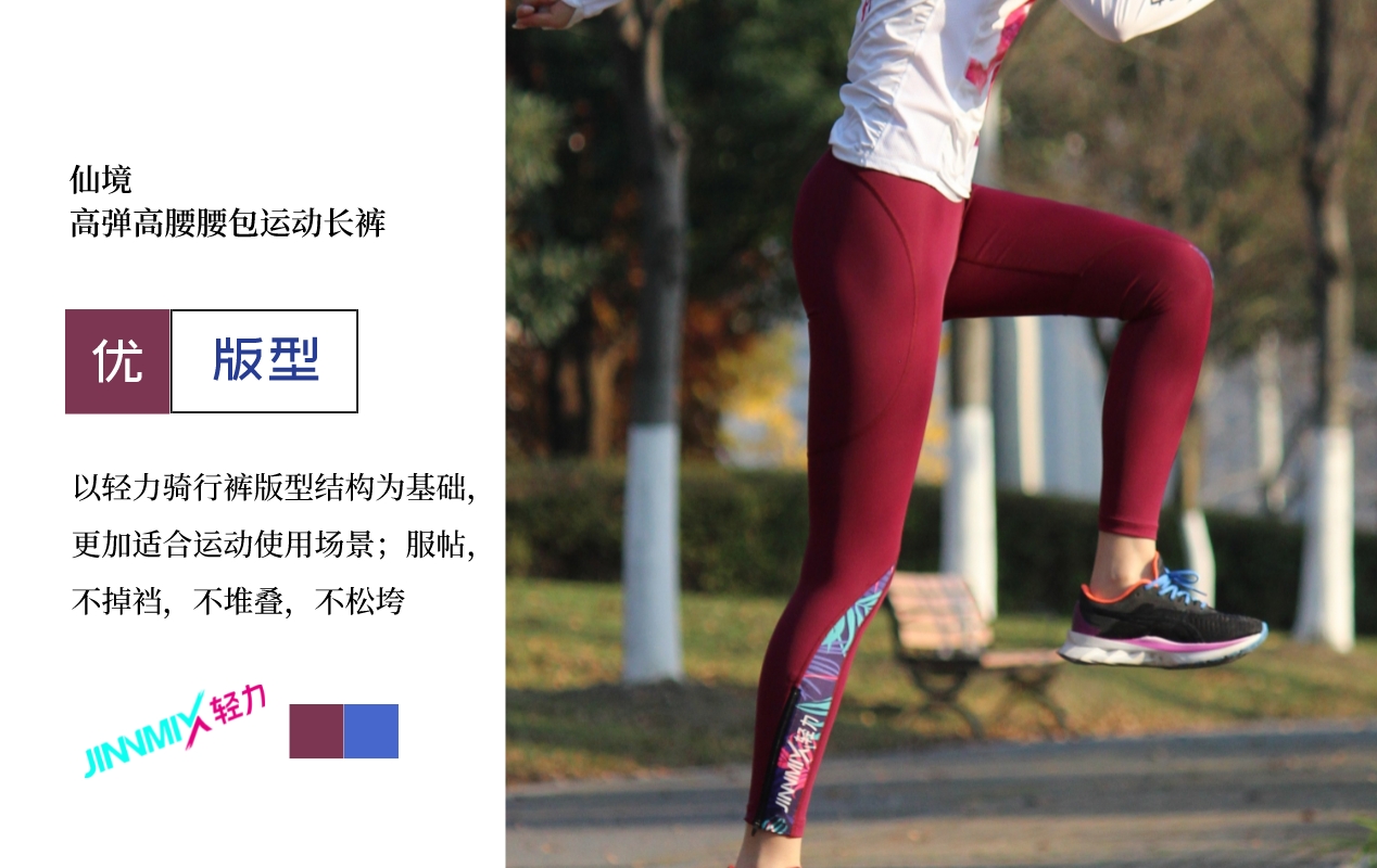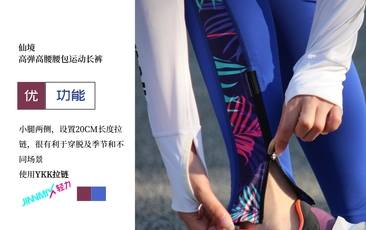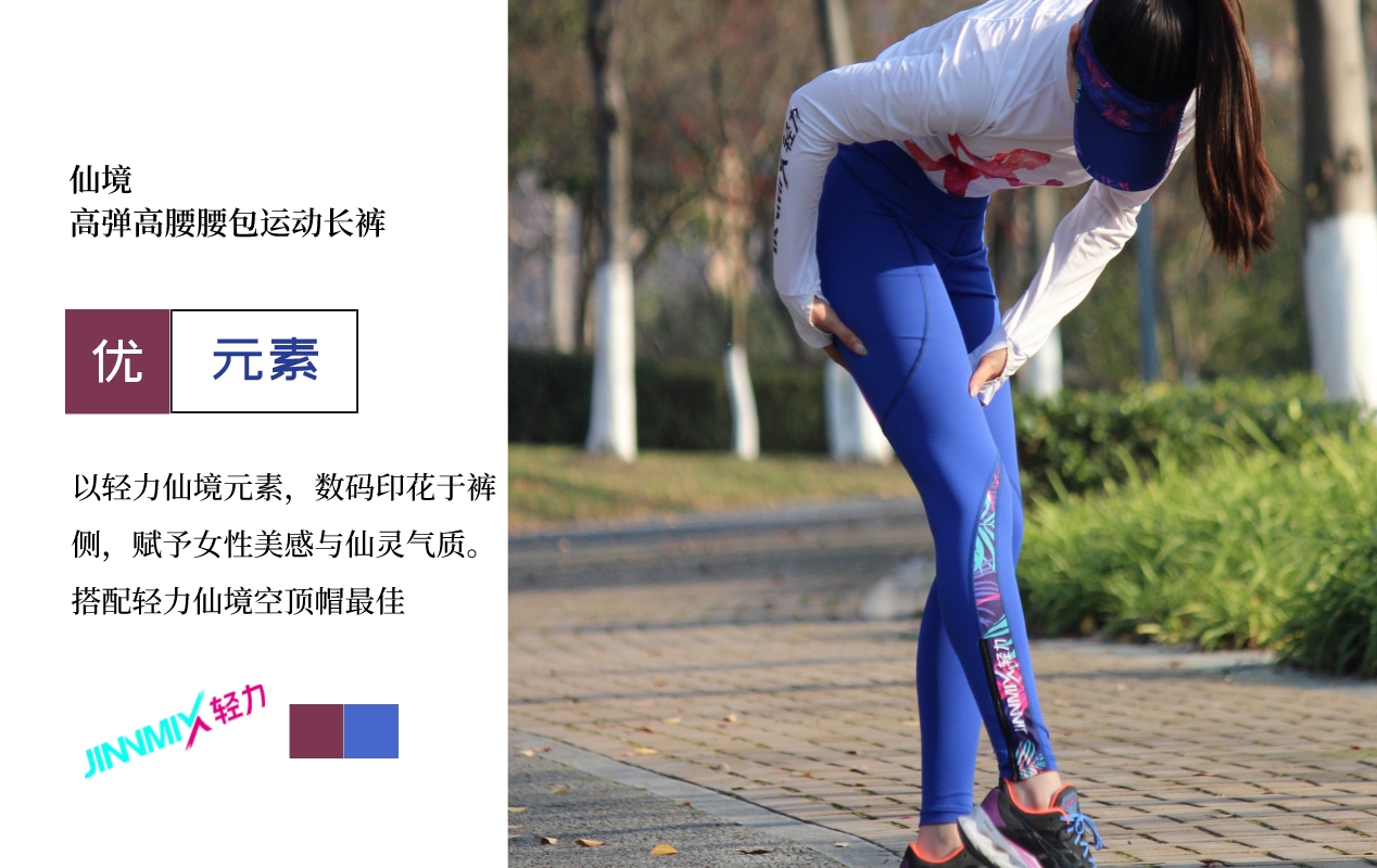 以优质高弹紧身透气面料为底,采取轻力骑行服版型结构,有效束缚腿部肌群提高运动能效;裤脚拉链,更适合各种场合与腿型;后腰腰包,可承载各款尺寸手机;以轻力仙境元素,数码印花于裤侧,赋予女性美感与仙灵气质。