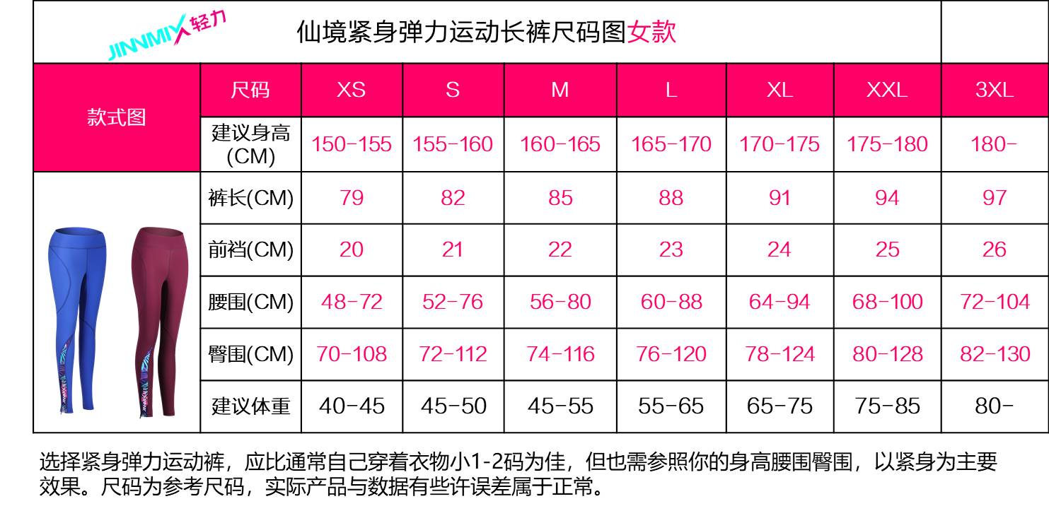 尺码表:如图,不清楚如何选尺码,务必报身高、腰围、臀围。本款紧身裤高弹,建议小1-2码选择。
