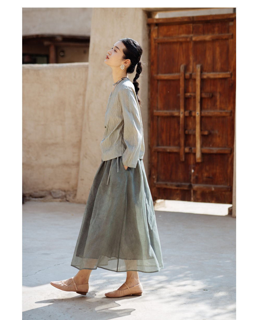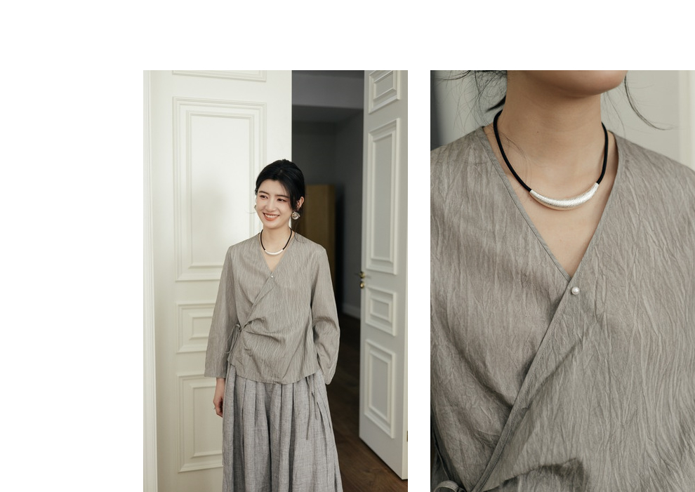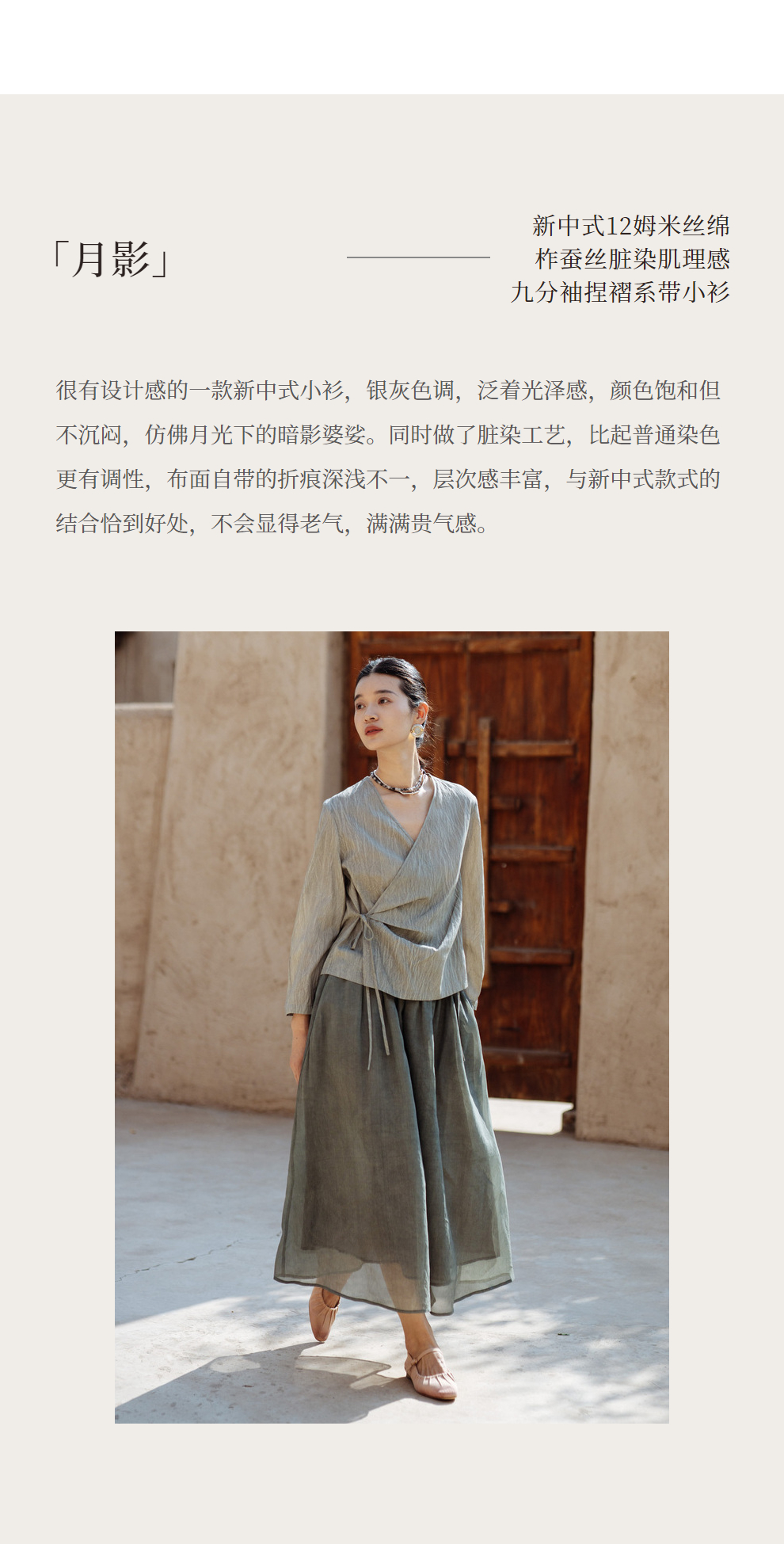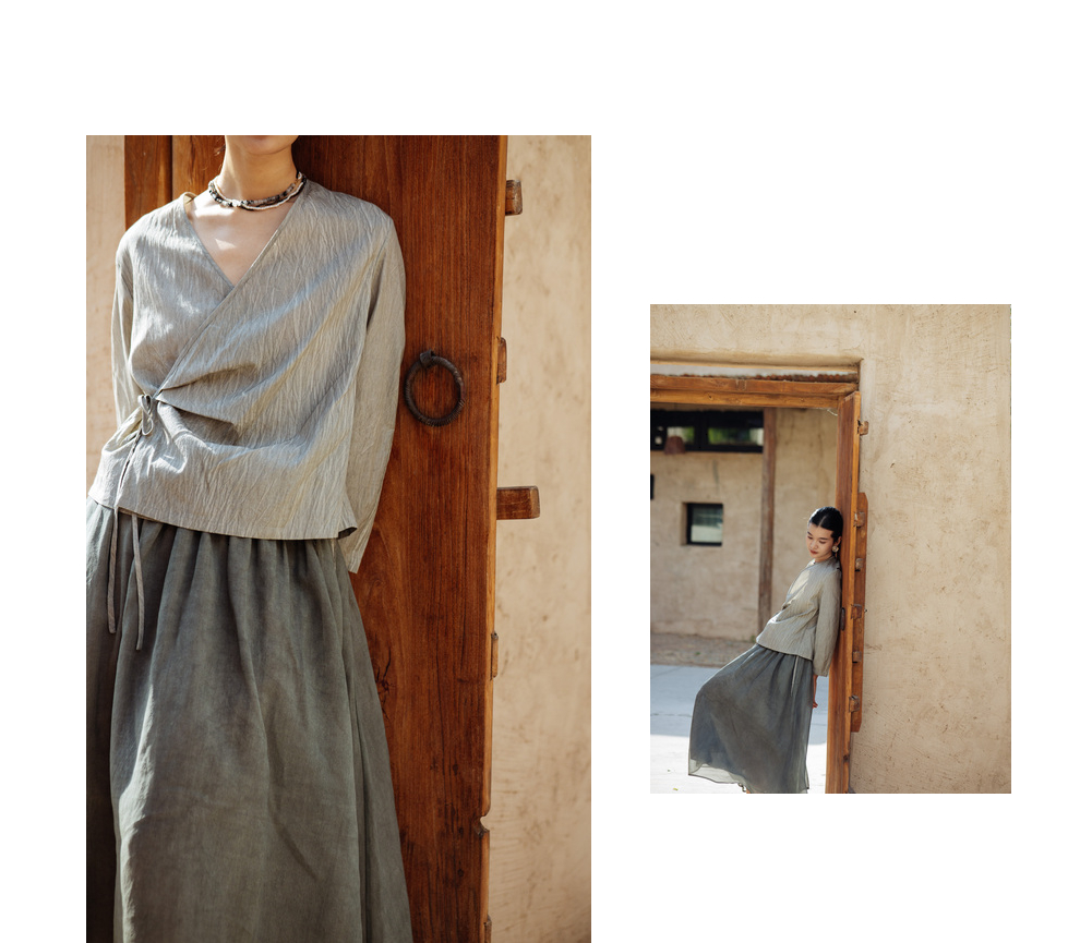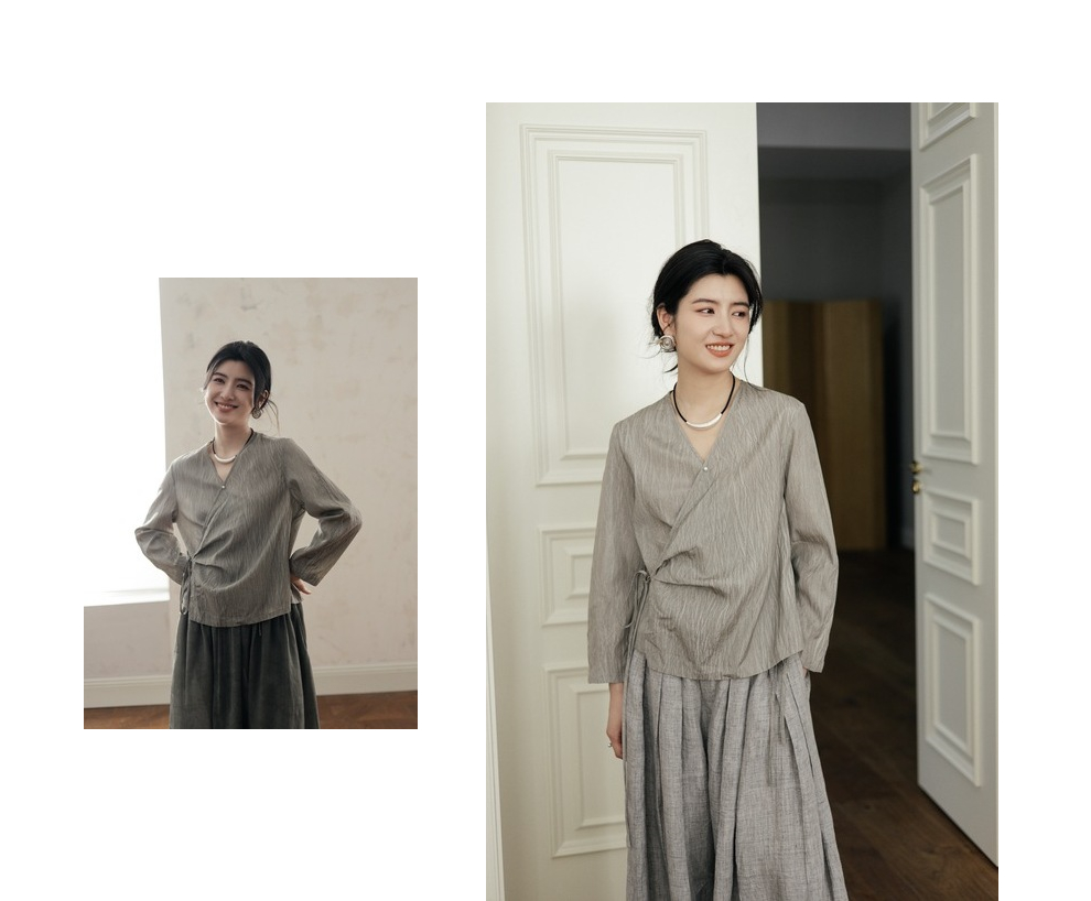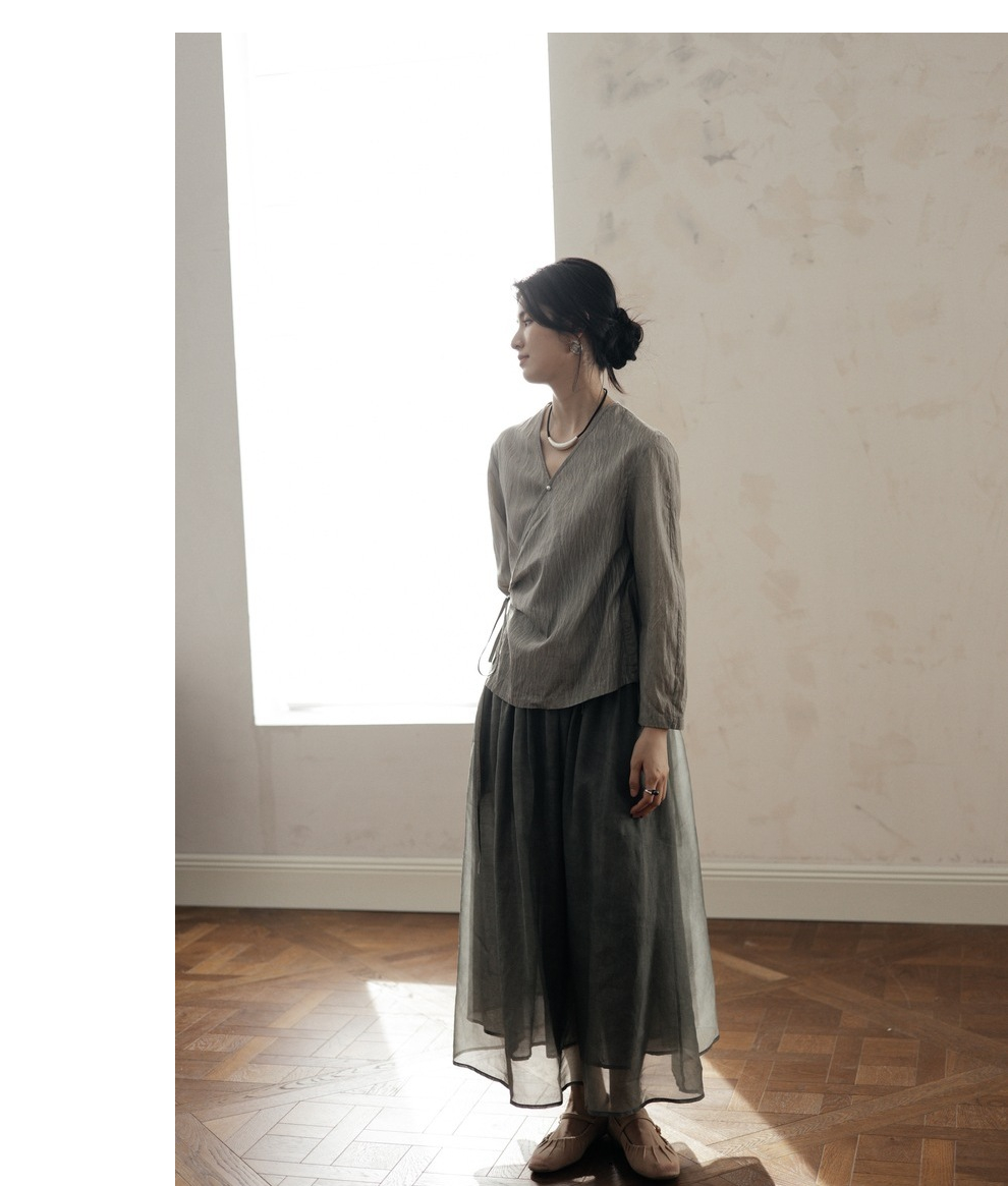 绽放457朵【黑白灰系列·月影】新中式长绒棉柞蚕丝脏染灰带小衫