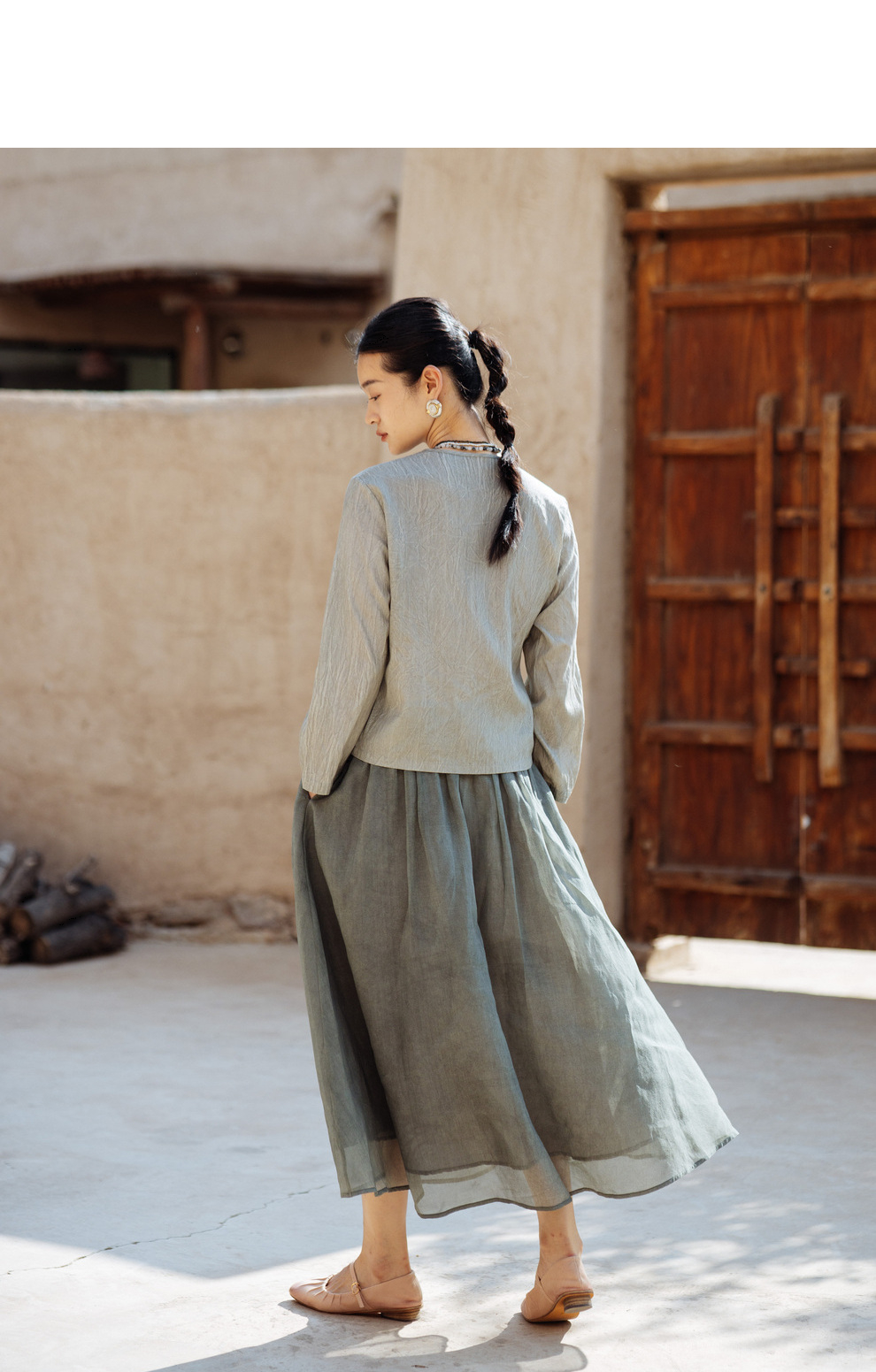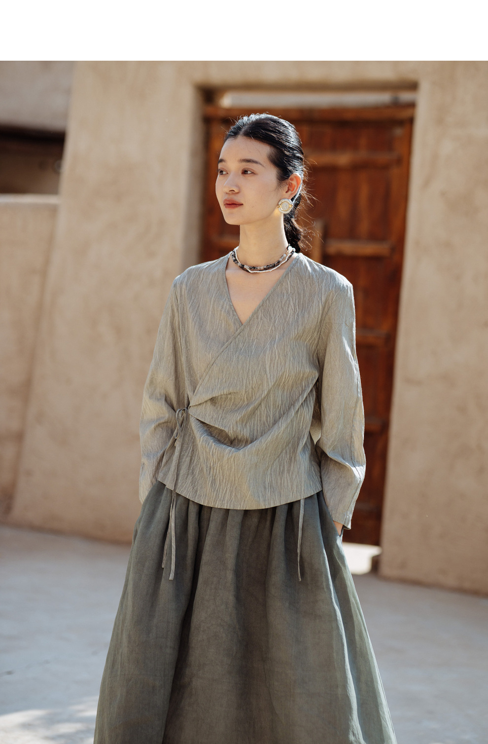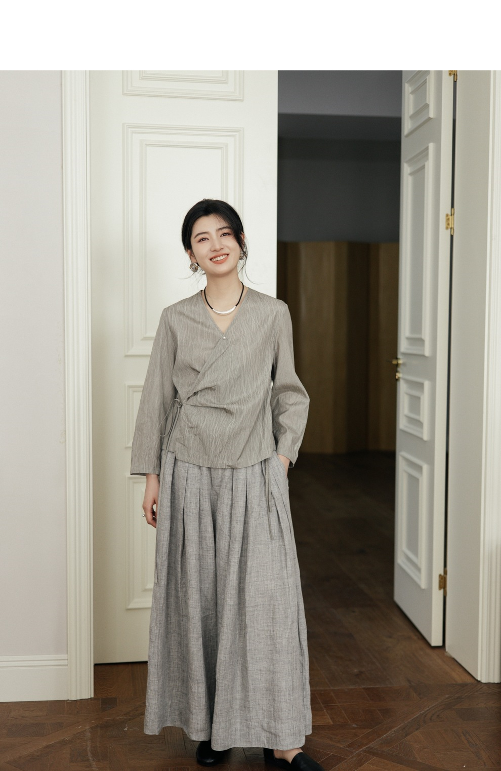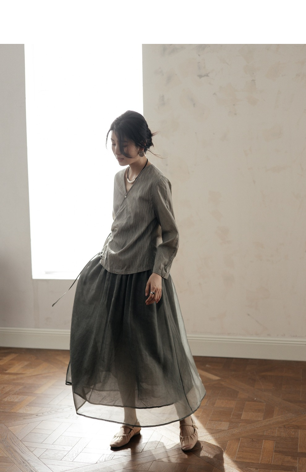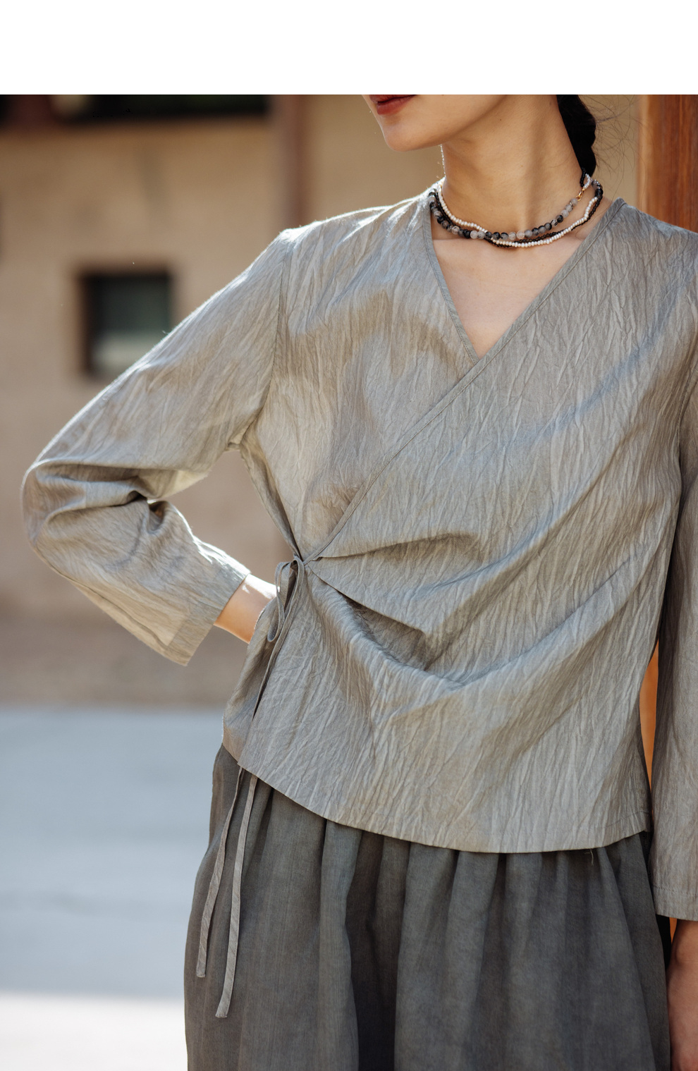 绽放457朵【黑白灰系列·月影】新中式长绒棉柞蚕丝脏染灰带小衫