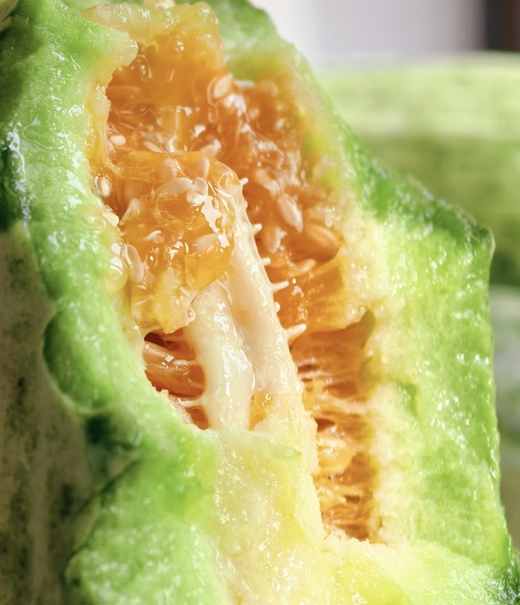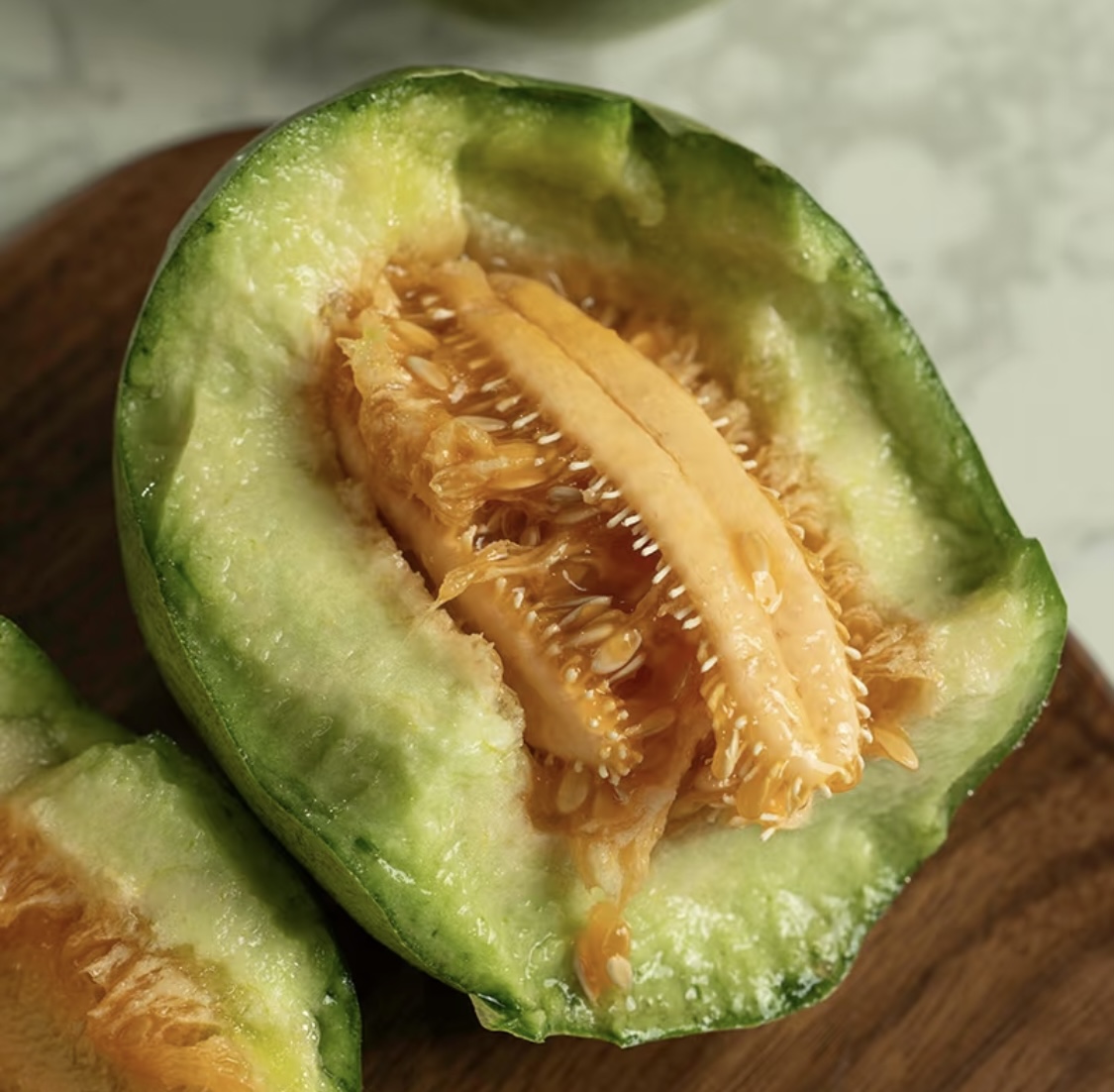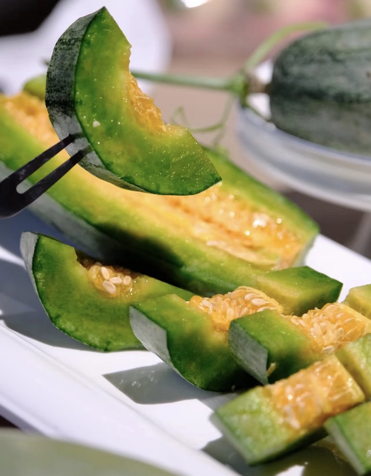 我们推荐来自山东海阳的第三代羊角蜜瓜,椭圆状果形,色如凝翠,辨识度拉满,作为甜瓜界的优等生,它在口感与风味上实现了完美蜕变。