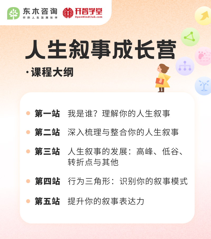 欢迎你加入「人生叙事成长营」,我们将陪伴你,用更科学的方法、更巧妙的工具,梳理并重塑你的人生叙事,整体性地理解自己、理解他人。