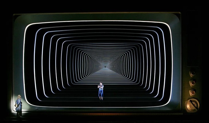在《老实人》(Candide)中,迈克尔将一台电视机作为故事发生、发展的环境,人物的表演、场景的切换均围绕这部电视机配合多媒体而完成。在“电视机”中,几何图案不断地纵向延伸,整个舞台空间仿佛被镜像般无限扩大。