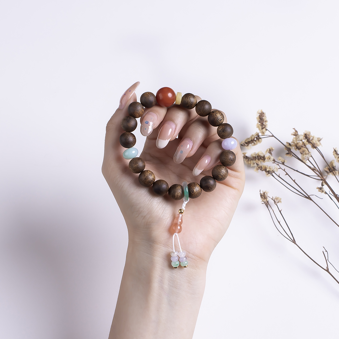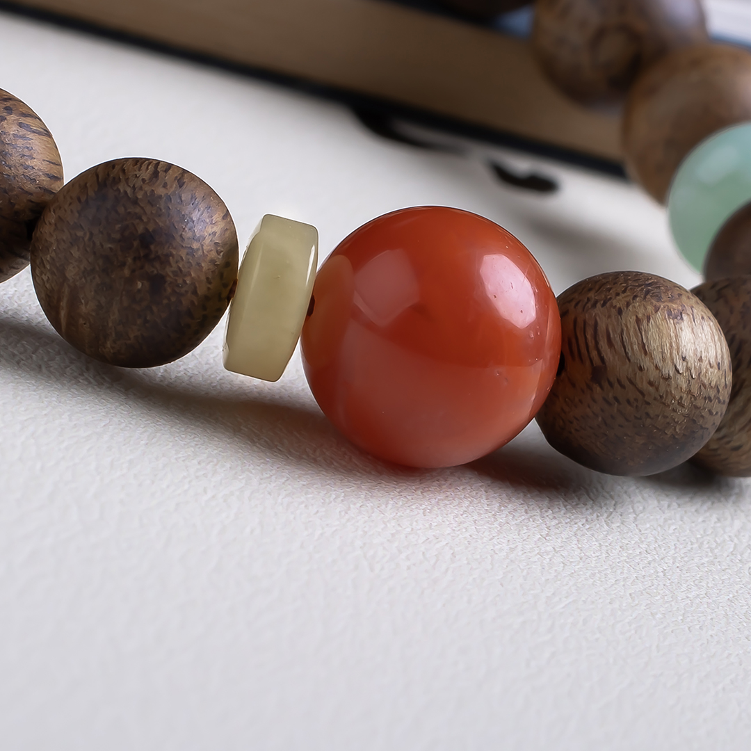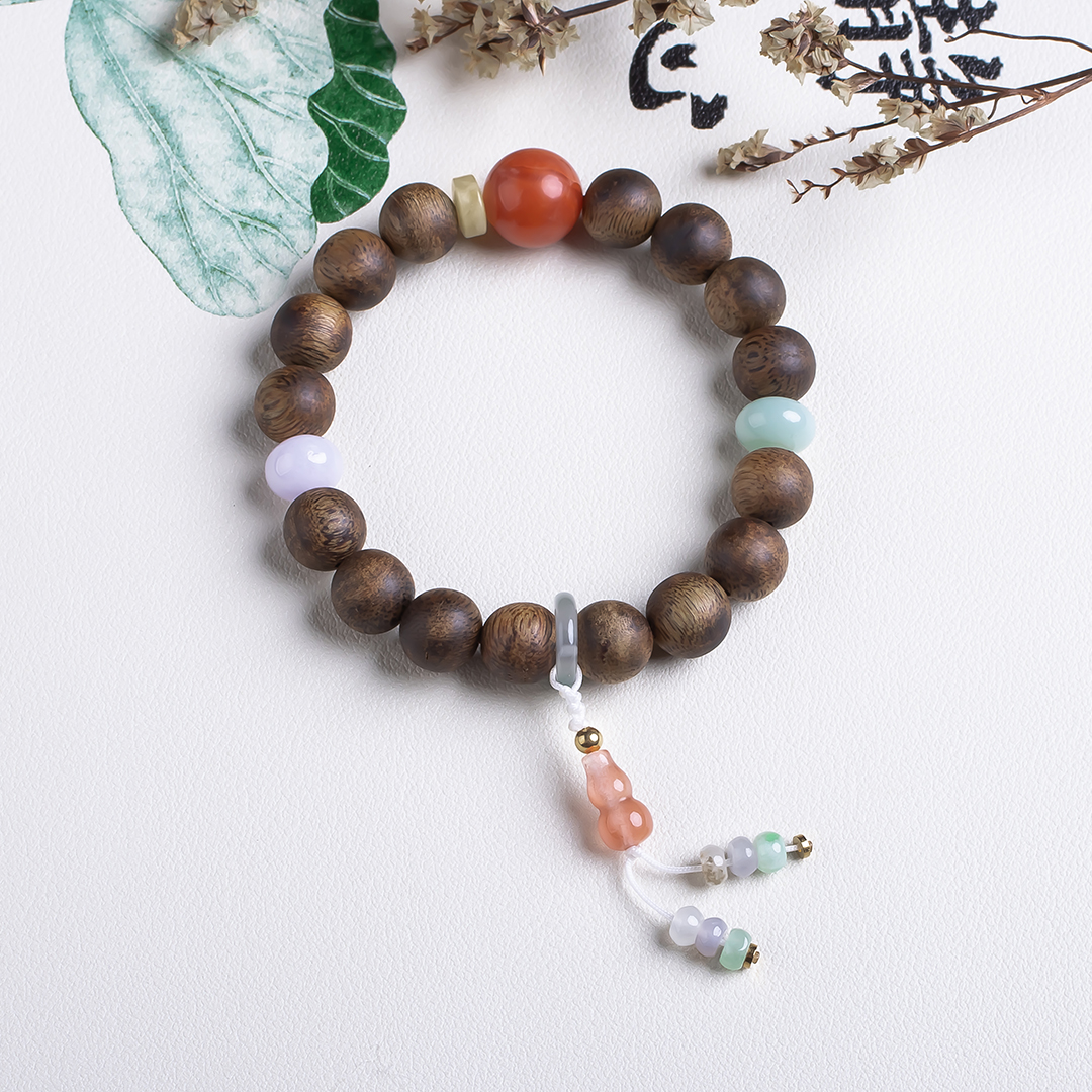 xy0516沉香+南红翡翠手持手串,天然沉香约10.4mm,原色原味,香味自然清甜,一颗满色肉南红+一枚冰飘红的南红葫芦小坠,再配有翡翠、蜜蜡,玉质细腻温润,款式时尚个性,超美的国风穿搭。