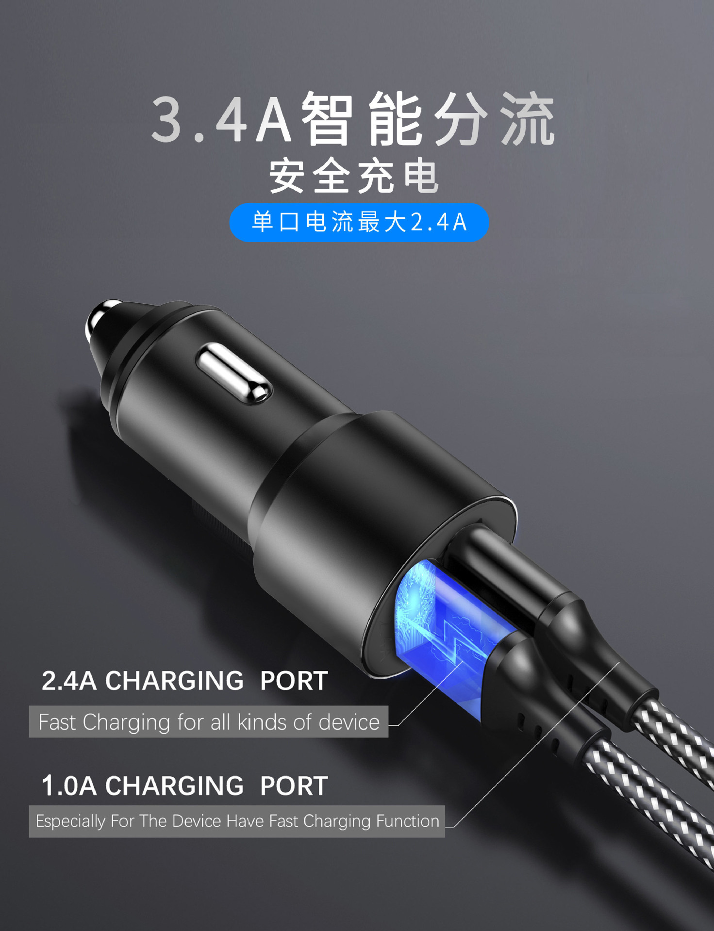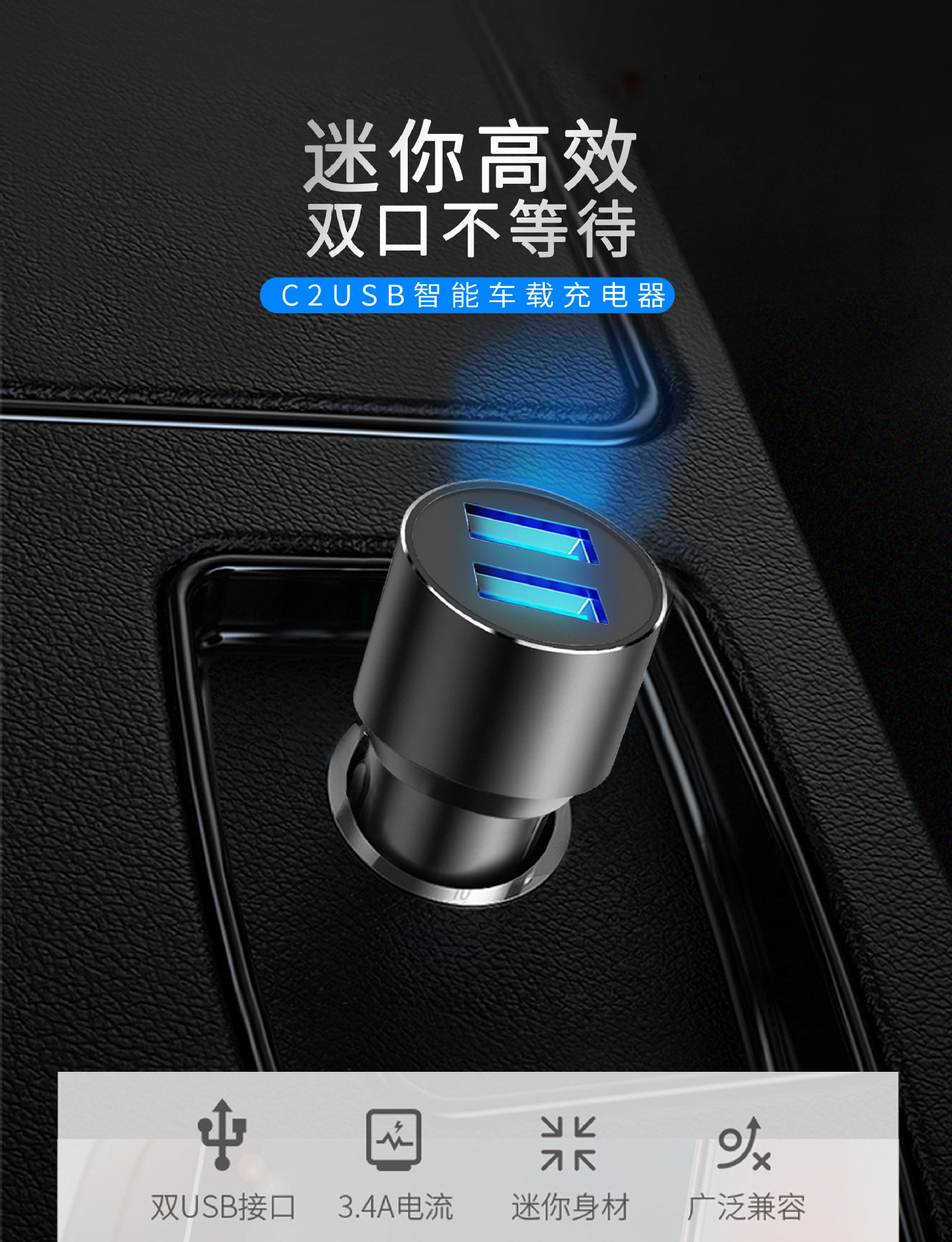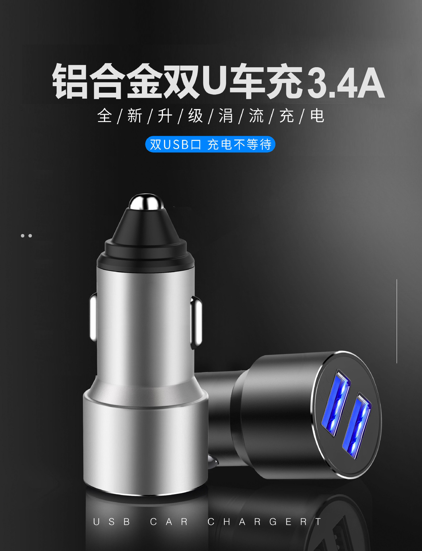 严选【金属铝合金一拖二车充银色】双usb车充3.4A车载智能快充手机车载充电器1个