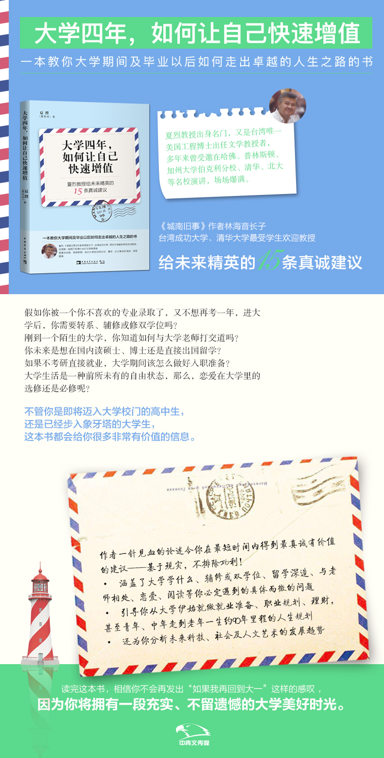 ★ 《城南旧事》作者林海音长子,台湾成功大学、清华大学Z受学生欢迎教授给未来精英的15条真诚建议。夏教授是中国台湾仅有的美国工程博士出任文学教授者,受邀在哈佛、普林斯顿、加州大学伯克利分校、清华、北大等名校演讲,场场爆满。