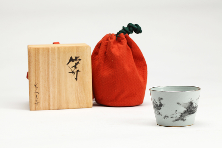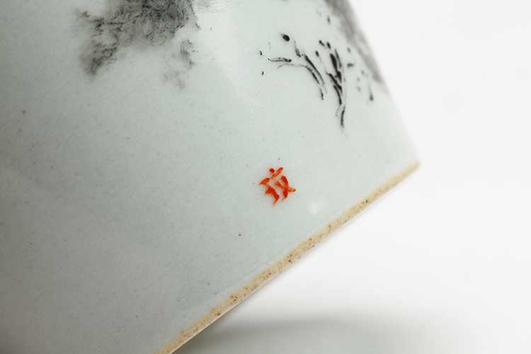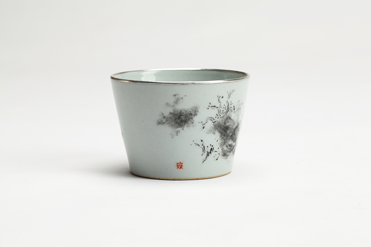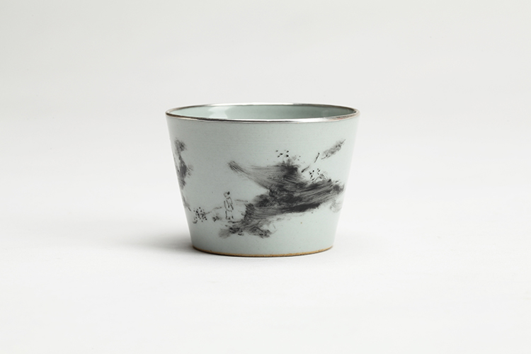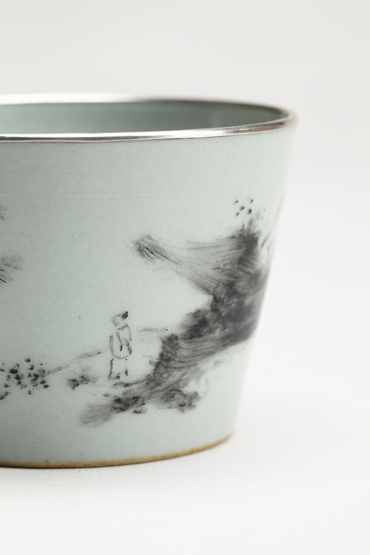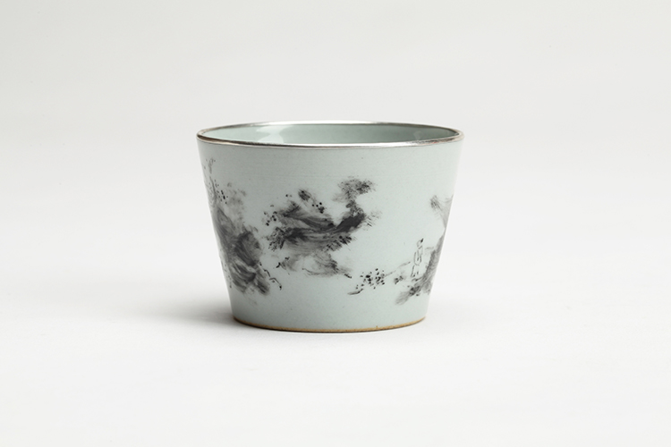 《等》仿古灰釉地,作者绘墨彩,墨色笔法、浓淡变化丰富,自由的书写,似风景又似云端,一人立于其中远眺,在等谁?
