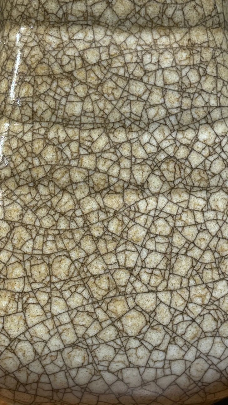 这是一件造型优雅、釉色开片生动柔美的黑胎哥窑灰青釉贯耳壶,灰青色釉质温润如玉,釉面具深黑色与褐色细双层网状开片,除圈足无釉露黑色胎体外,满釉覆盖全器,古青铜器贯耳壶形式典雅贵气,釉色温润、双层黑褐两色细开片流畅自然,具古籍描述哥窯釉“紫口铁足、金丝铁线”的特质,是宋代风格的文人案头赏瓶。