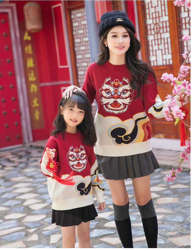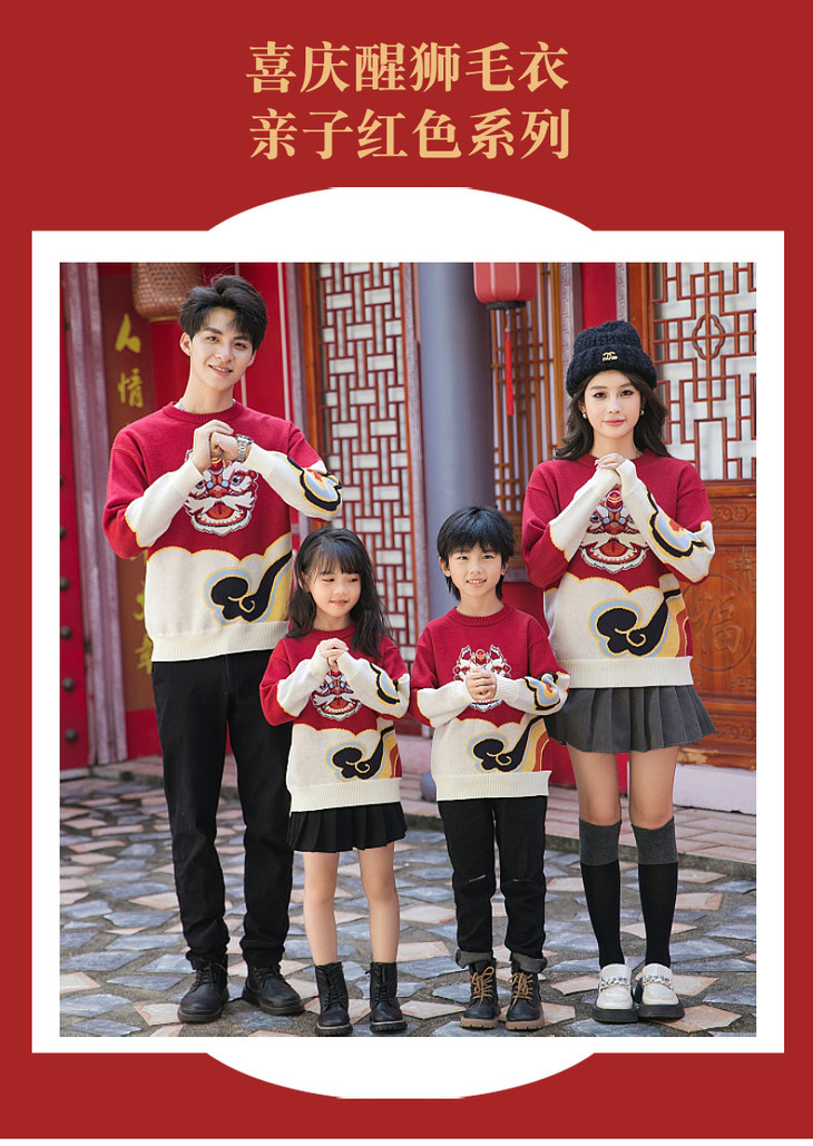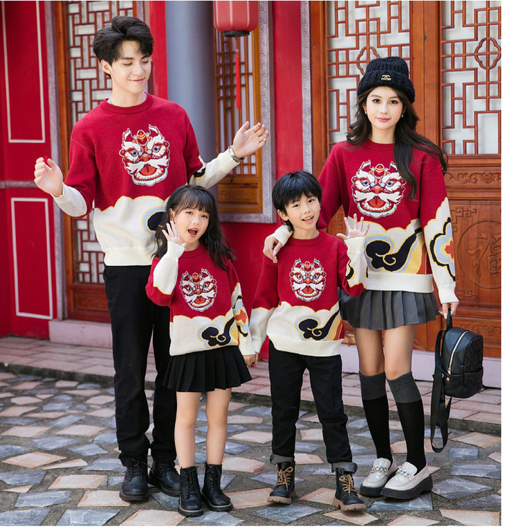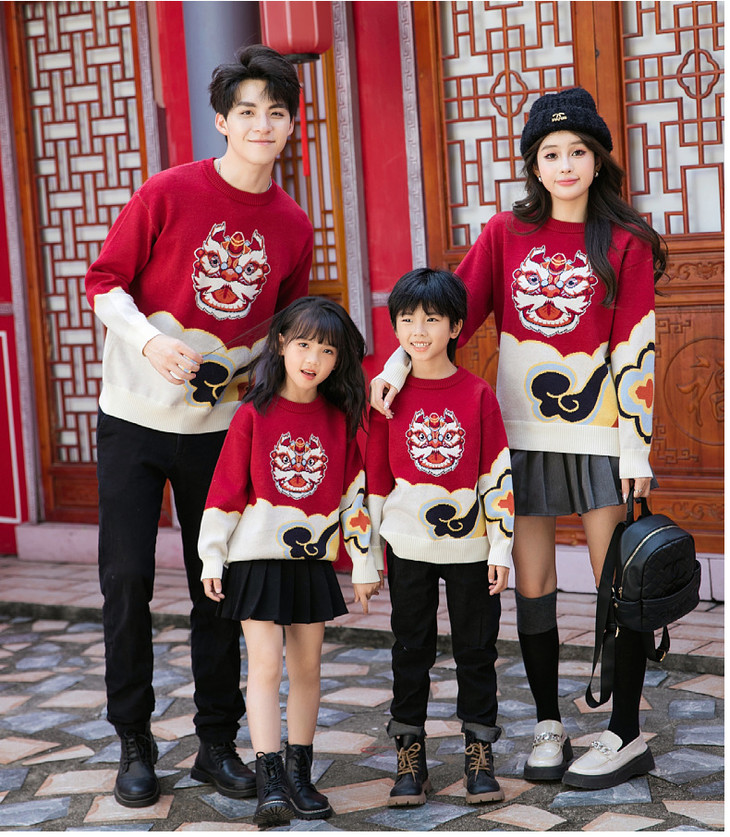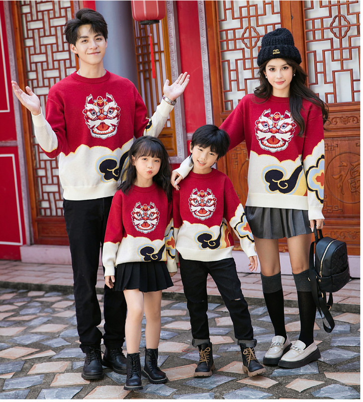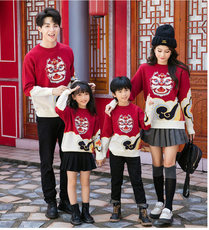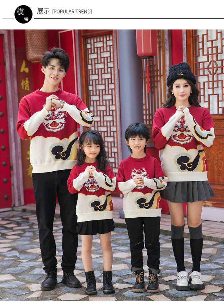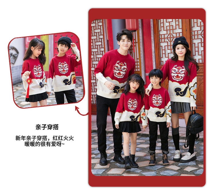 红色亲子装毛衣祥云款喜庆醒狮加厚圆领长袖一家三口四口家庭装_HLY