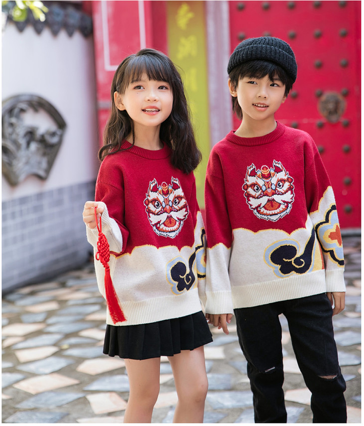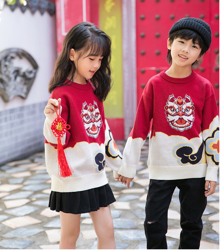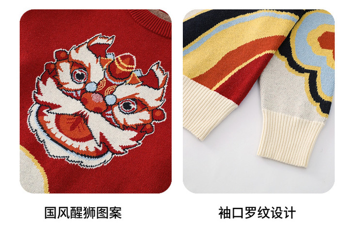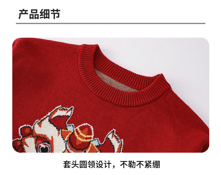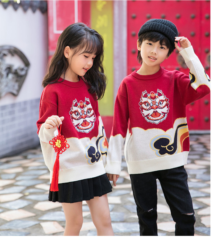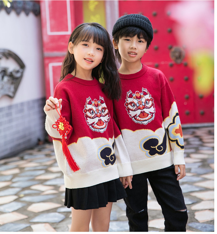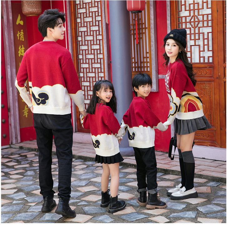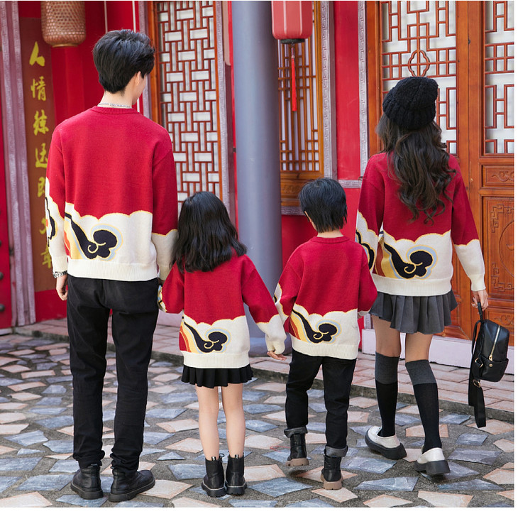 红色亲子装毛衣祥云款喜庆醒狮加厚圆领长袖一家三口四口家庭装_HLY