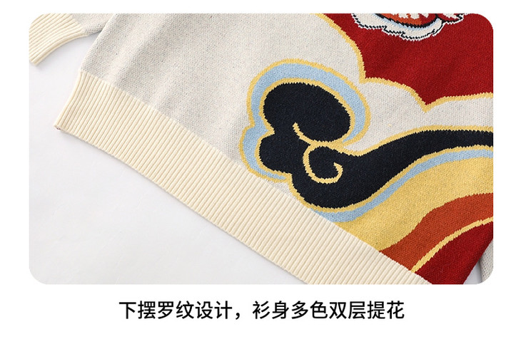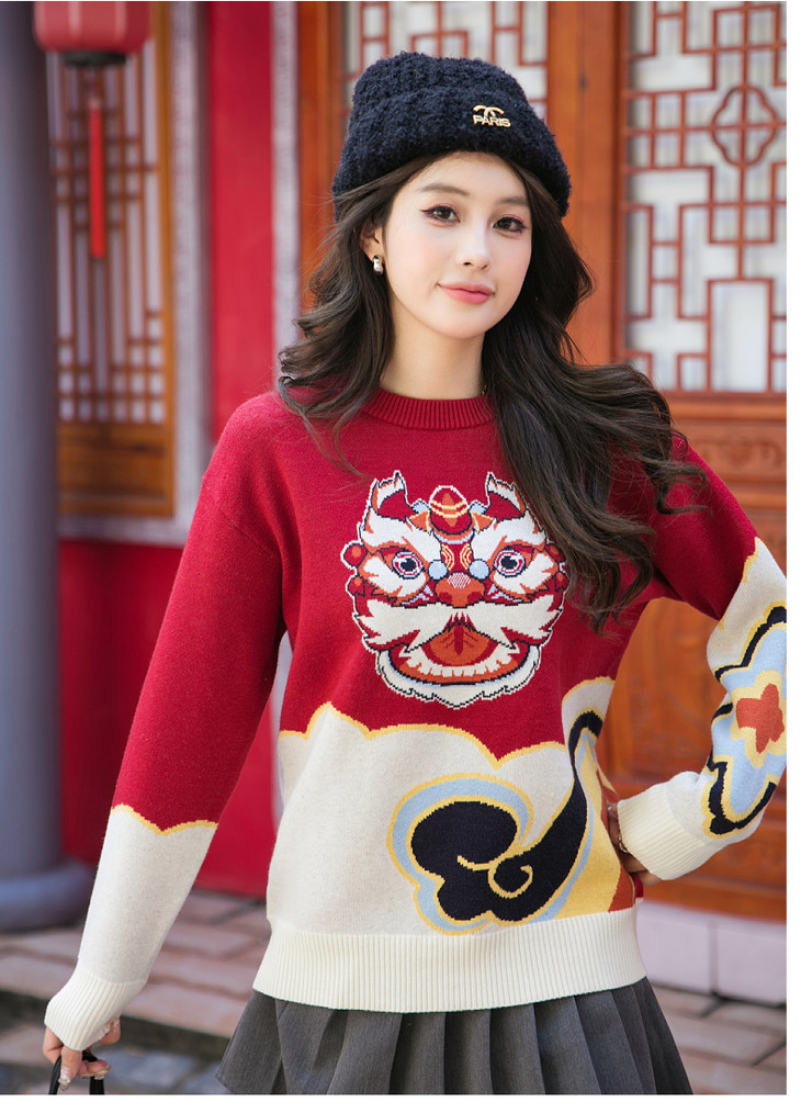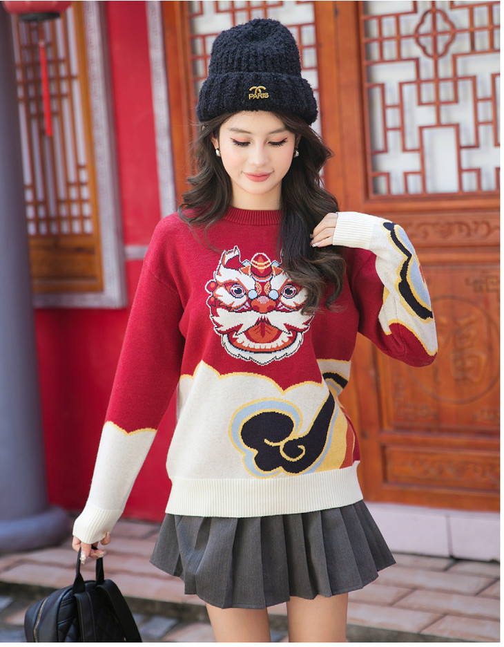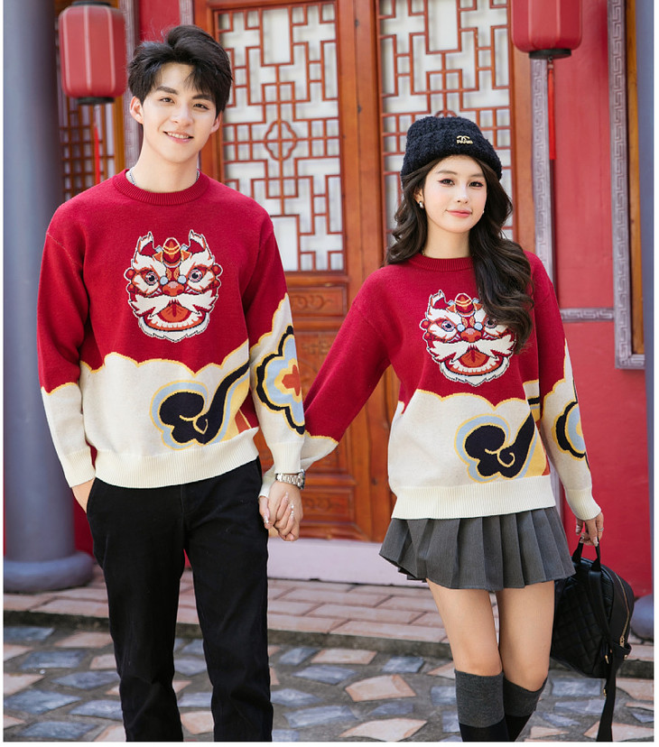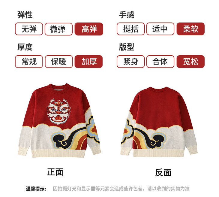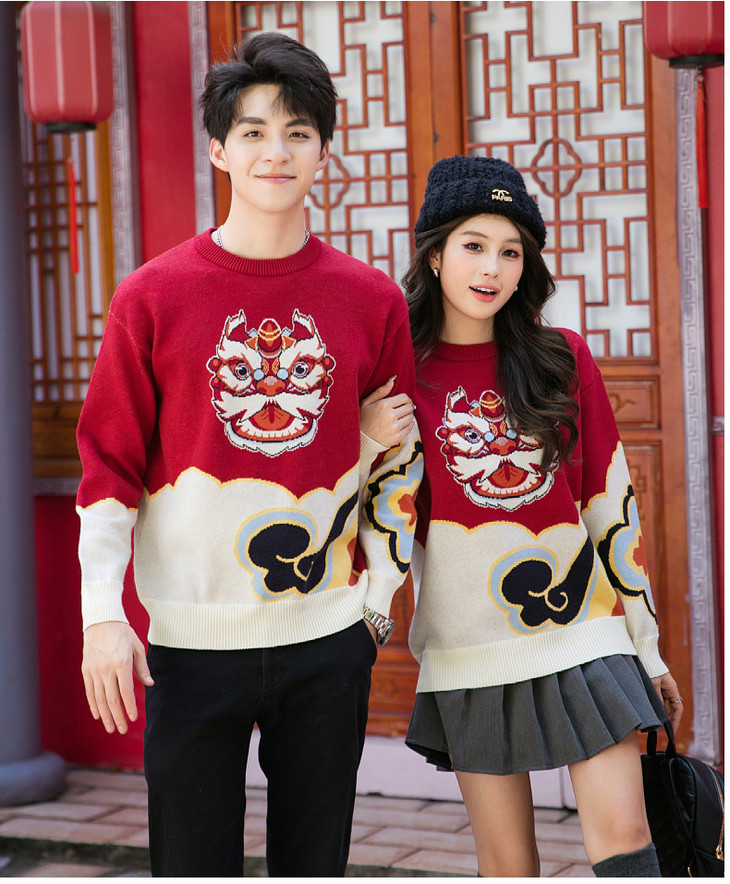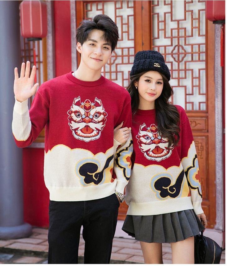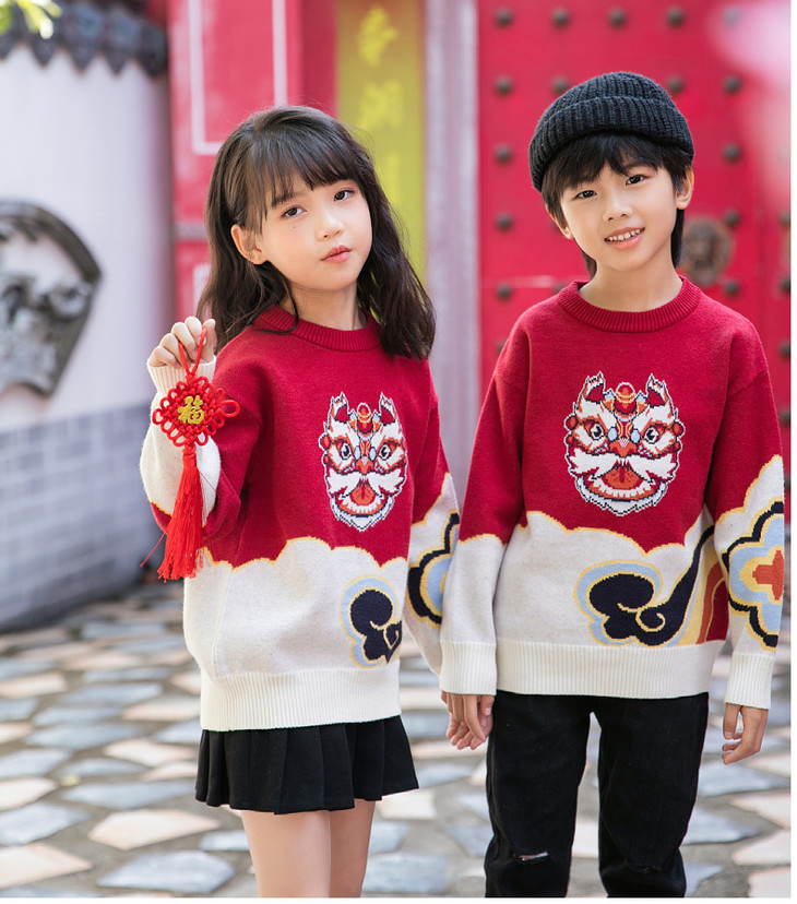 红色亲子装毛衣祥云款喜庆醒狮加厚圆领长袖一家三口四口家庭装_HLY