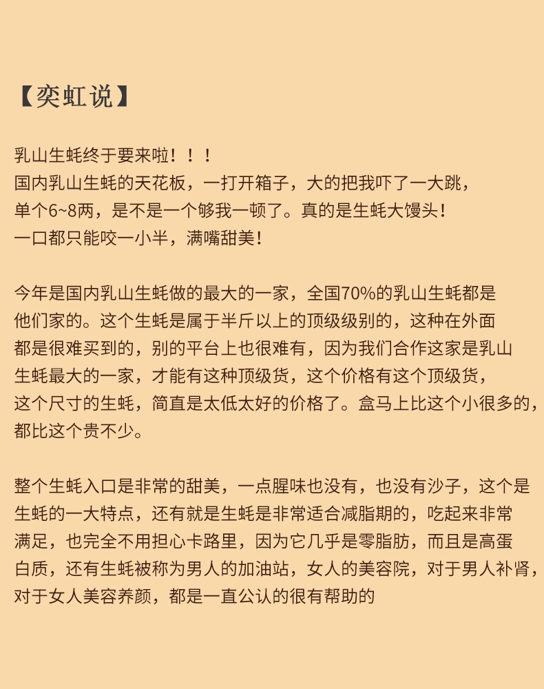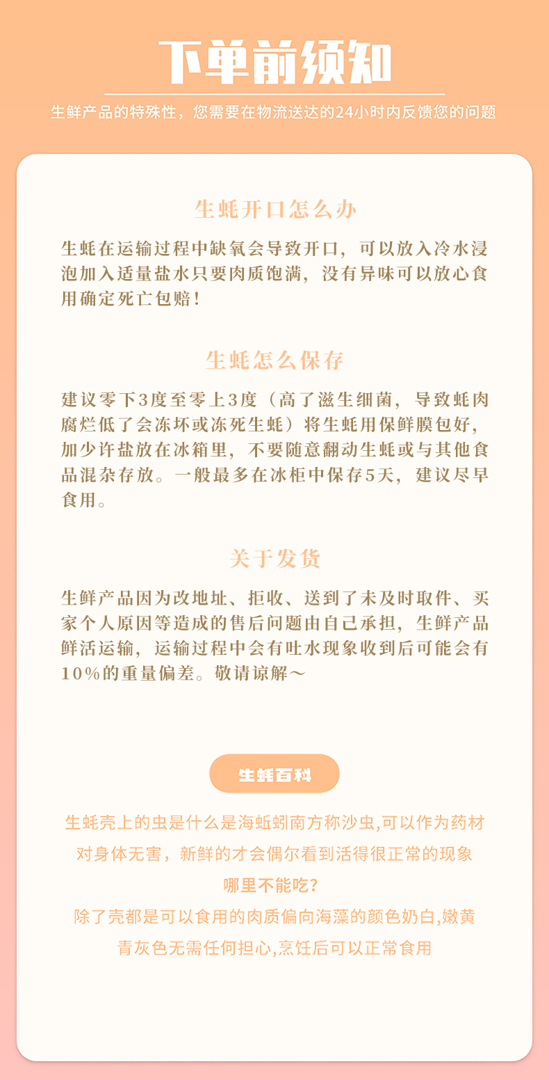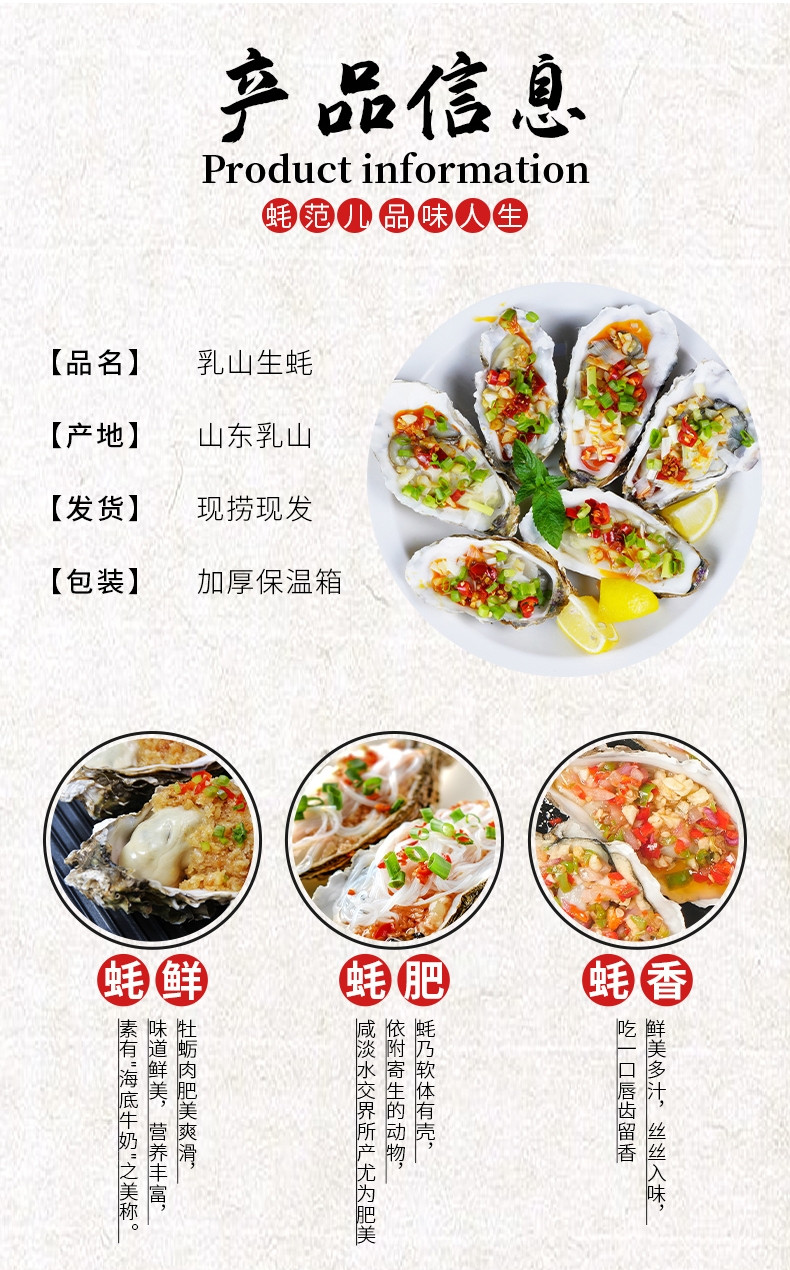 【温馨提示】生蚝对温度敏感,建议收到后尽快食用。新鲜的生蚝在温度很低的情况下,如零度下的时候,还可以多存活 5-7 天,但是其肥度就会降低,口感也会有变化,所以尽量不要存放,现买现吃。