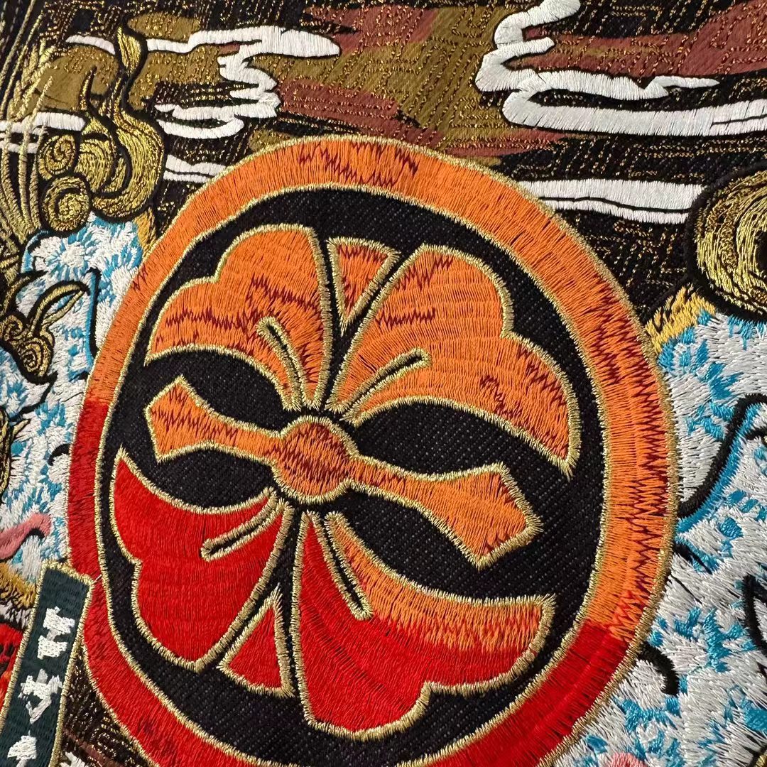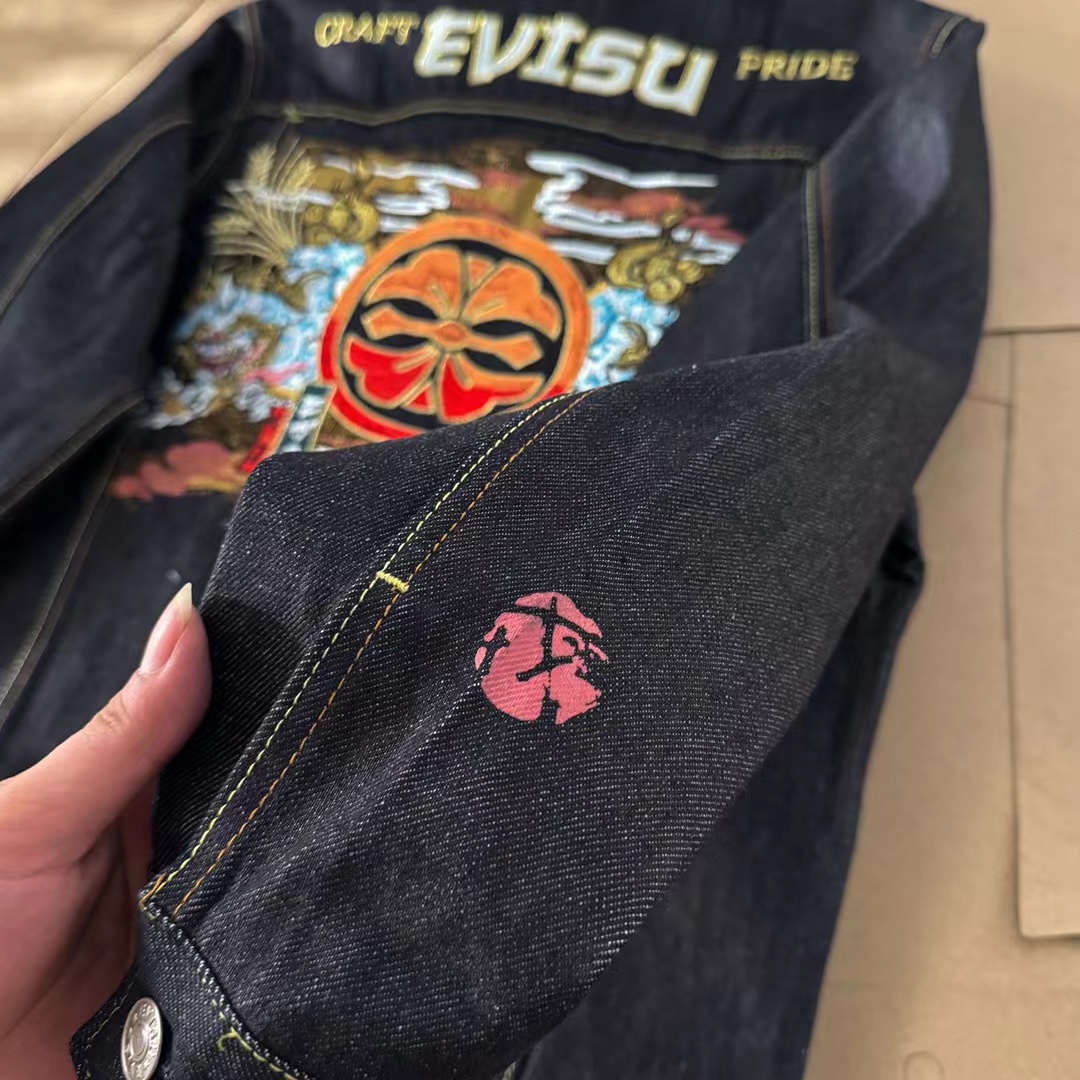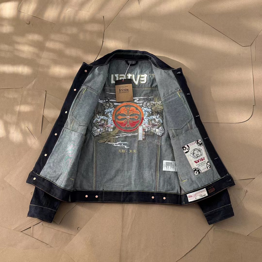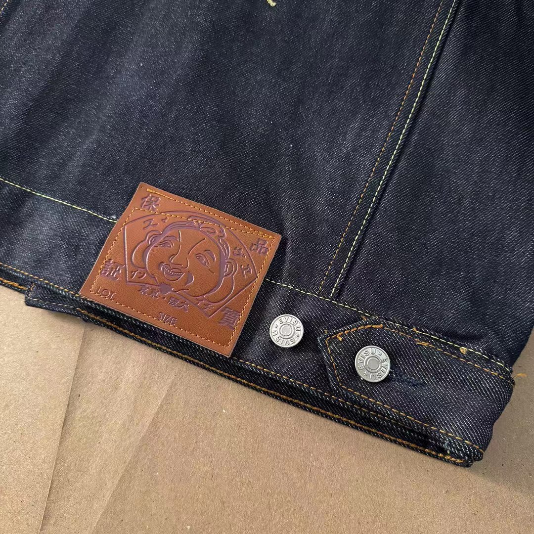 25SS男士双狛犬刺绣牛仔夹克 以守护神社的日本传说瑞兽狛犬为主题,原色牛仔外套背面以夕阳家花、双狛犬与黄金五谷图案刺绣装饰,加上织锦小海鸥和商标贴布,为单品添上华丽贵气。原色重磅原版复刻赤耳面料、胸前订制樱花扣 版型偏大 洗水后原浆面料都会缩水