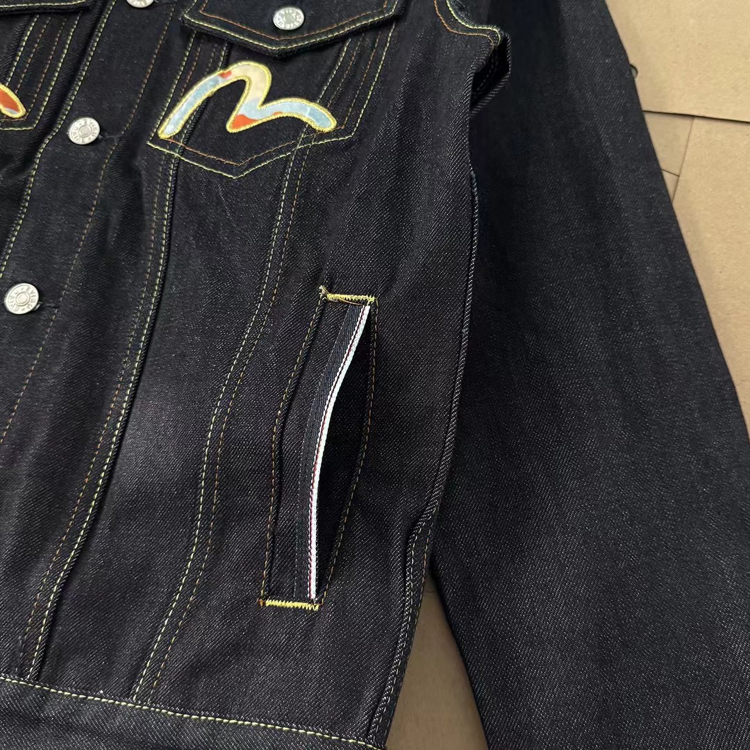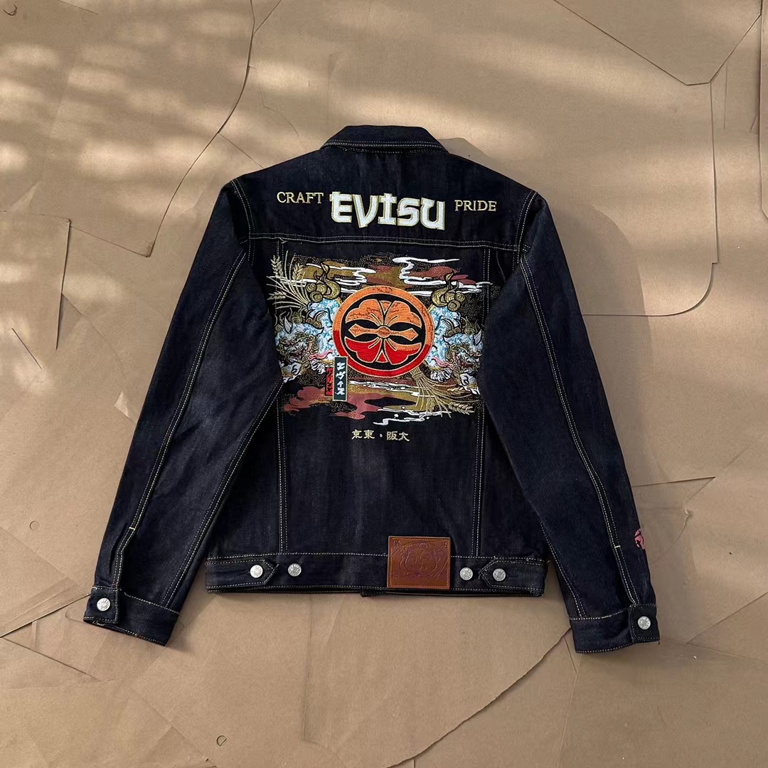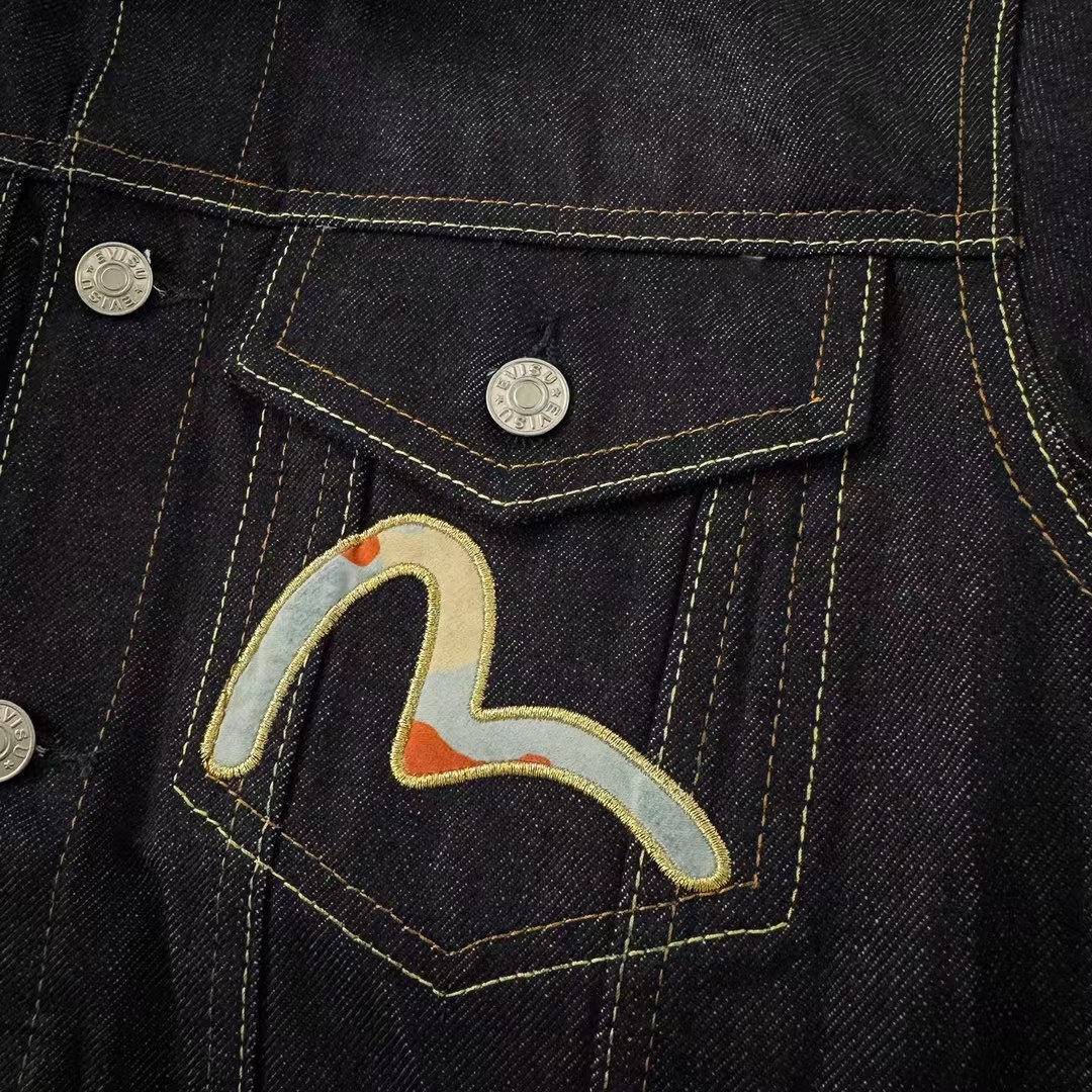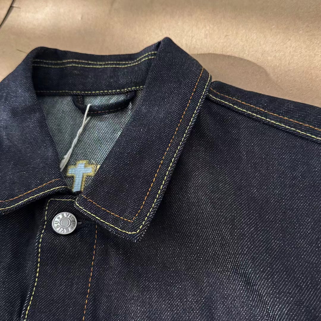 25SS男士双狛犬刺绣牛仔夹克 以守护神社的日本传说瑞兽狛犬为主题,原色牛仔外套背面以夕阳家花、双狛犬与黄金五谷图案刺绣装饰,加上织锦小海鸥和商标贴布,为单品添上华丽贵气。原色重磅原版复刻赤耳面料、胸前订制樱花扣 版型偏大 洗水后原浆面料都会缩水