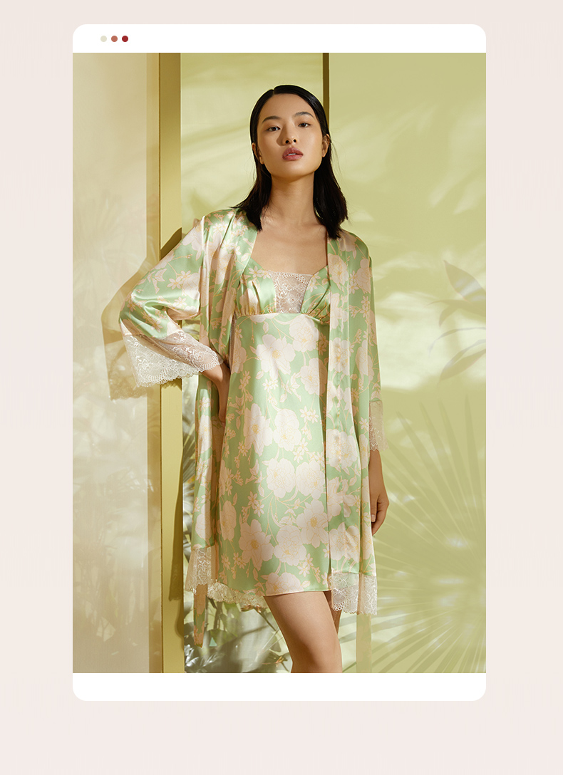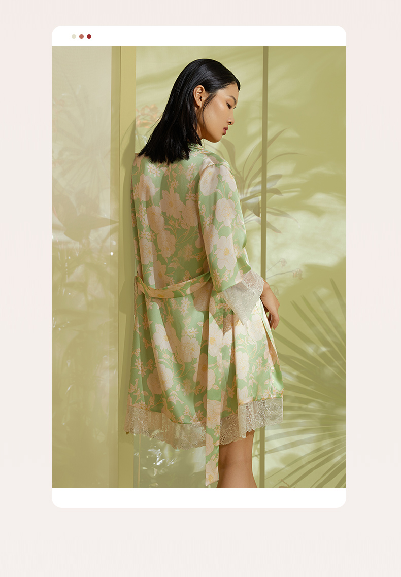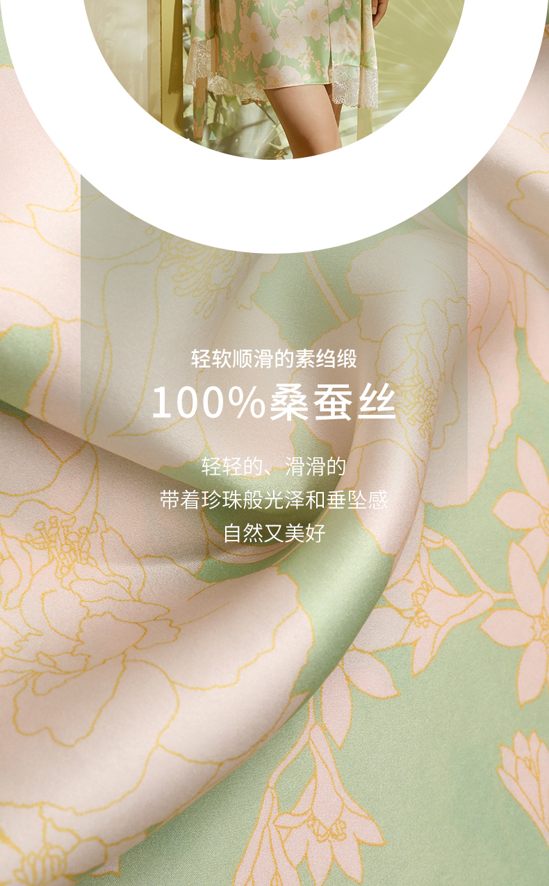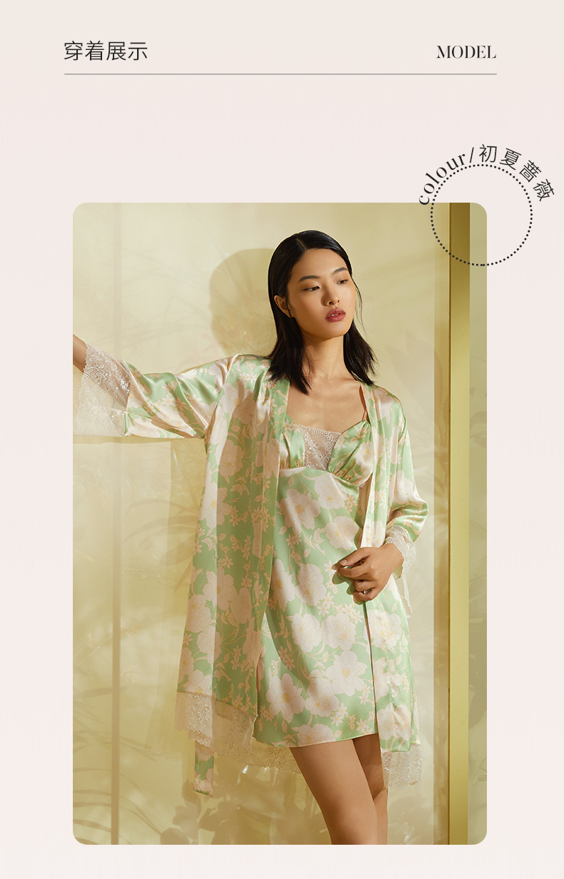 金三塔00%桑蚕丝春意盎然真丝印花拼蕾丝女士家居服睡袍单袍 YSFCA104