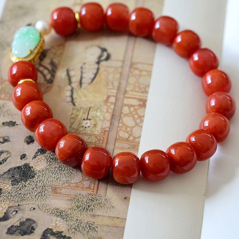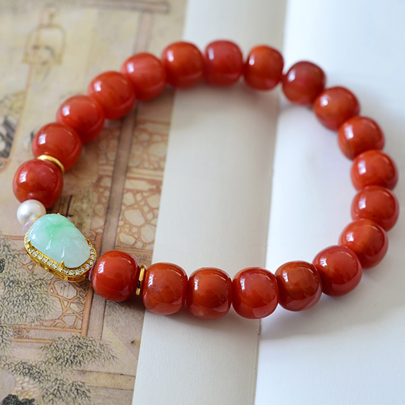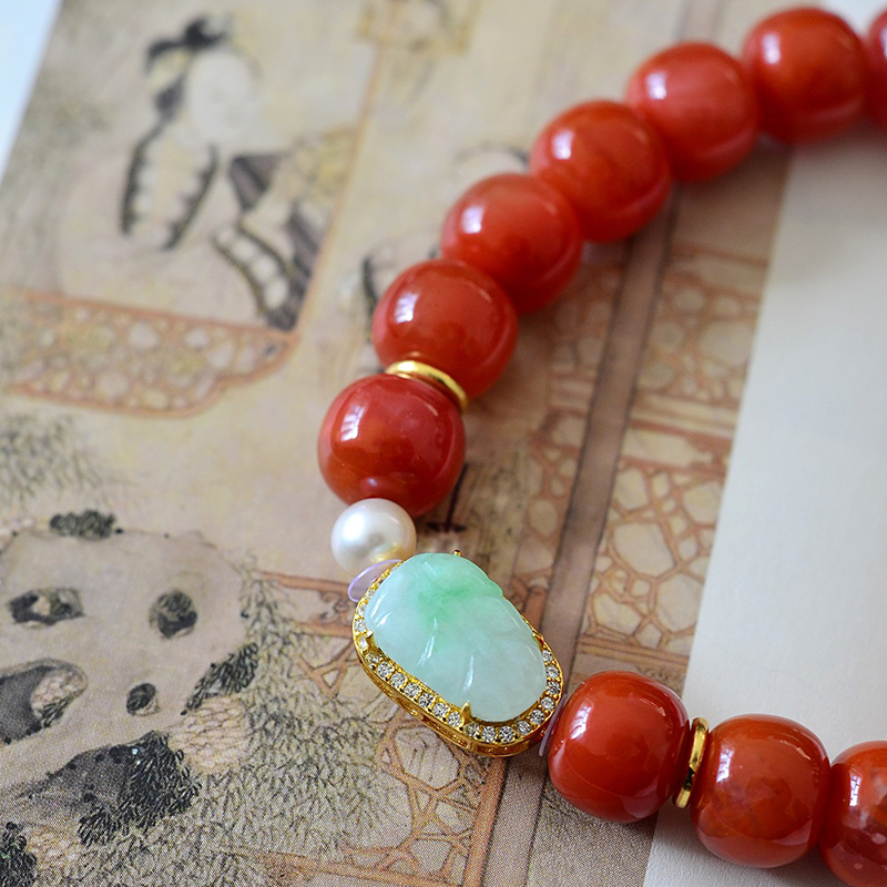 天然南红老型珠8*10,天然翡翠,古法银鎏金镶嵌,天然淡水珍珠