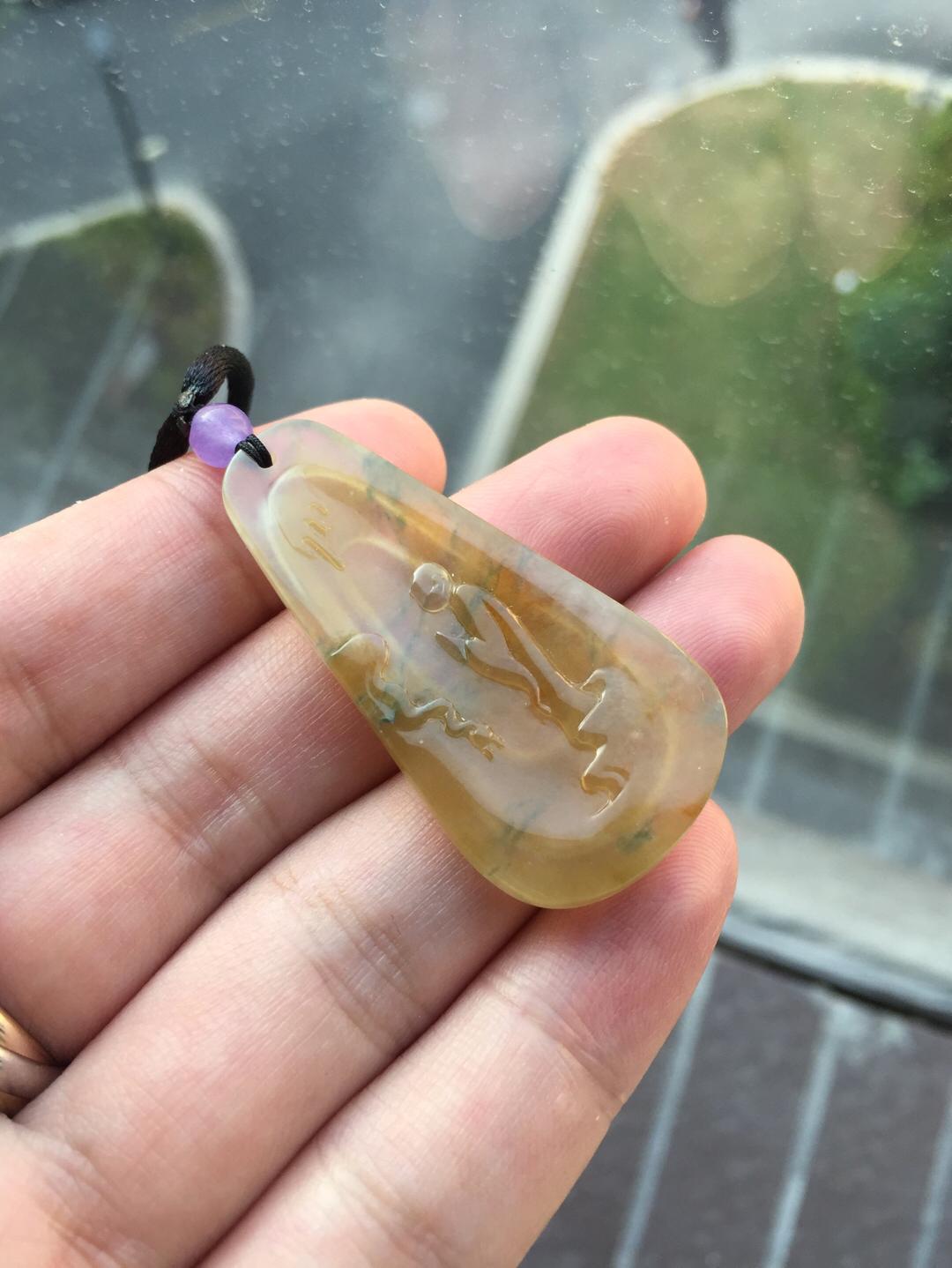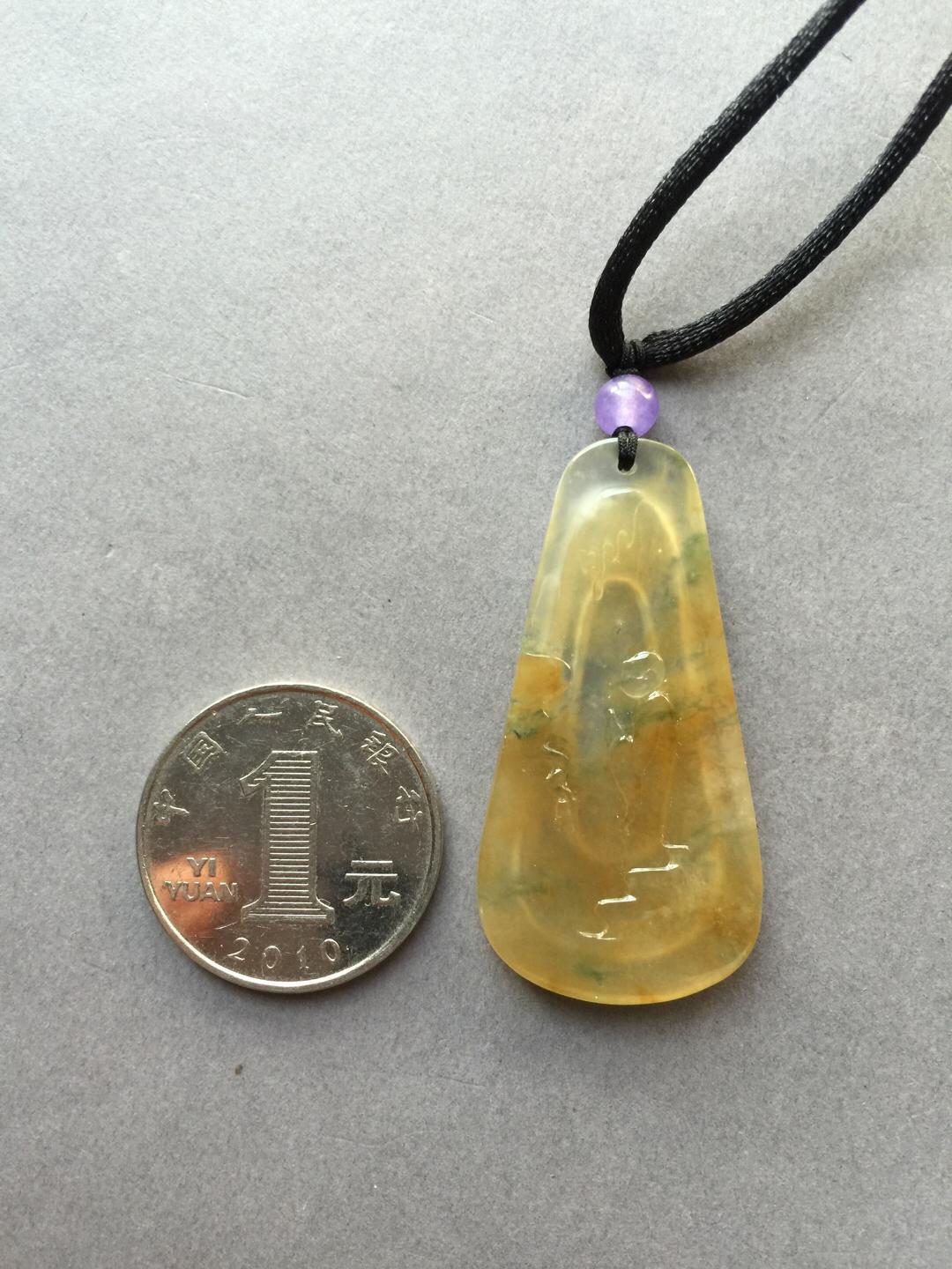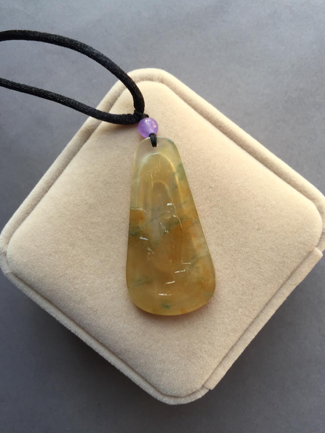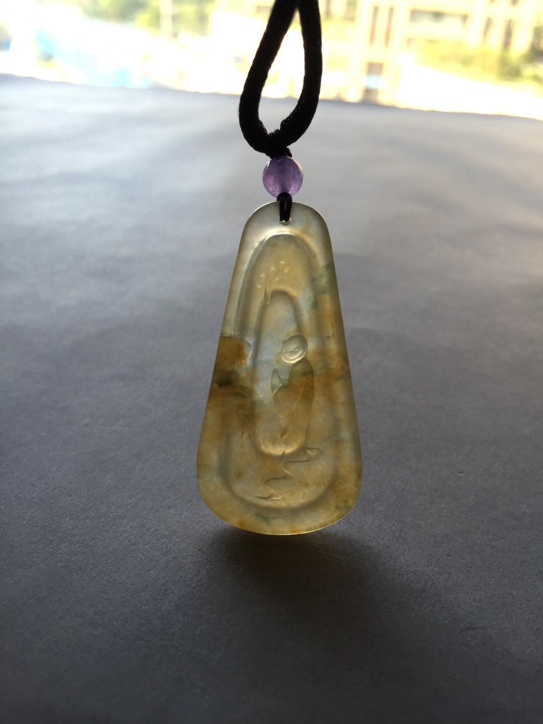 冰种黄翡禅心,气质精品,太特别了,独具东方韵味,儒雅之作,44.3*22.3*4.5mm雕刻灵动写意,黄翡飘绿花,种水好,荧光四射,对于高种水黄翡来说这是大件了,很少有机会看到这样特别的大件黄翡作品,不可多得,推荐