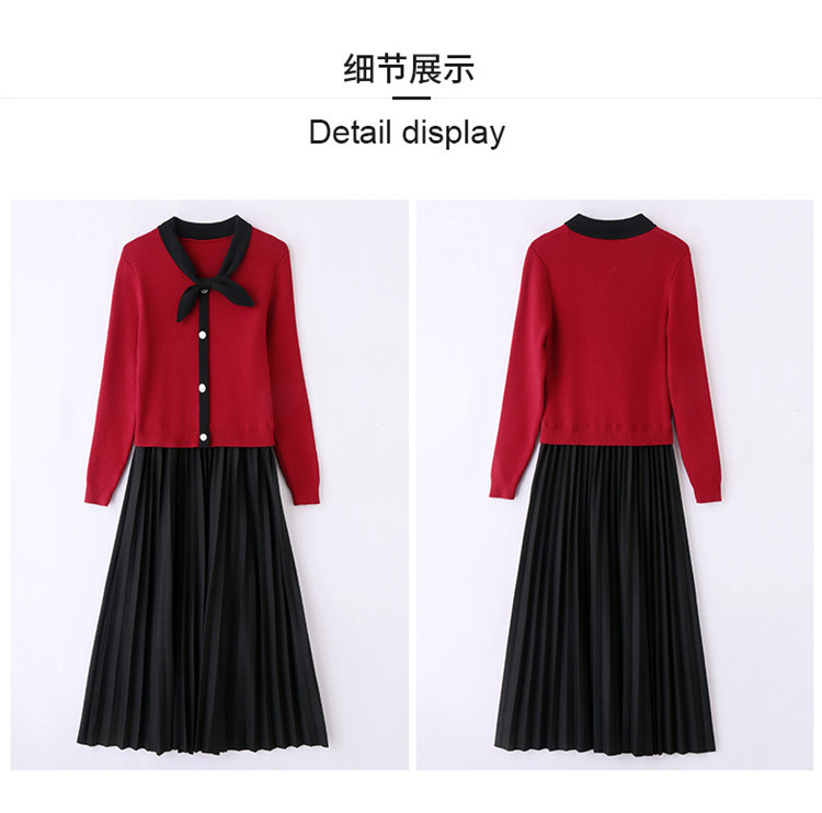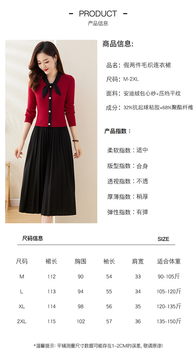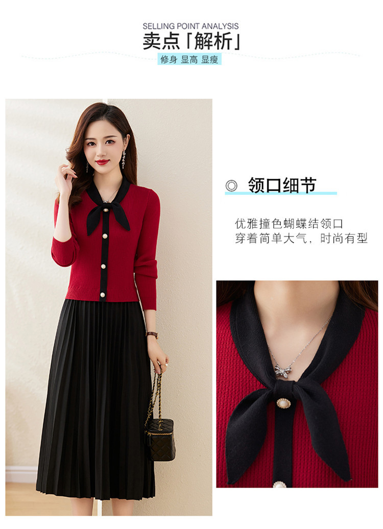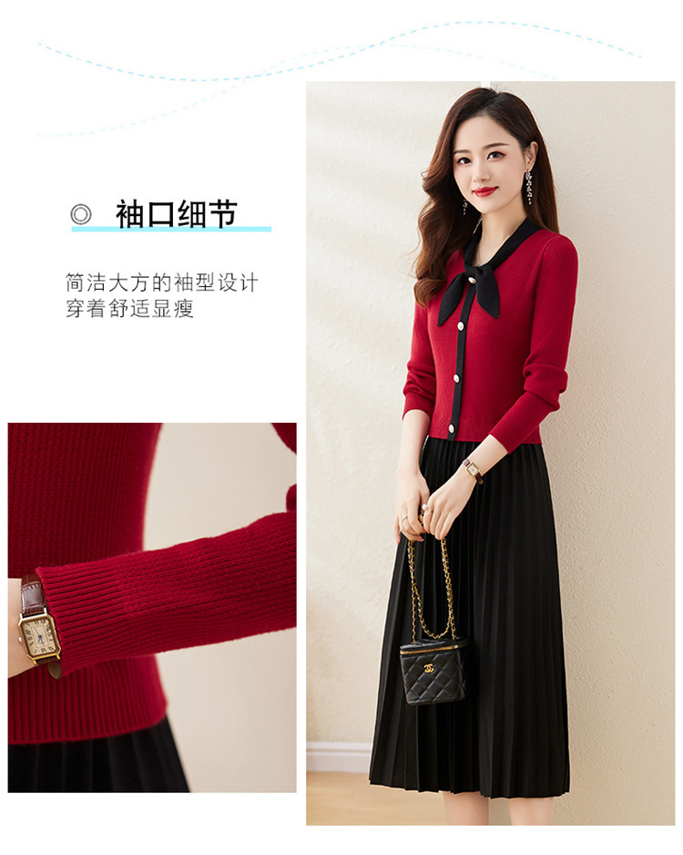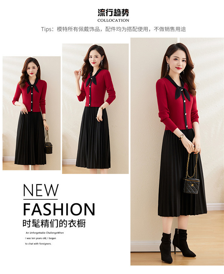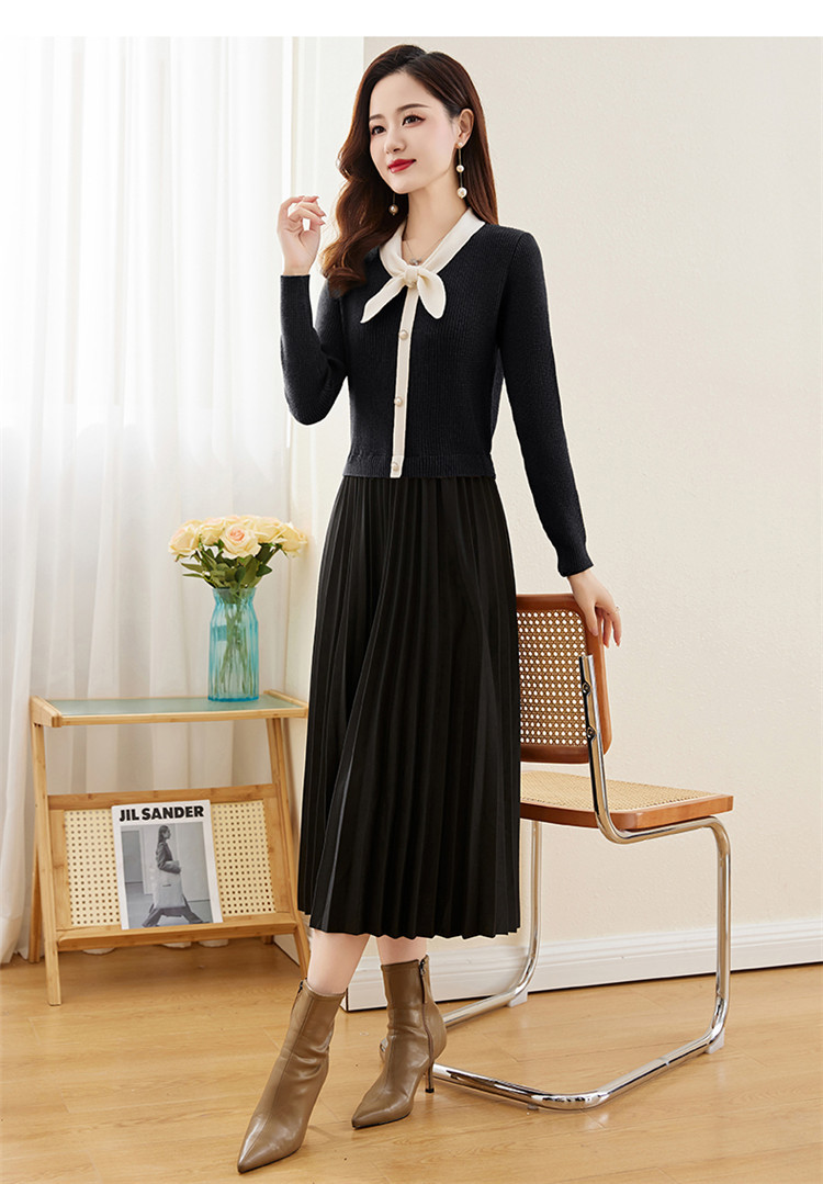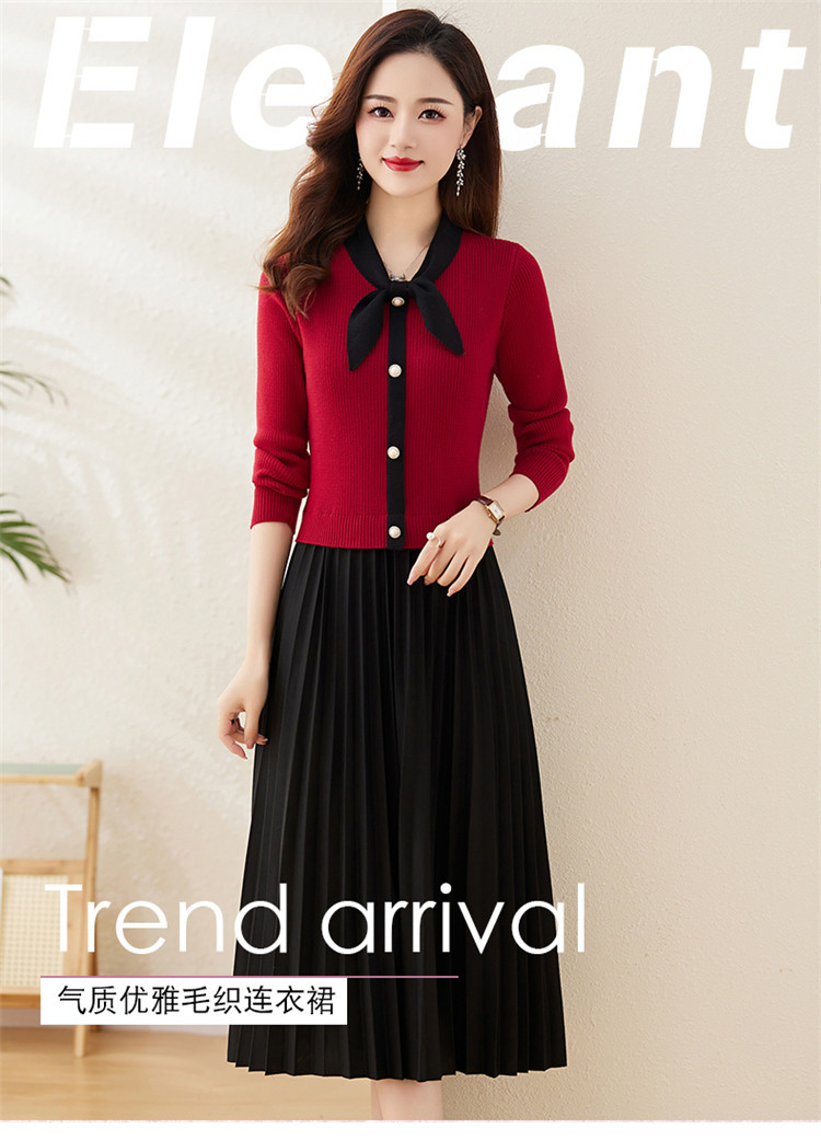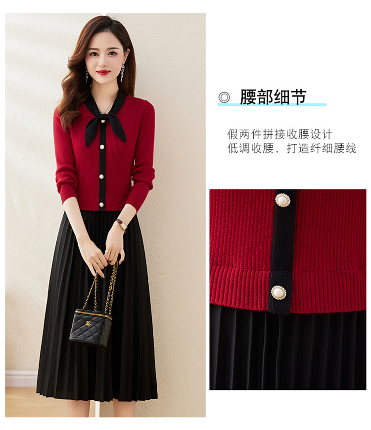 HR-WM21719冬上新气质时尚蝴蝶结领口拼接撞色假两件修身显瘦连衣裙