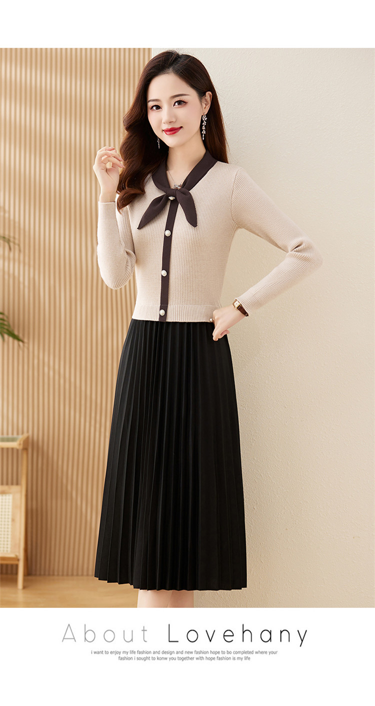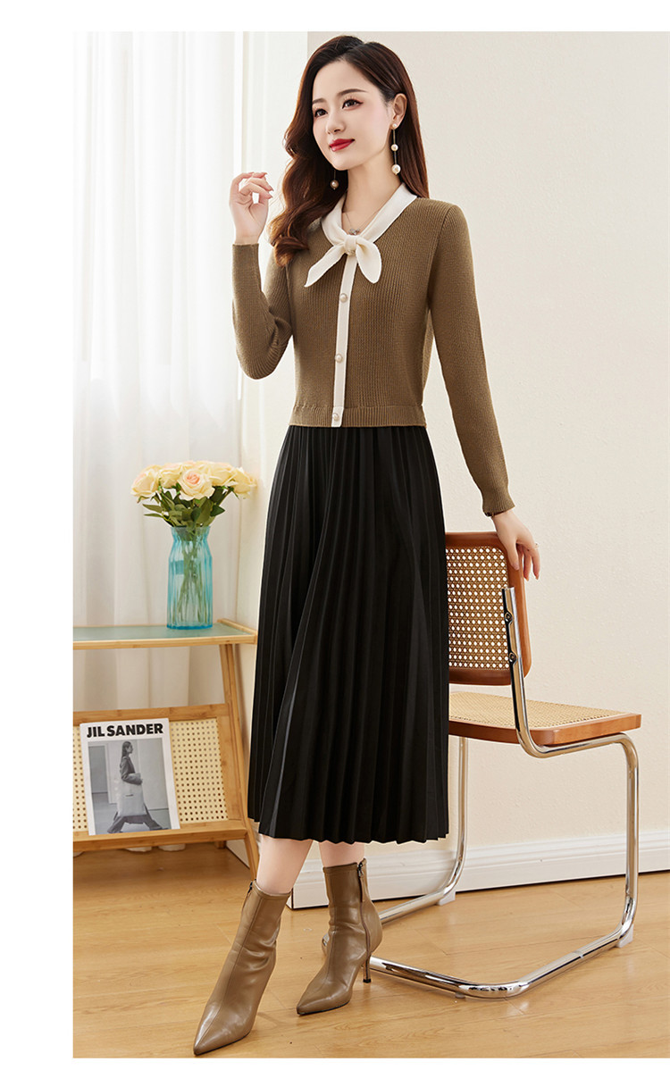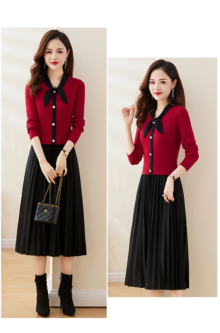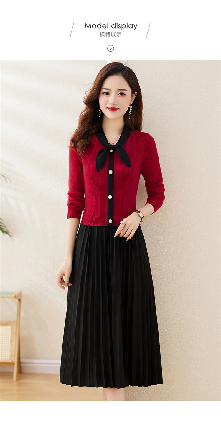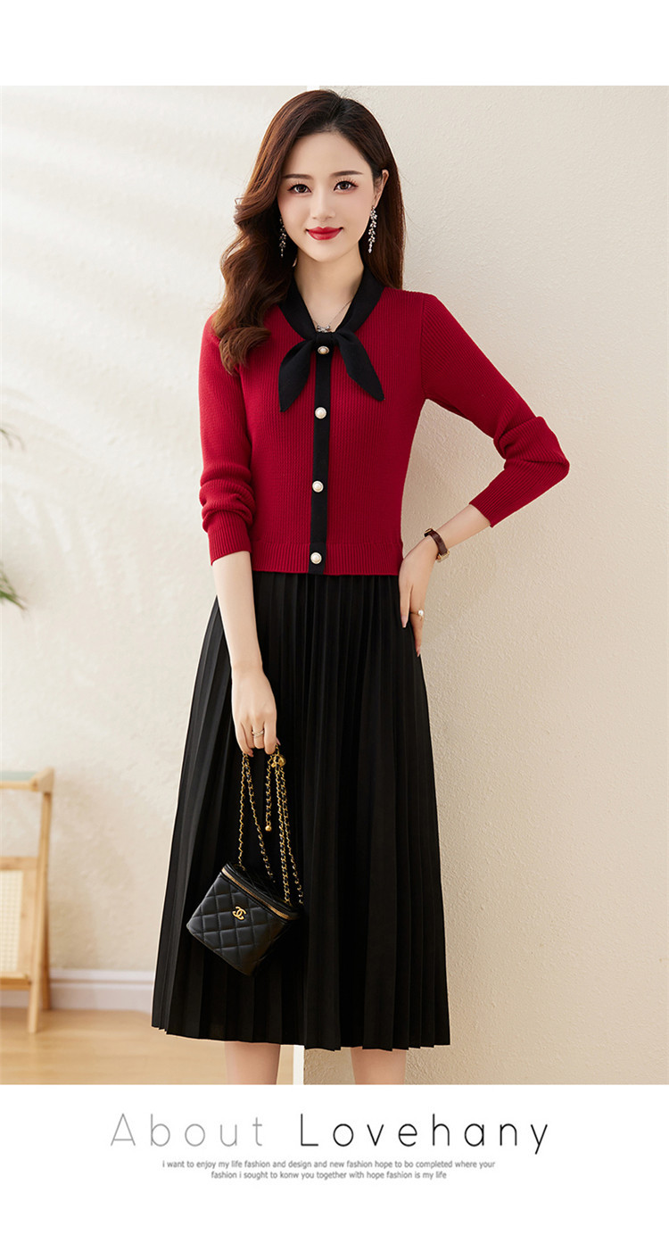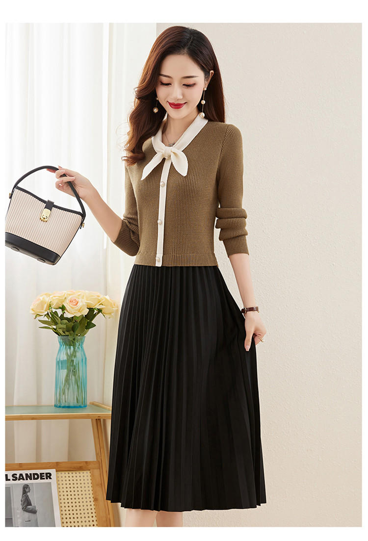 HR-WM21719冬上新气质时尚蝴蝶结领口拼接撞色假两件修身显瘦连衣裙