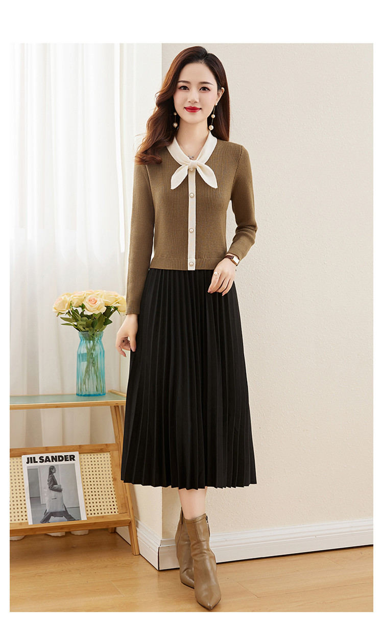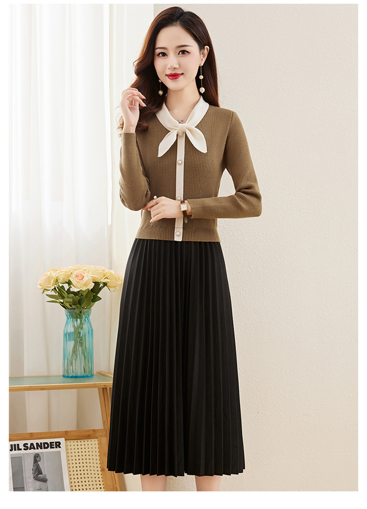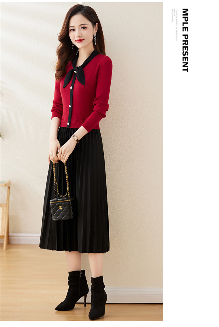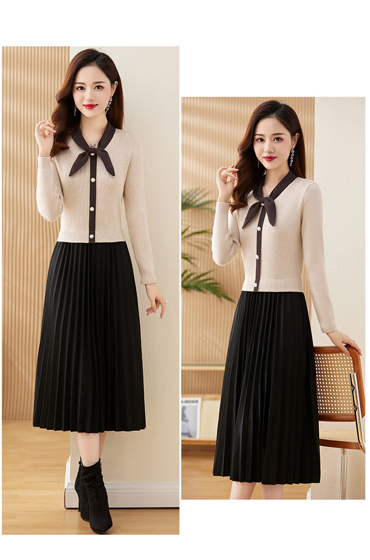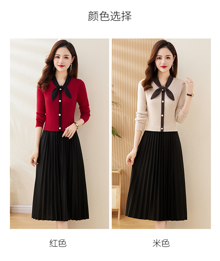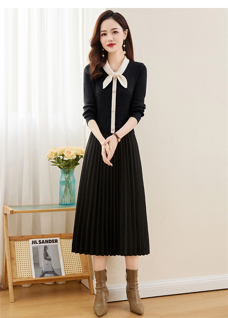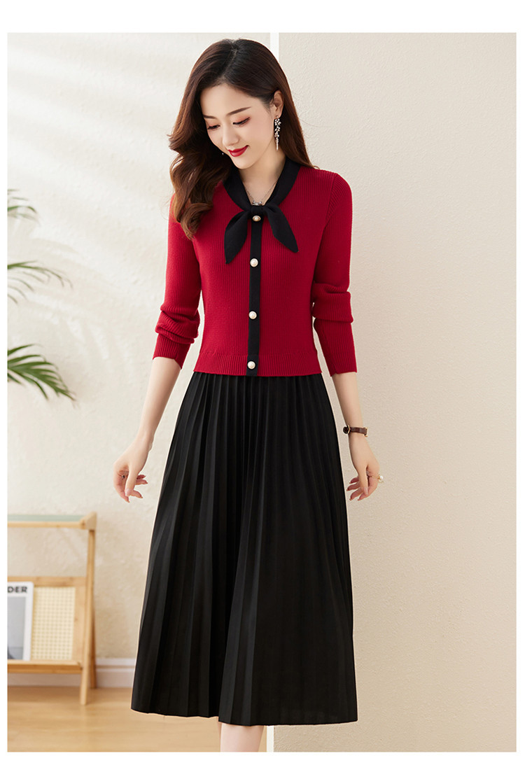 HR-WM21719冬上新气质时尚蝴蝶结领口拼接撞色假两件修身显瘦连衣裙