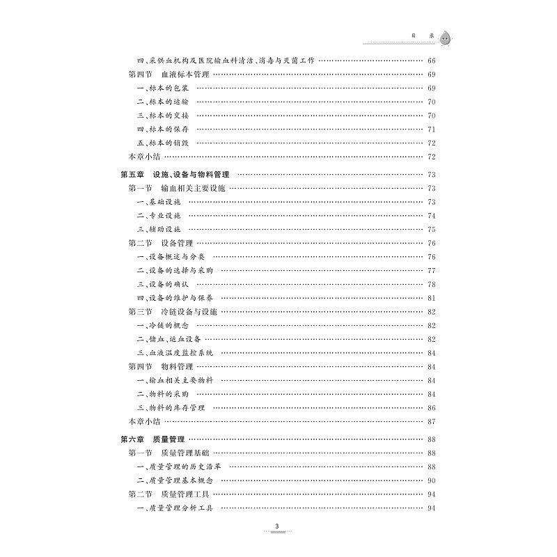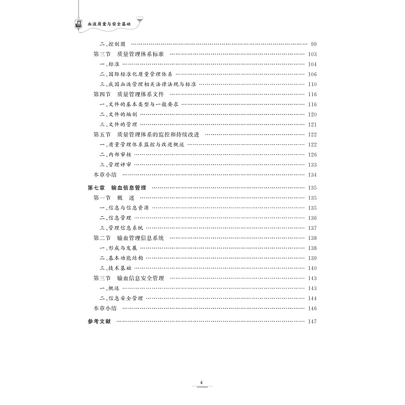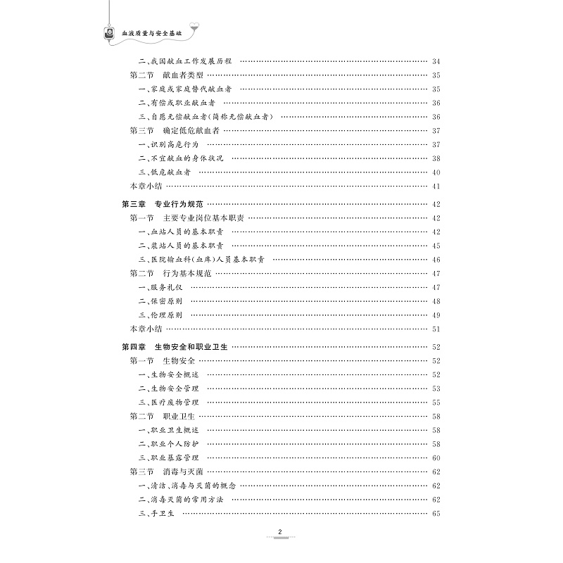 分为七章,第一章主要讲述血液的组成、血液的理化特性、血液的生理功能、红细胞血型系统等内容;第二章主要讲述无偿献血的发展历程、献血者分类、如何确定低危献血者、第三章讲述专业岗位的基本职责、专业行为基本规范;第四章讲述输血医学生物安全、职业卫生、消毒与灭菌、血液标本管理;第五章主要讲述输血相关主要设施设备的管理、关键物料管理;第六章主要讲述质量管理基础、质量管理工具、质量管理体系标准、质量管理体系文件、质量体系的监控和持续改进;第七章主要讲述输血医学涉及的信息化管理和相关安全管理。本册书的构思和系统组成都是原创内容,是系列丛书的理论基础。
