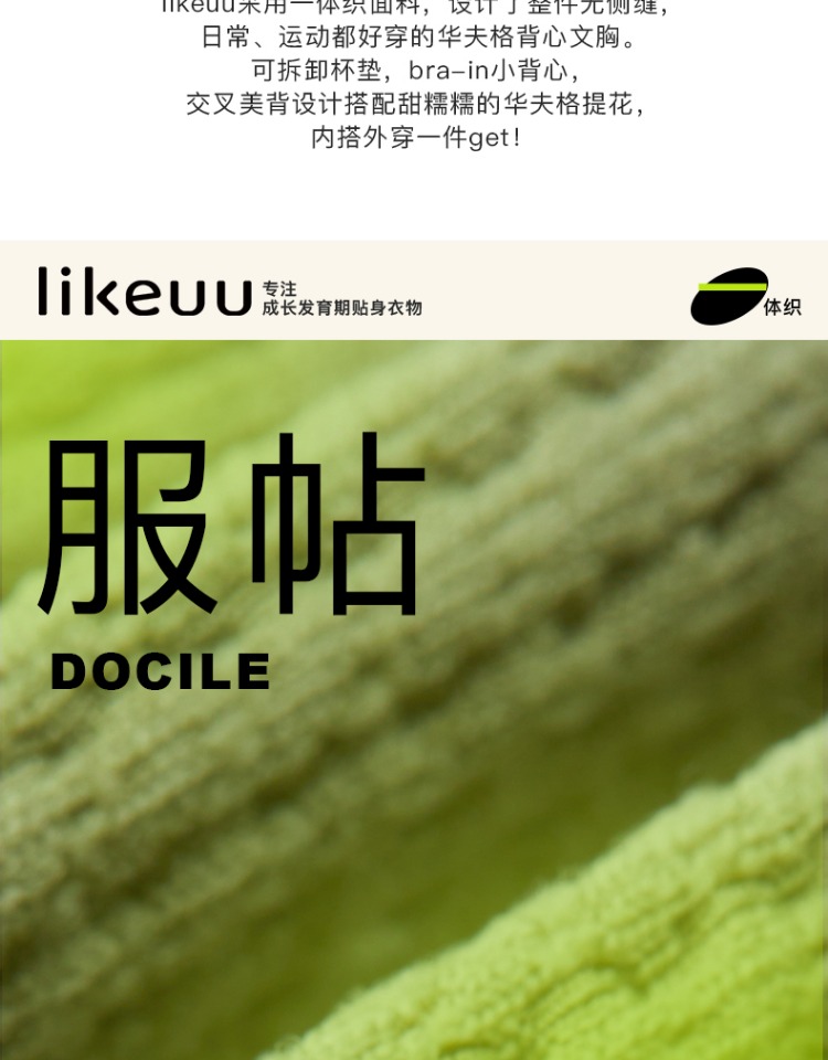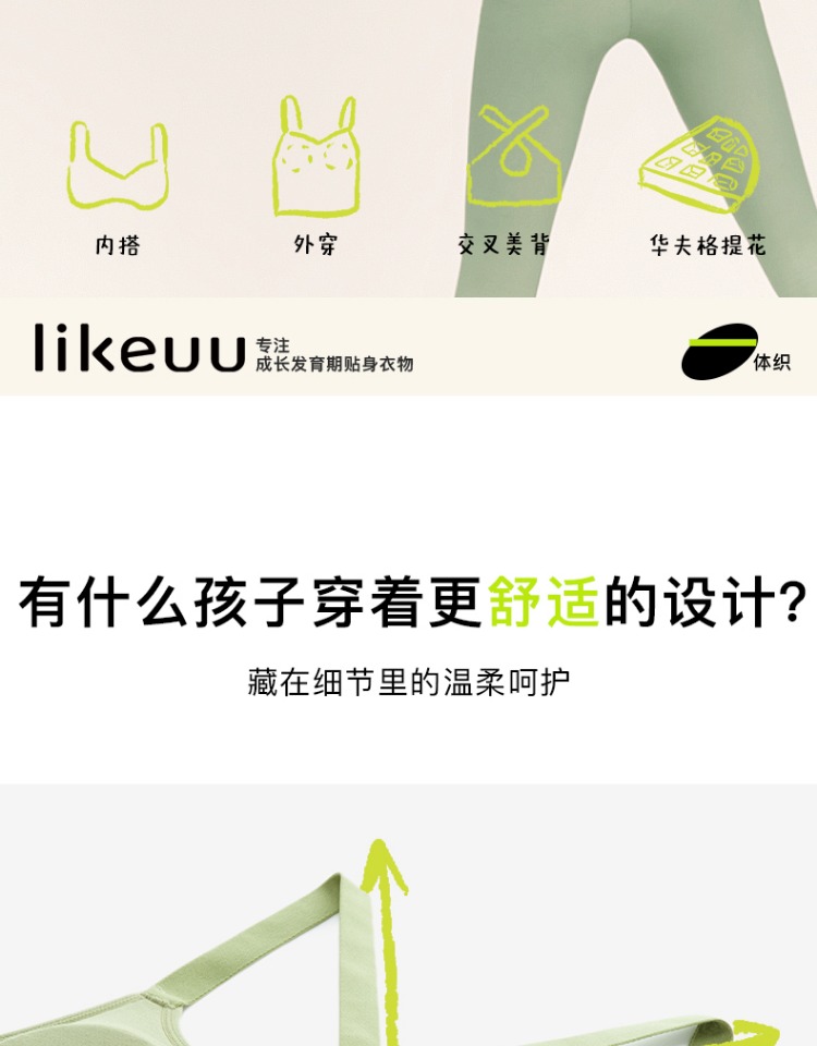 - likeuu是专注于为6~15岁的青少年创造柔软、无束缚的成长体验,以好奇心为灵感的成长发育期贴身衣物品牌。likeuu的产品覆盖内衣、内裤、保暖衣、家居服、运动等品类。