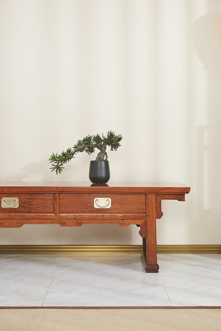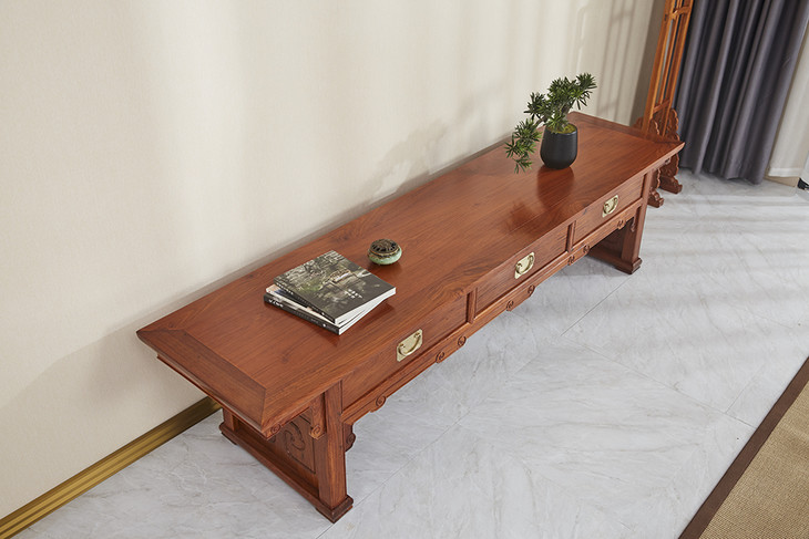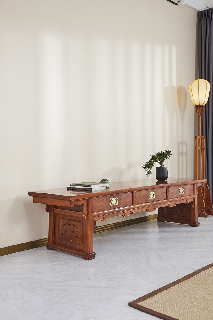 随着时代的发展,生活习惯的改变,这款炕案被广泛作电视柜使用,王款电视柜端庄大方,静穆,简俊,接近两米的长度,五十左右的高度,与主流电视柜尺寸不谋而合,传统器型的电视柜,多从明清家具中汲取设计灵感,可搭配花架或架格,求实求雅,皆是生活情趣之所在。