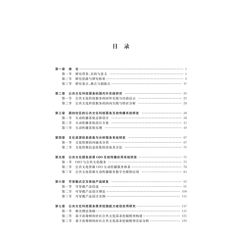 包括三篇:上篇为公共文化科技服务能力建设与绩效评估理论与实践基础(绪论),中篇为公共文化科技服务系统和产品研发,下篇为公共文化科技服务能力建设与绩效评估应用示范。具体内容为:上篇包括绪论、公共文化科技服务国内外实践、上城区公共文化科技服务主要做法;中篇包括基于社区的公共文化科技服务智能决策系统研发、面向社区的公共文化科技服务互动传播系统研发、文化资源信息收集与分析服务系统研发、公共文化服务资源O2O互动传播应用系统研发、可穿戴式交互体验产品研发;下篇包括公共文化科技服务需求识别能力建设应用研究、公共文化科