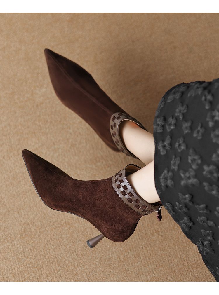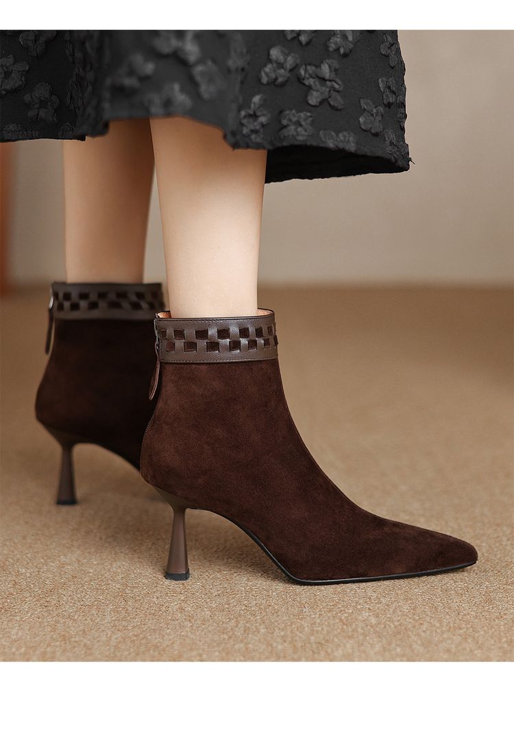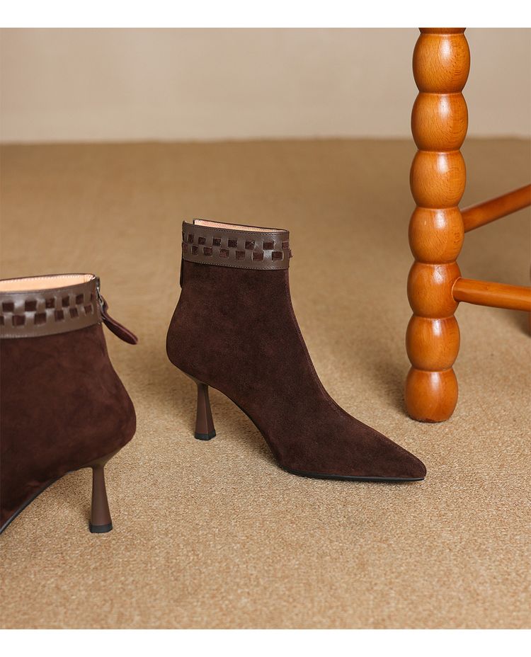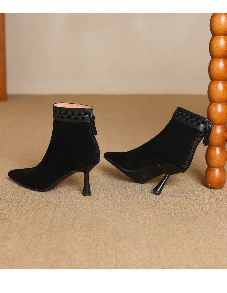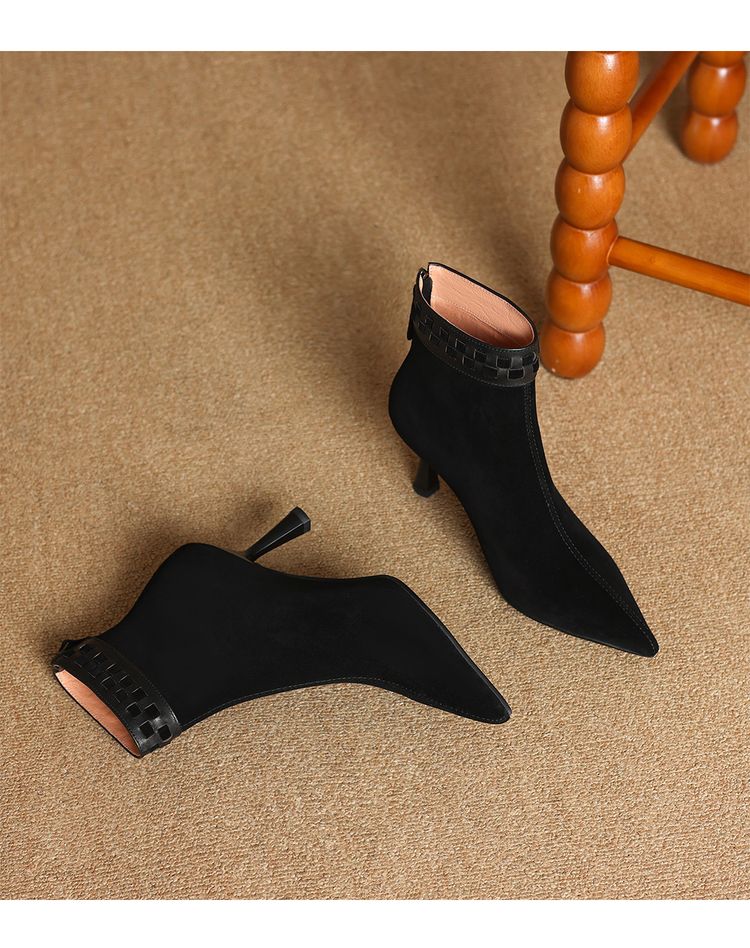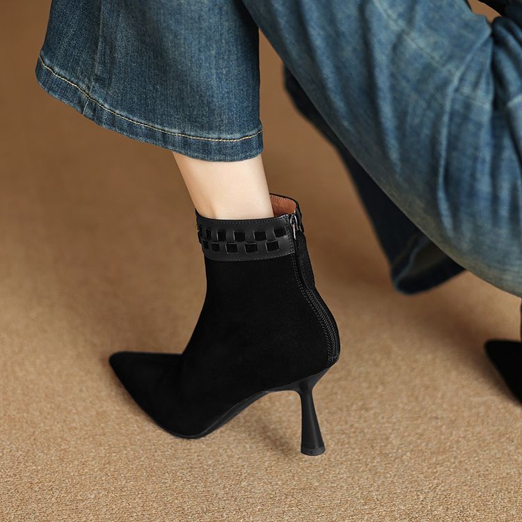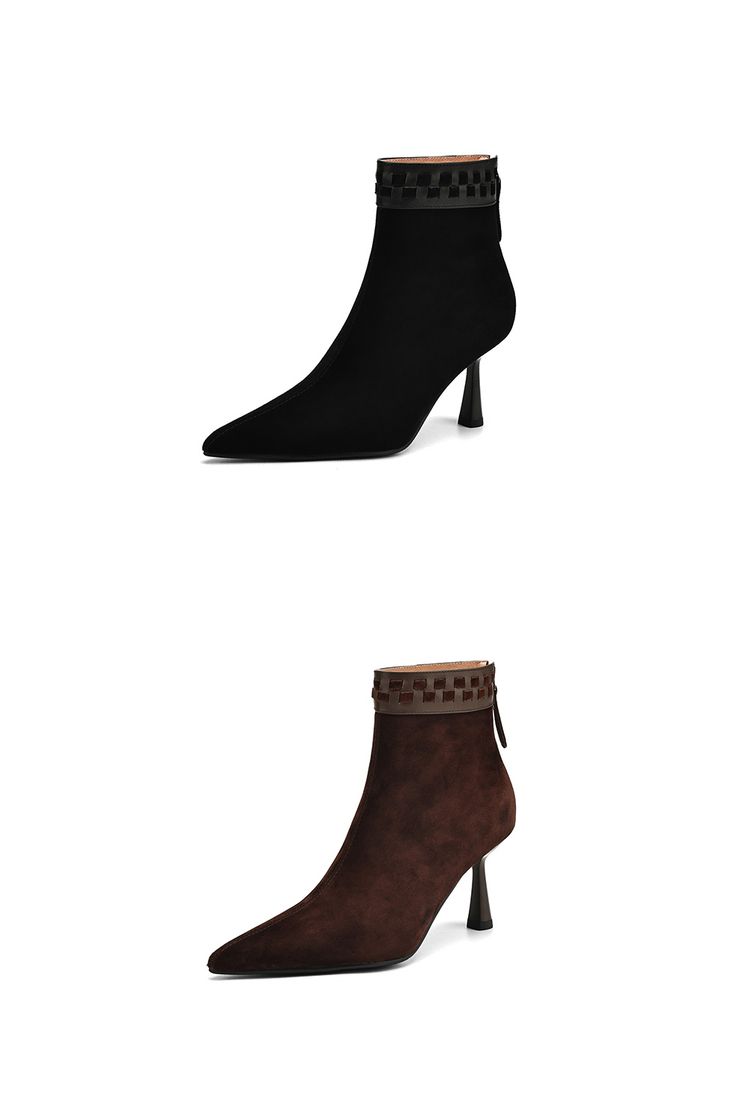 【预售5天】秋冬新款羊翻皮编织尖头瘦瘦时装靴高跟鞋配裙子加绒细跟短靴女SLLK&sl-7813