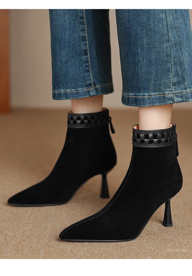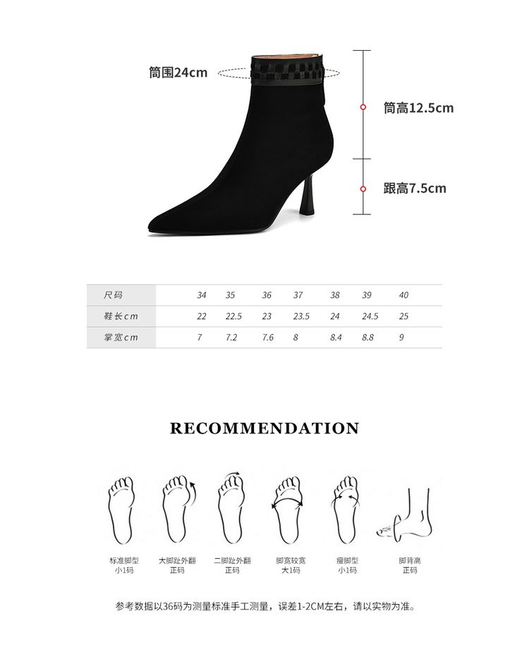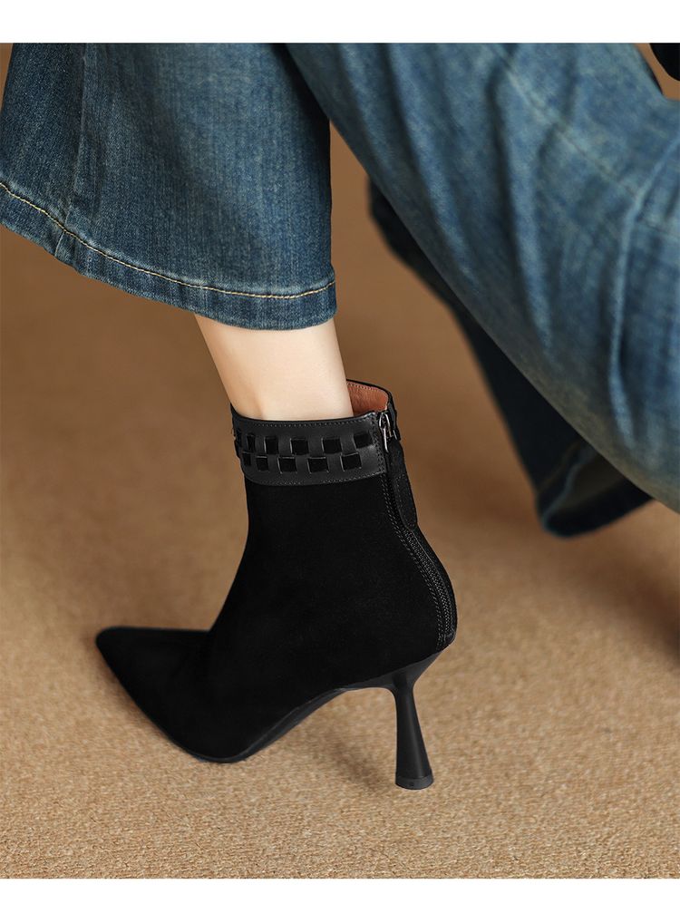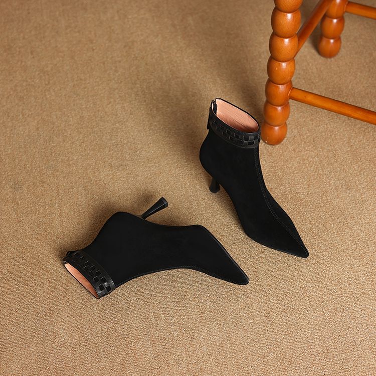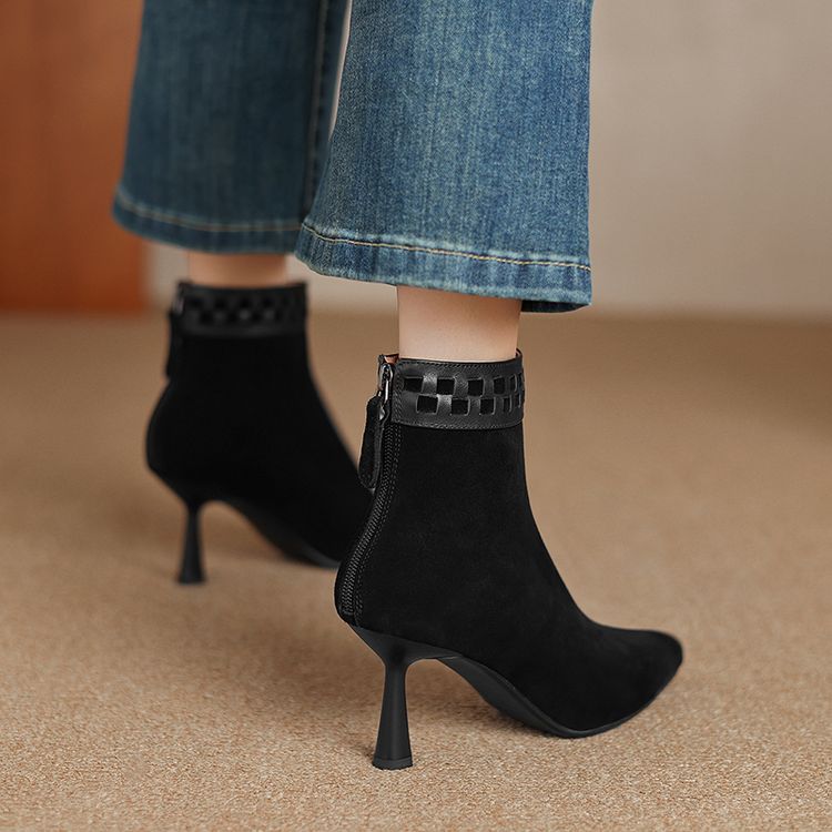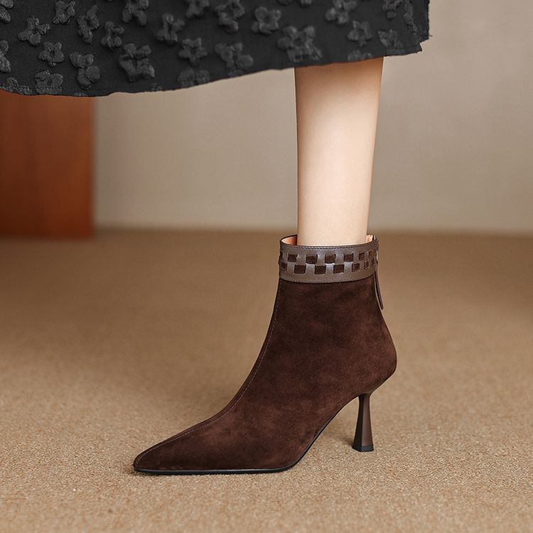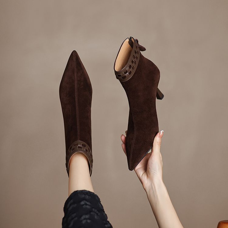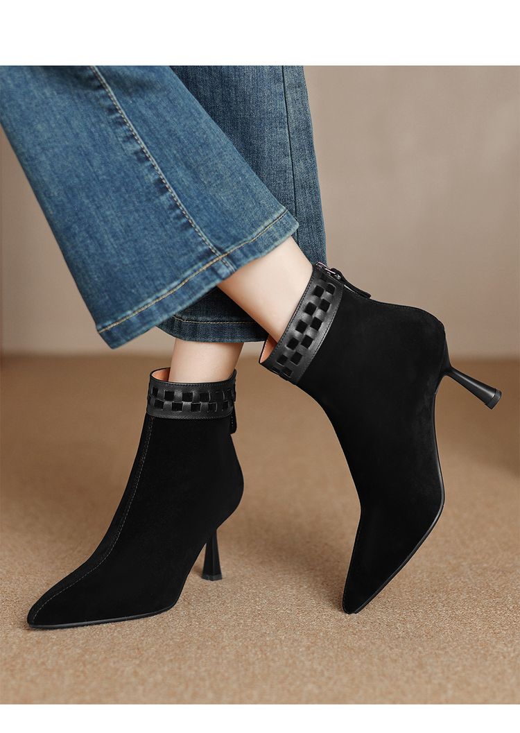 【预售5天】秋冬新款羊翻皮编织尖头瘦瘦时装靴高跟鞋配裙子加绒细跟短靴女SLLK&sl-7813