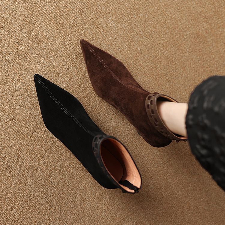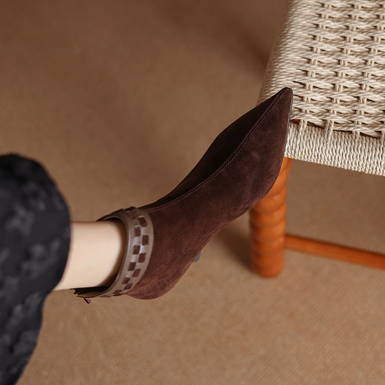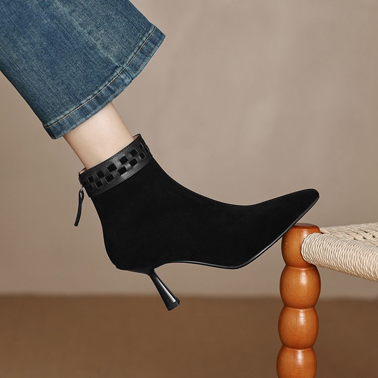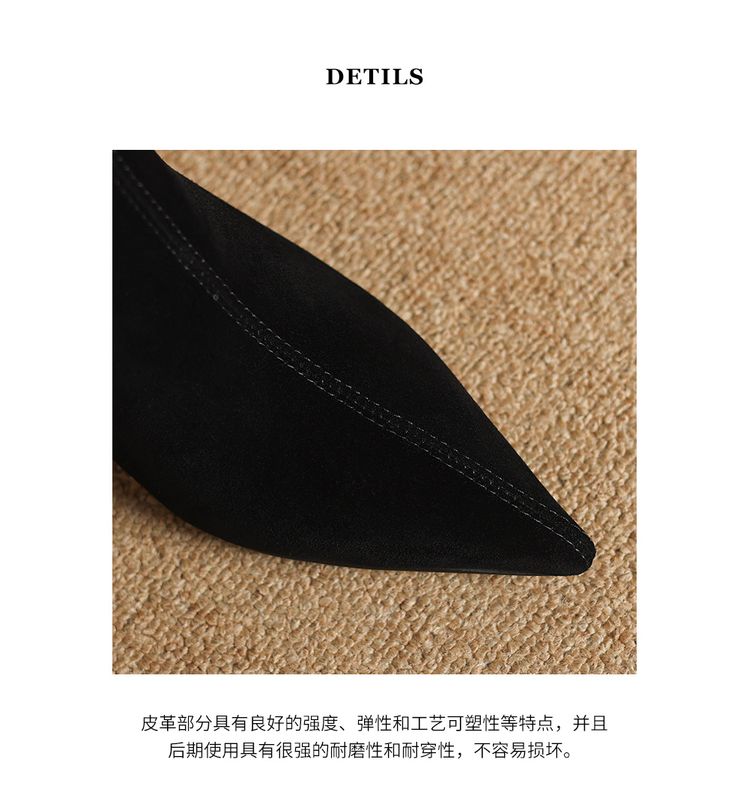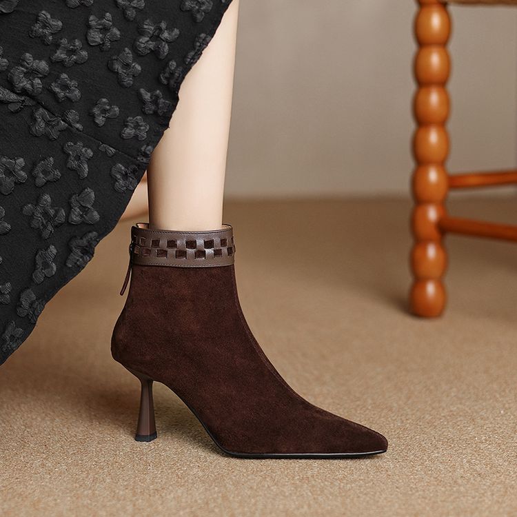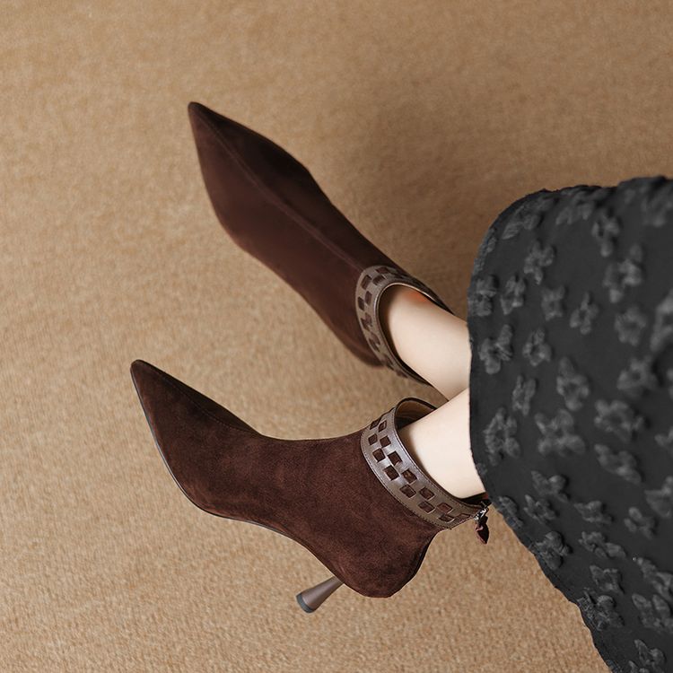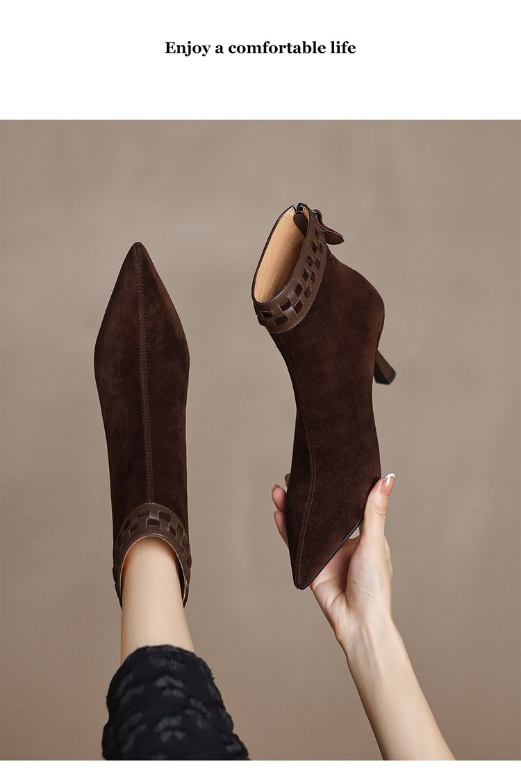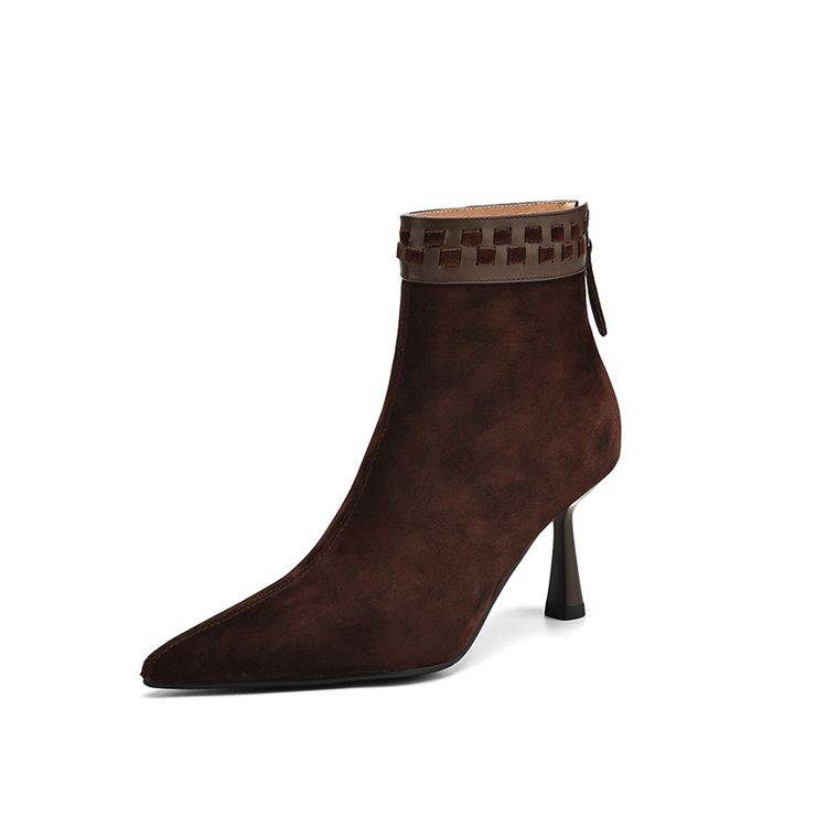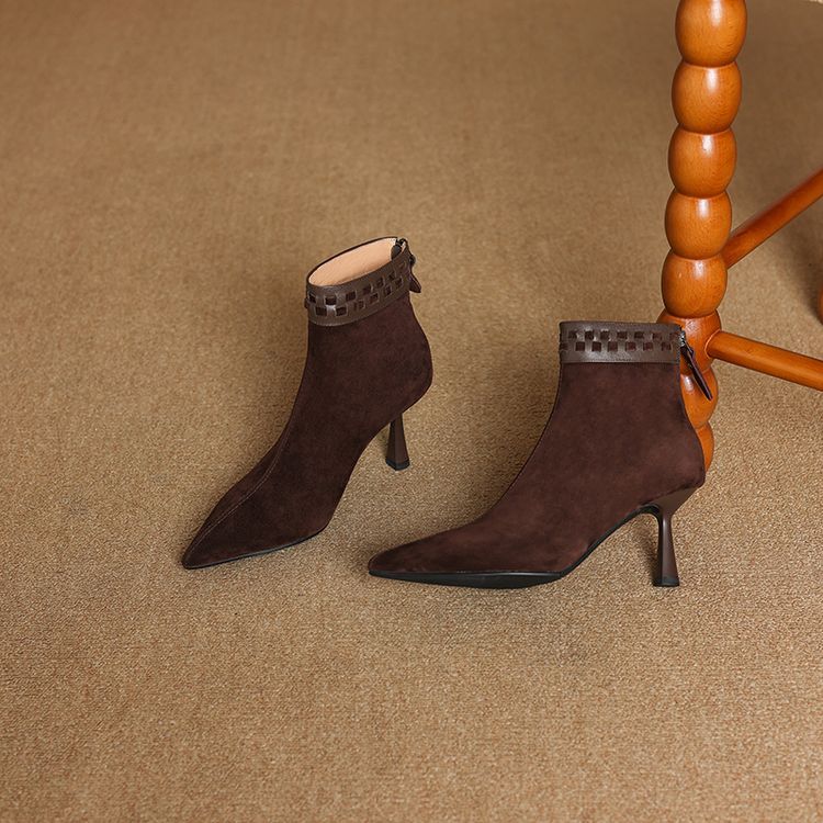 【预售5天】秋冬新款羊翻皮编织尖头瘦瘦时装靴高跟鞋配裙子加绒细跟短靴女SLLK&sl-7813