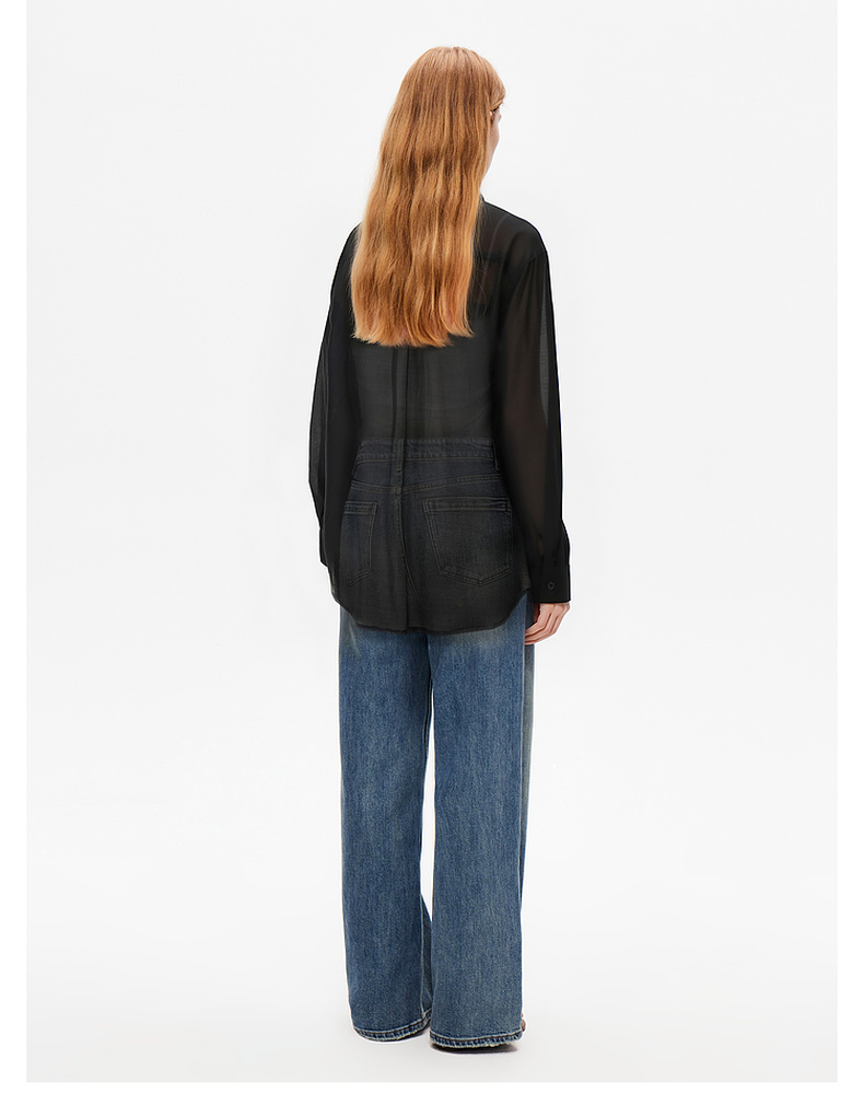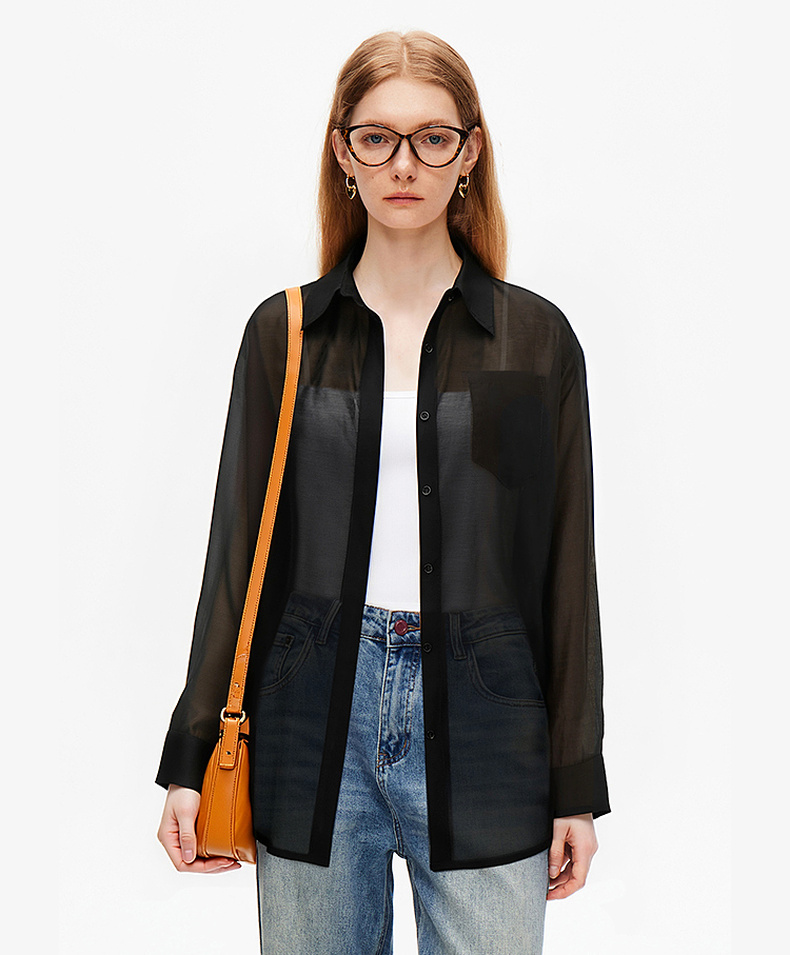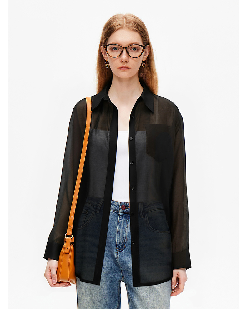 天猫同步【天丝莱赛尔】拉夏贝尔/La Chapelle莱赛尔单口袋长袖衬衫女秋季新款薄款垂感宽松休闲衬衣