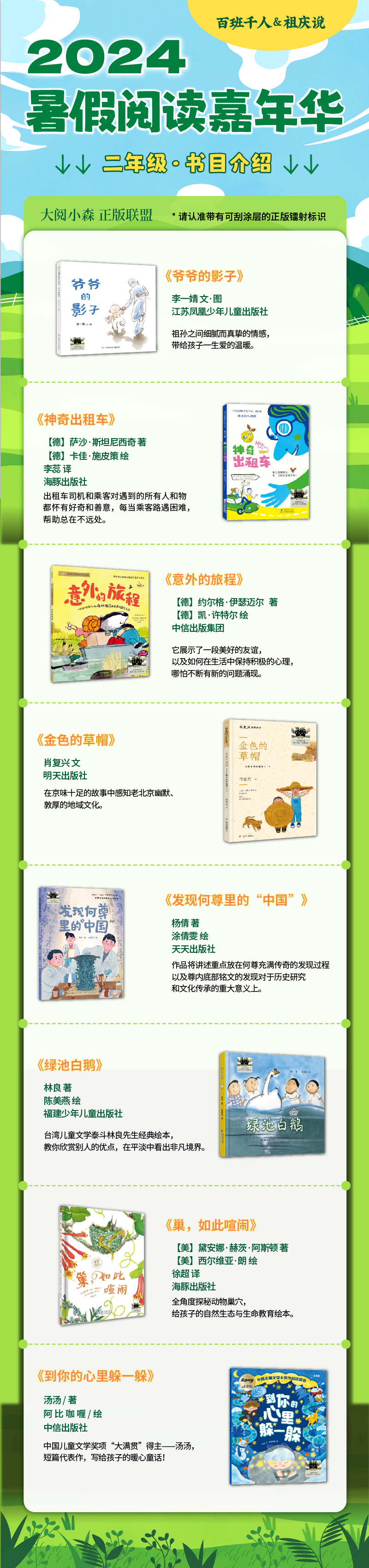 爷爷的影子 神奇出租车 意外的旅程金色的草帽 发现何尊里的”中国“ 绿池白鹅 巢,如此喧闹 到你的心里躲一躲 2024年百班千人暑期书目2年级套装8本|祖庆说名师推荐正版现货速发小学生课外阅读