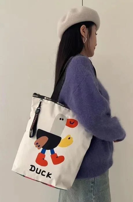 包身采用高品质织物,触感柔软舒适,还兼具耐磨抗造的特性,日常通勤、旅行出游,各种场景都能轻松hold住。拉链顺滑无阻,开合间尽享便捷,细节之处尽显匠心。内部空间规划合理,多层收纳设计,主袋能装下日常所需的书本、文件,小口袋则可以放口红、耳机等零碎小物,分类存放,找东西不再手忙脚乱。逗鸭系列托特包